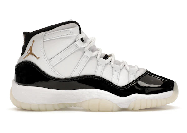 Originally launched in 1996 as the "Columbia" colorway, this Legend Blue, grade schoolsized version of the Jordan 11 Retro features a leather and mesh construction. The shiny patent leather overlays come in clean white, showing off the sneakers rounded toe and aerodynamic shape. Legend Blue details can be found on the semi-translucent rubber outsole, the Jumpman logo embroidered on the heel, and the tongue tag. In terms of technology, a carbon fiber plate runs the full length of the shoe and a Zoom Air unit provides cushioning. The back tab and collar come in black, contrasting the light Legend Blue and white.