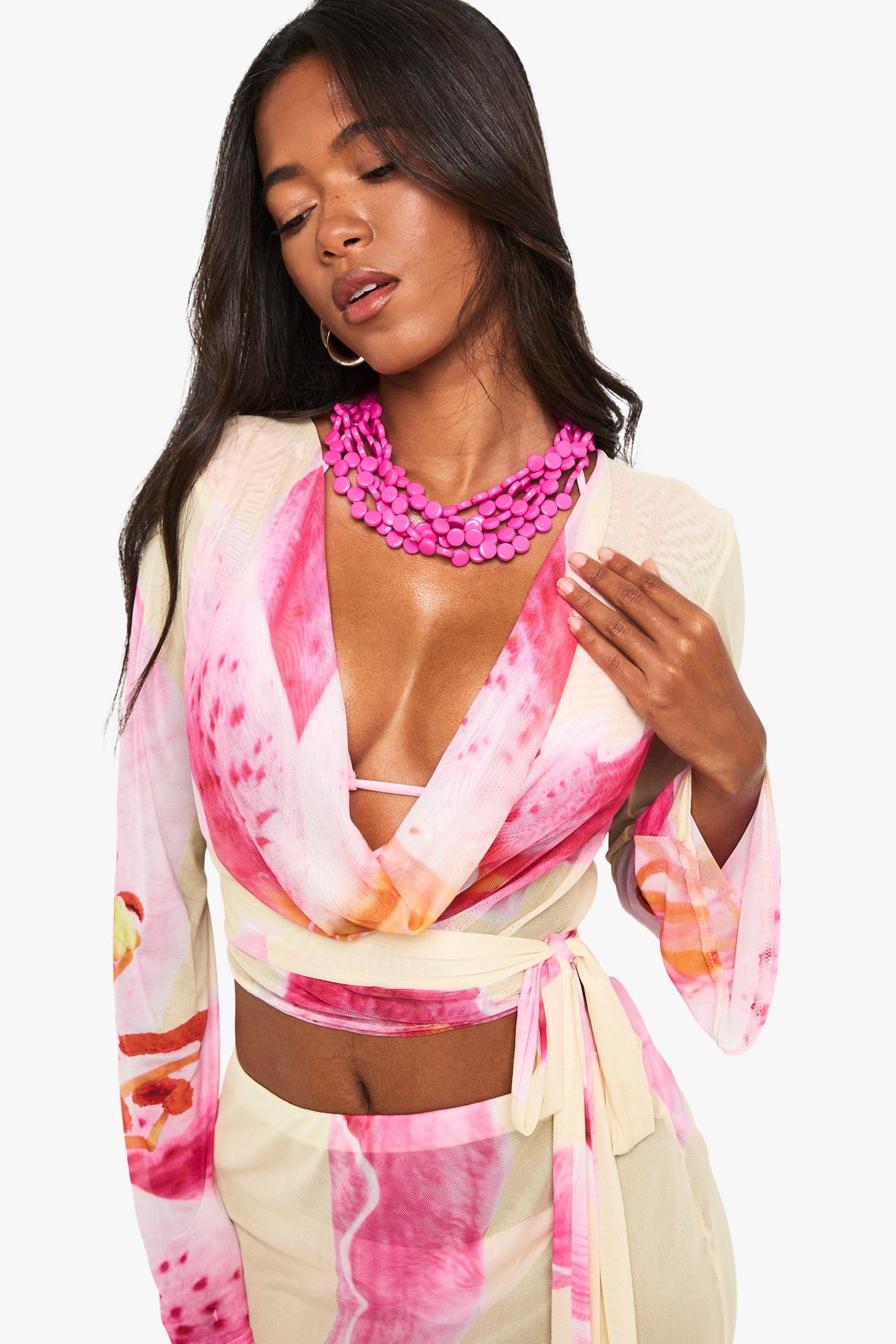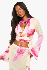 Make a statement on your next beach getaway with this striking cowl neck beach top from Boohoo. The flowing fabric creates an effortlessly chic silhouette while the wrap design allows for a customised fit to flatter your figure. Style with the matching sarong for a coordinated beach ensemble, or pair with denim shorts for a casual seaside lunch. The dramatic flared sleeves add movement and a touch of boho flair that's perfect for sunset strolls along the shore. Layer over your favourite bikini during the day, then transition to evening by adding statement jewellery and metallic sandals for beachside cocktails. This versatile piece is an essential addition to your holiday wardrobe, promising to turn heads whether you're lounging by the pool or dancing at a beach party.Discover Floral Cowl Neck Beach Top available to buy online at us.boohoo.com. Available with quick delivery and easy return options. Shop now!Discover Floral Cowl Neck Beach Top available to buy online at us.boohoo.com. Available with quick delivery and easy return options. Shop now!
