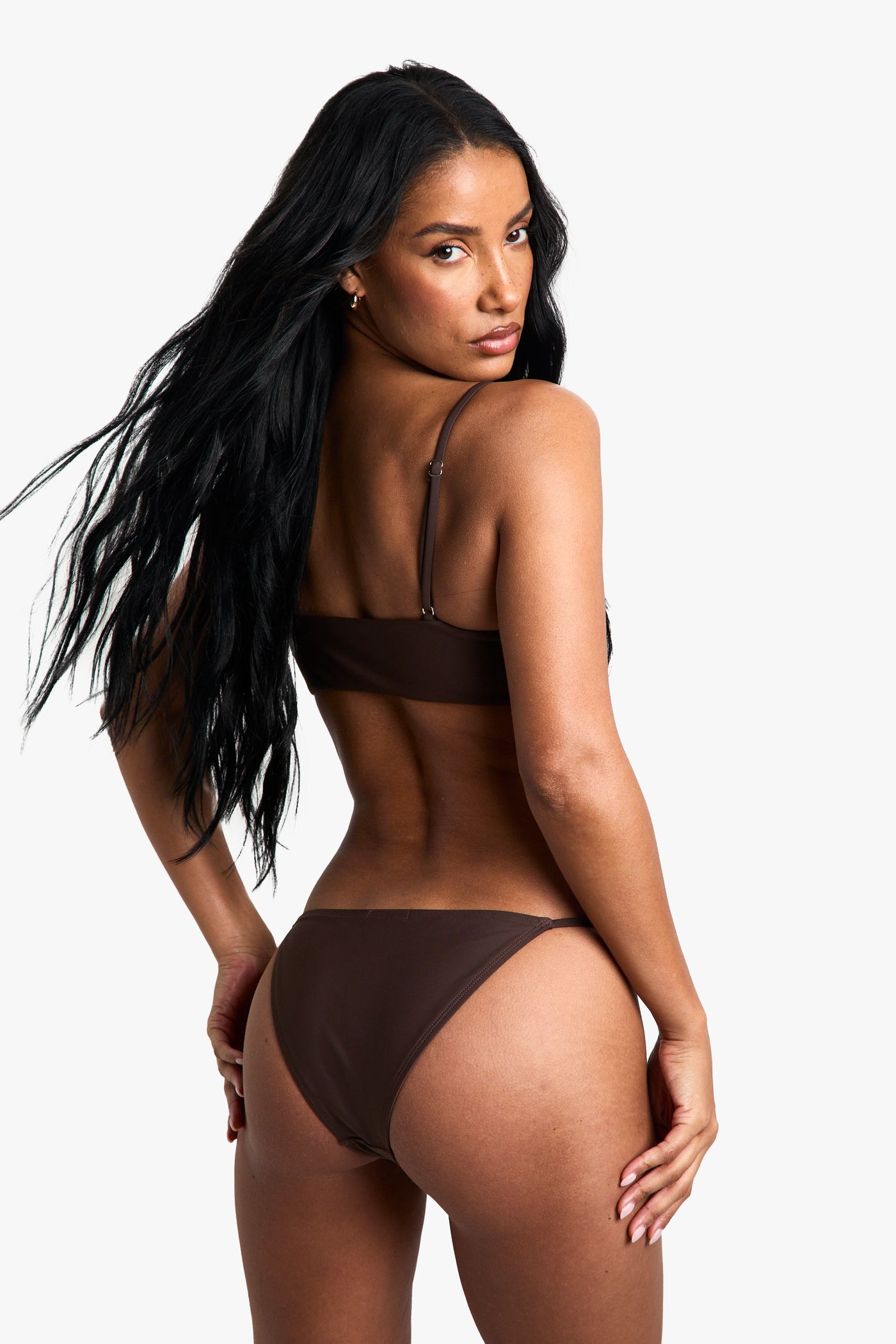 Matching low-rise bikini bottoms with a cheeky cut for a contemporary look