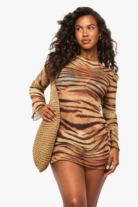 Make a statement by the shore with this bold tiger print mini dress from Boohoo. The form-fitting silhouette with clever ruched detailing creates a flattering shape that's perfect for beach days and holiday evenings alike. Style with a woven beach bag and oversized sunglasses for daytime lounging by the pool, or dress up with gold hoop earrings and strappy sandals for sunset cocktails at the beach bar. The high neckline balances the mini length beautifully, while the striking open back adds an unexpected twist when you turn around. This versatile piece transitions effortlessly from a beach cover-up to an evening outfit, making it an essential addition to your holiday wardrobe that requires minimal packing space but delivers maximum impact.Discover Tiger Print Mini Beach Dress available to buy online at us.boohoo.com. Available with quick delivery and easy return options. Shop now!Discover Tiger Print Mini Beach Dress available to buy online at us.boohoo.com. Available with quick delivery and easy return options. Shop now!