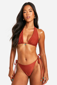 Make waves this season in our striking triangle bikini with eye-catching detail. The classic halterneck design features a distinctive centre embellishment that catches the light as you lounge poolside. Adjustable ties at the neck and back allow for the perfect fit, whilst the ruched detailing adds texture and dimension. The matching bottoms with side ties and beaded accents create a cohesive look that's both stylish and practical. Perfect for your next getaway, this bikini pairs beautifully with oversized sunglasses and a lightweight kimono for trips to the beach bar. When the sun sets, throw on a flowing maxi skirt and statement earrings for evening drinks by the sea. This versatile two-piece is an essential addition to your holiday wardrobe.Discover Turquoise Stone Trim Triangle Bikini Top & Tie Side Bikini Bottoms Set available to buy online at us.boohoo.com. Available with quick delivery and easy return options. Shop now!Discover Turquoise Stone Trim Triangle Bikini Top & Tie Side Bikini Bottoms Set available to buy online at us.boohoo.com. Available with quick delivery and easy return options. Shop now!