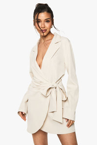 Sophisticated draped wrap blazer dress with elegant lapel detailing