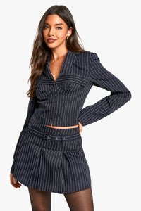 Make a bold statement with this kurzer Nadelstreifen Korsett-Blazer from Boohoo. This versatile piece effortlessly bridges the gap between casual cool and polished elegance. The corset-inspired design creates a figure-hugging silhouette, while the classic pinstripe pattern adds a touch of timeless sophistication. Style it with the matching mini skirt and chunky boots for an edgy daytime look, or pair it with tailored trousers and heels for a more refined ensemble. Perfect for everything from casual brunches to evening drinks with friends, this blazer is a must-have addition to any fashion-forward wardrobe. Its cropped length makes it ideal for showcasing high-waisted bottoms, allowing you to create a variety of on-trend outfits. Embrace your inner fashionista and let this striking blazer be the centrepiece of your next head-turning look.Discover Pinstripe Corset Cropped Blazer available to buy online at us.boohoo.com. Available with quick delivery and easy return options. Shop now!Discover Pinstripe Corset Cropped Blazer available to buy online at us.boohoo.com. Available with quick delivery and easy return options. Shop now!