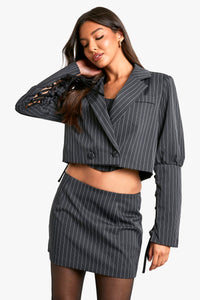 Cropped pinstripe blazer with unique lace-up sleeve detail