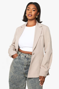 Make a statement with this chic plus-size blazer, perfect for the fashion-forward woman who loves to stay on-trend. The single-button fastening creates a flattering shape, while the notched lapels add a touch of sophistication. Style this versatile piece for a night out by pairing it with a crop top and high-waisted jeans for an effortlessly cool look. For a more casual daytime ensemble, throw it over a simple tee and wide-leg trousers. The structured shoulders and button cuff details elevate this blazer, making it a go-to item for both work and play. Whether you're heading to drinks with friends or attending a semi-formal event, this blazer will help you radiate confidence and style.Discover Plus Woven Tailored Self Fabric Button Detail Blazer available to buy online at us.boohoo.com. Available with quick delivery and easy return options. Shop now!Discover Plus Woven Tailored Self Fabric Button Detail Blazer available to buy online at us.boohoo.com. Available with quick delivery and easy return options. Shop now!