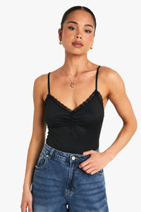 This ultra-soft bodysuit combines comfort with style, featuring a beautifully gathered bust and delicate lace trim that adds a touch of elegance to your everyday wardrobe. The sleek design creates a smooth foundation for countless outfits, whether paired with high-waisted jeans for a casual coffee date or styled with wide-leg trousers and a blazer for a more polished look. The bodysuit's form-fitting silhouette flatters your figure whilst the adjustable straps ensure the perfect fit. Ideal for family gatherings or casual outings, this versatile piece transitions effortlessly from day to night. Complete the look with your favourite denim, trainers and layered jewellery for an effortlessly chic ensemble that's both comfortable and stylish.Discover Super Soft Lace Trim Ruched Bust Cami Bodysuit available to buy online at us.boohoo.com. Available with quick delivery and easy return options. Shop now!Discover Super Soft Lace Trim Ruched Bust Cami Bodysuit available to buy online at us.boohoo.com. Available with quick delivery and easy return options. Shop now!