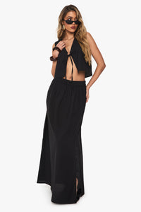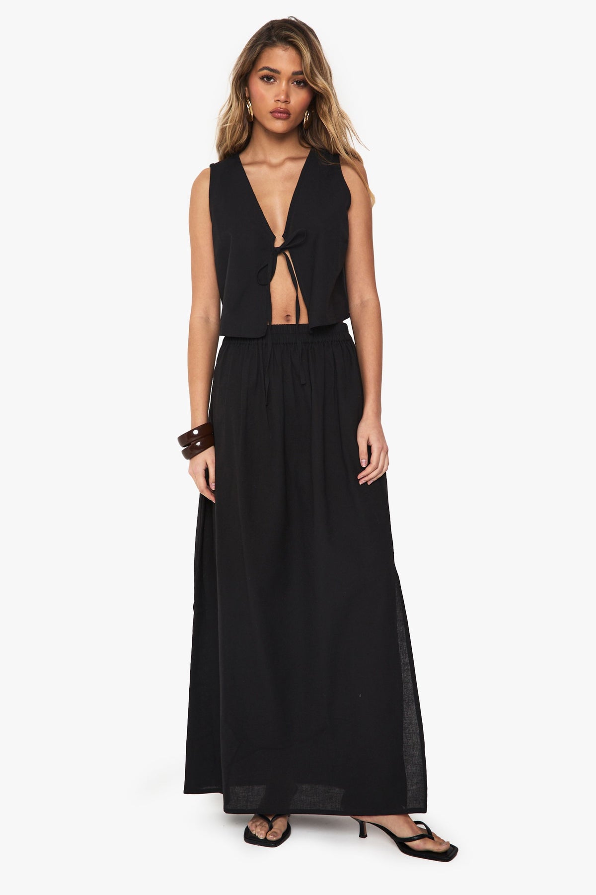 Striking two-piece set featuring a lace-up crop top and flowing maxi skirt in linen-look fabric