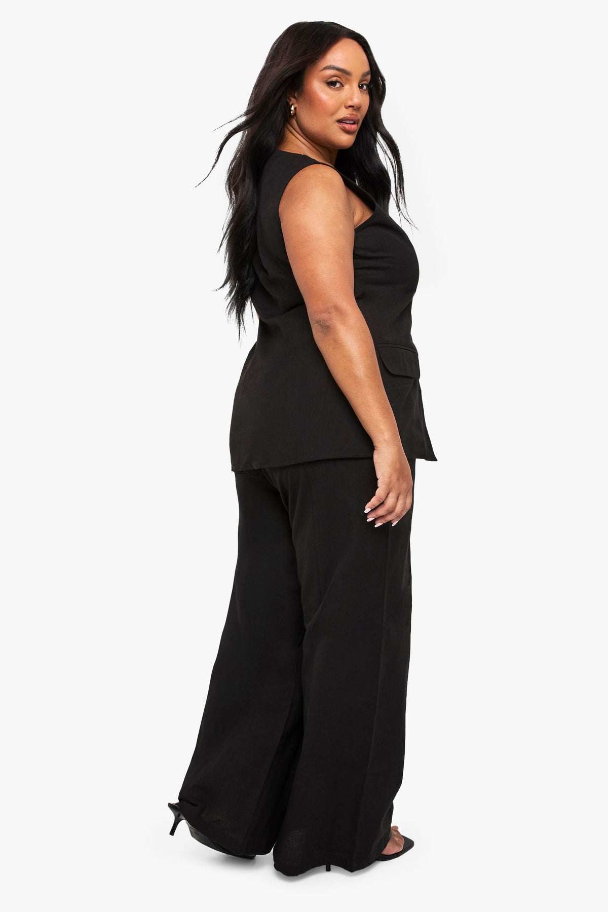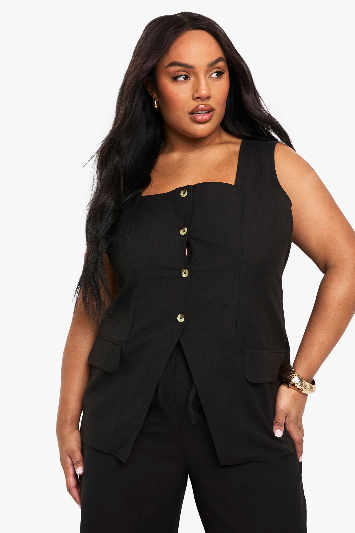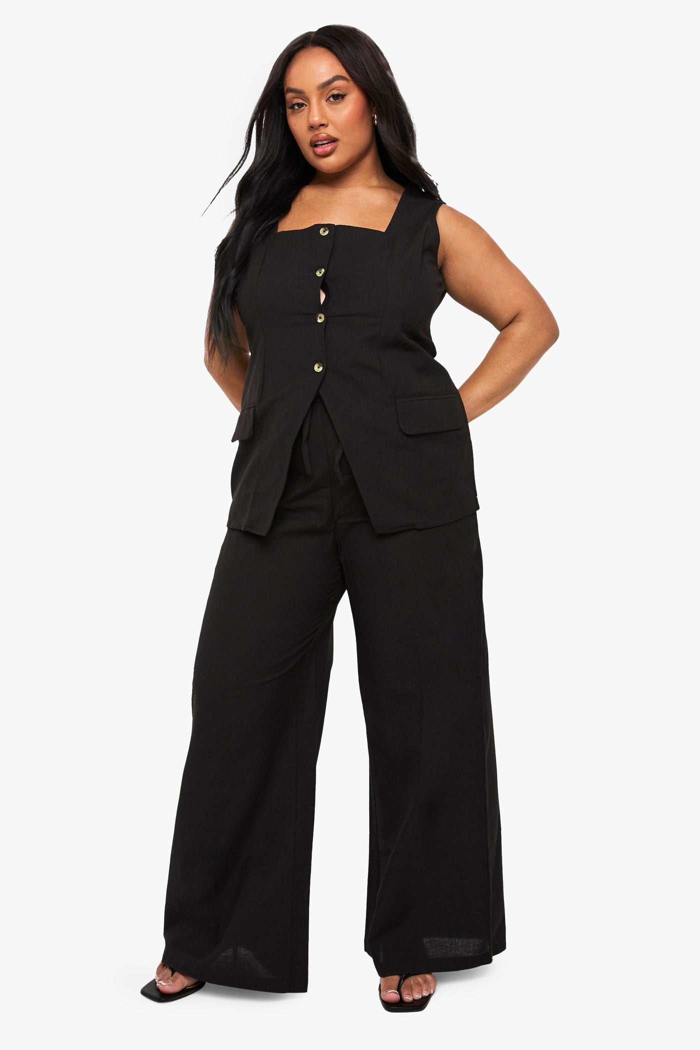 Plus Linen Look Square Neck Waistcoat And Tailored Wide Leg Trouser Co-Ord