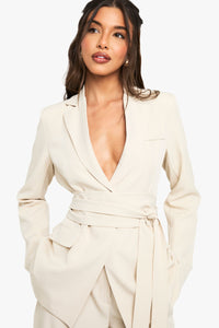 Sophisticated blazer featuring a flattering wrap design with tie belt detail