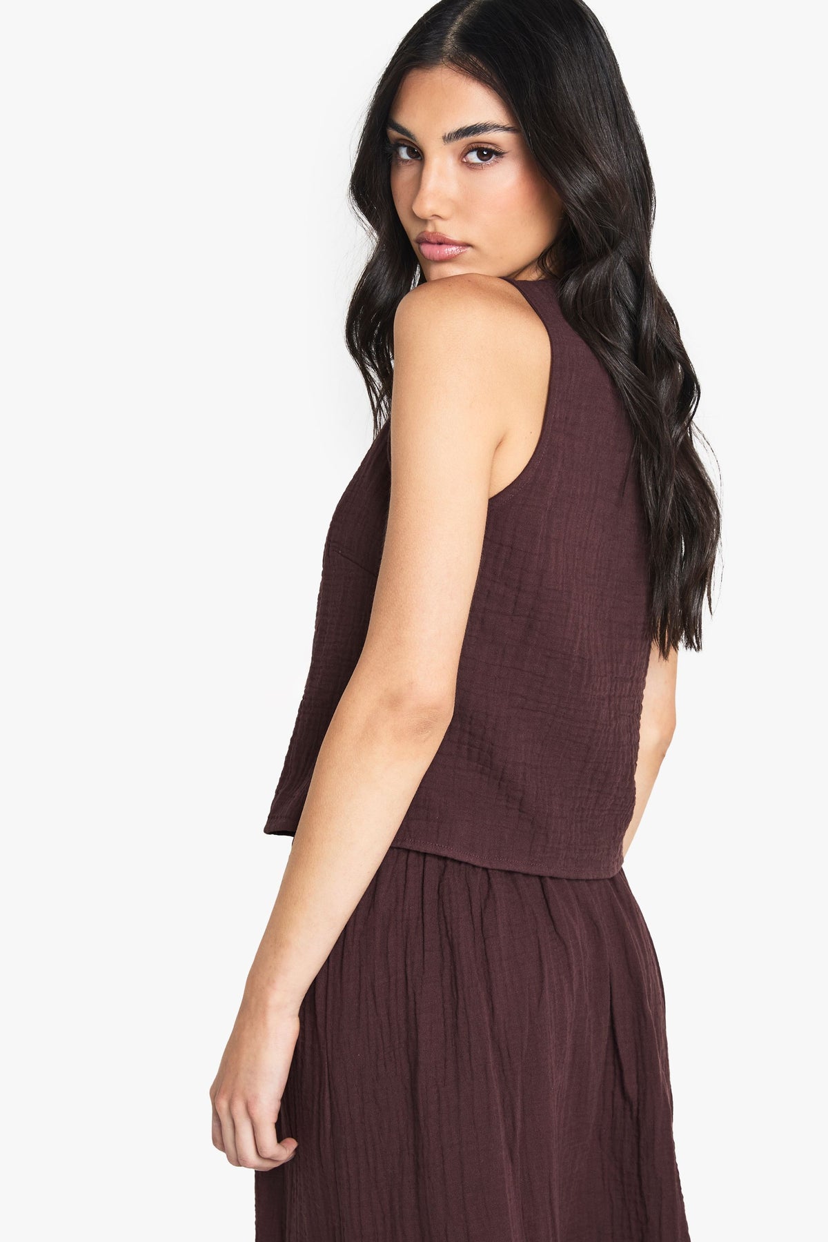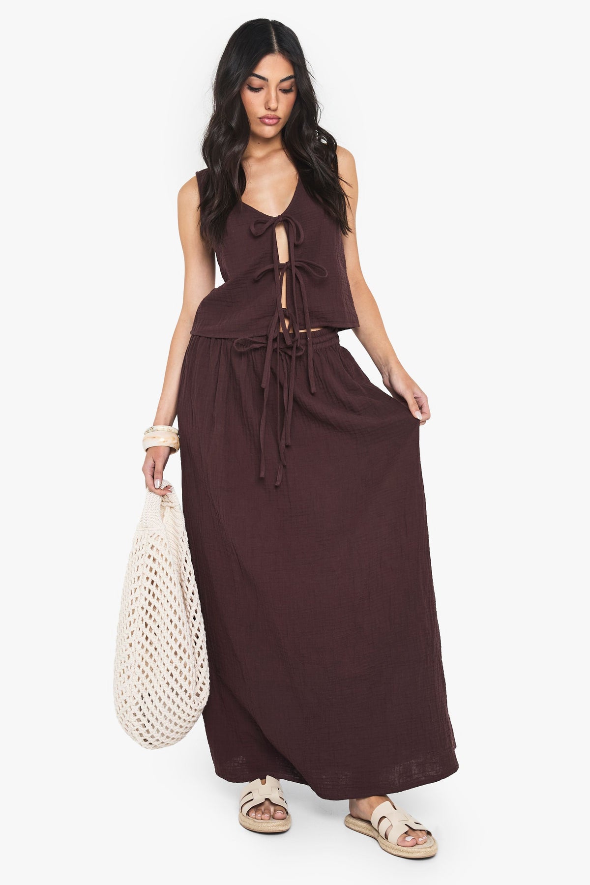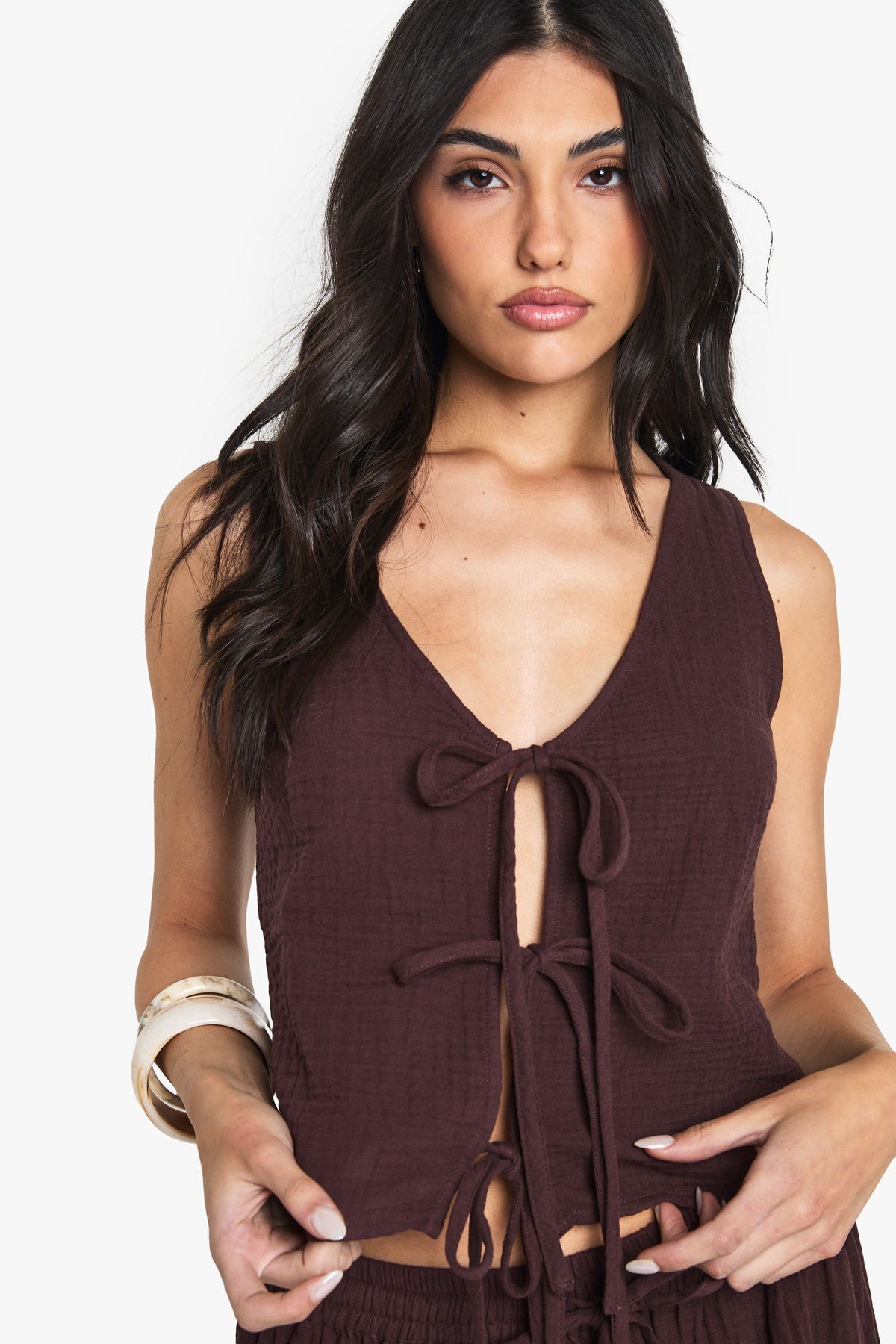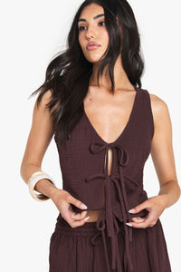This charming sleeveless top showcases the natural texture of cheesecloth fabric, creating a relaxed bohemian vibe that's perfect for your casual wardrobe. The front tie fastenings allow you to customise your look, whether loosely tied for a more relaxed feel or secured for a more defined silhouette. Style with the matching maxi skirt as shown for a coordinated summer ensemble, or pair with your favourite denim shorts and sandals for daytime outings. The versatile design works brilliantly for family gatherings, weekend brunches or casual garden parties. Complete the look with simple bangles and a woven tote bag for an effortlessly stylish finish that captures that carefree summer spirit. Machine washable for easy care, this Boohoo piece delivers on both style and practicality.Discover Cheesecloth Tie Front Sleeveless Top available to buy online at us.boohoo.com. Available with quick delivery and easy return options. Shop now!Discover Cheesecloth Tie Front Sleeveless Top available to buy online at us.boohoo.com. Available with quick delivery and easy return options. Shop now!