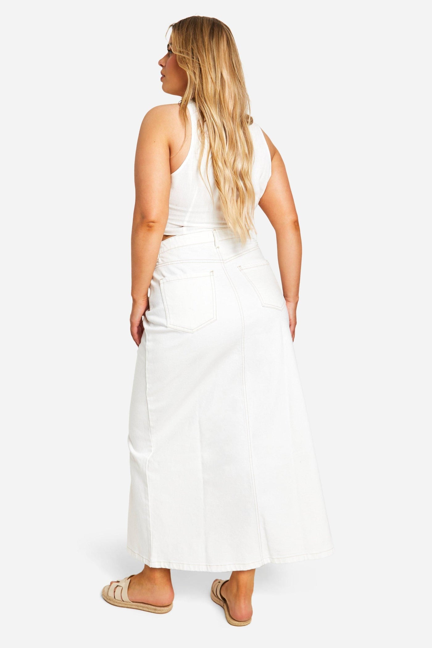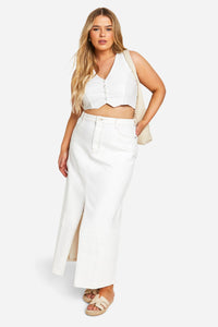 Make a bold statement with this striking maxi denim skirt, perfect for the fashion-forward woman who loves to stand out. The high-waisted design accentuates your curves, while the daring side slit adds a touch of allure to your look. Pair it with a cropped top, as shown, for a trendy ensemble that's sure to turn heads at your next casual gathering. The versatile nature of this skirt allows for endless styling options - dress it down with trainers and a graphic tee for a laid-back brunch, or style it with a tucked-in blouse and strappy sandals for a chic garden party look. The timeless denim fabric ensures this piece will remain a staple in your wardrobe for seasons to come, offering both comfort and style for various casual events and family gatherings.Discover Plus Ecru Denim Split Front Maxi Skirt available to buy online at us.boohoo.com. Available with quick delivery and easy return options. Shop now!Discover Plus Ecru Denim Split Front Maxi Skirt available to buy online at us.boohoo.com. Available with quick delivery and easy return options. Shop now!