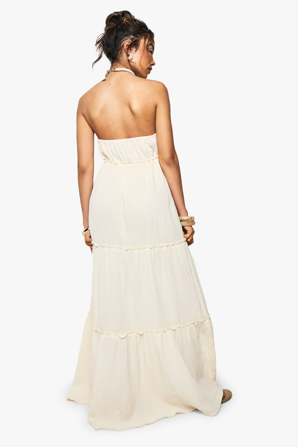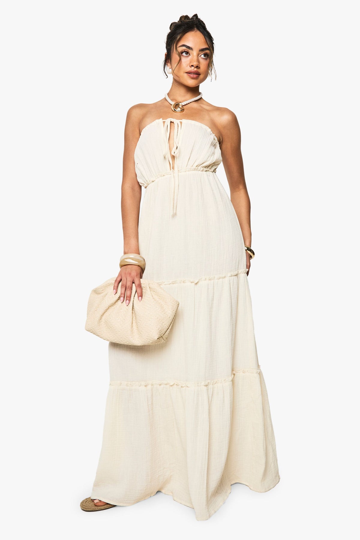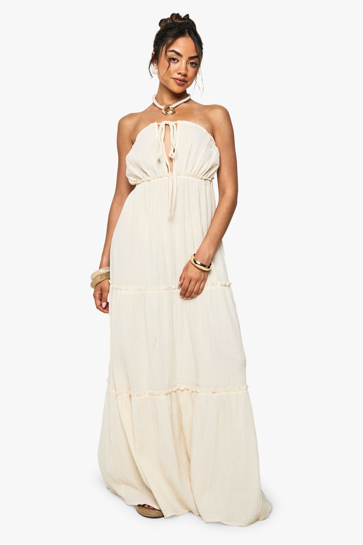 This breezy Crinkle Cotton Strappy Tiered Maxi Dress from Boohoo embodies carefree summer style with its flowing silhouette and textured fabric. The tiered design creates beautiful movement as you walk, while the strappy open back adds a touch of subtle allure. Style with flat sandals and a woven tote bag for daytime gatherings, or dress it up with layered gold jewellery and espadrille wedges for sunset drinks. Perfect for garden parties, beach holidays or casual weekend brunches, this versatile maxi dress works beautifully with a denim jacket for cooler evenings. The adjustable tie detail at the neckline allows you to customise the fit to your preference, making this an essential addition to your warm-weather wardrobe.Discover Crinkle Cotton Strappy Tiered Maxi Dress available to buy online at us.boohoo.com. Available with quick delivery and easy return options. Shop now!Discover Crinkle Cotton Strappy Tiered Maxi Dress available to buy online at us.boohoo.com. Available with quick delivery and easy return options. Shop now!