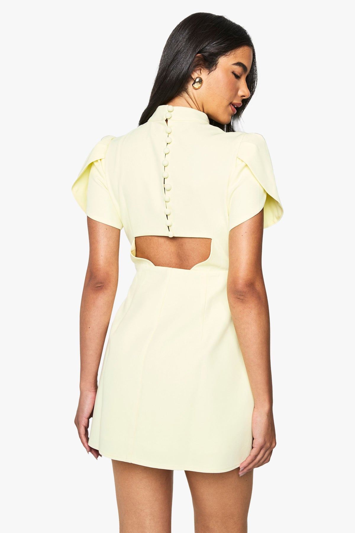 Striking cut-out back detail with button fastening adds unexpected allure