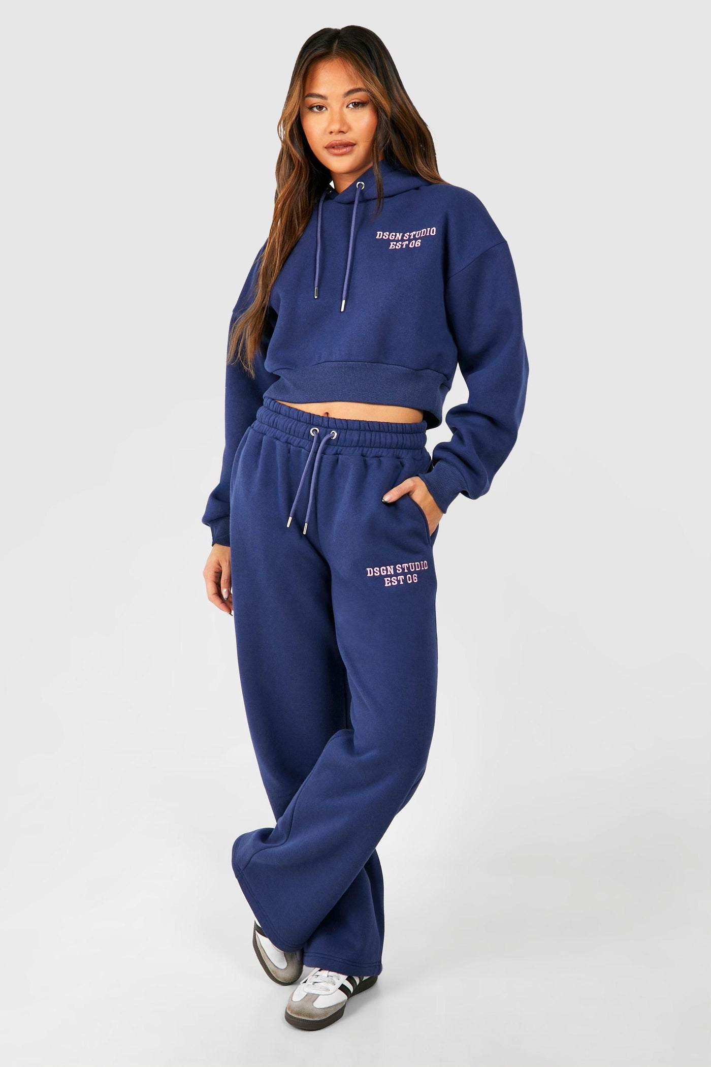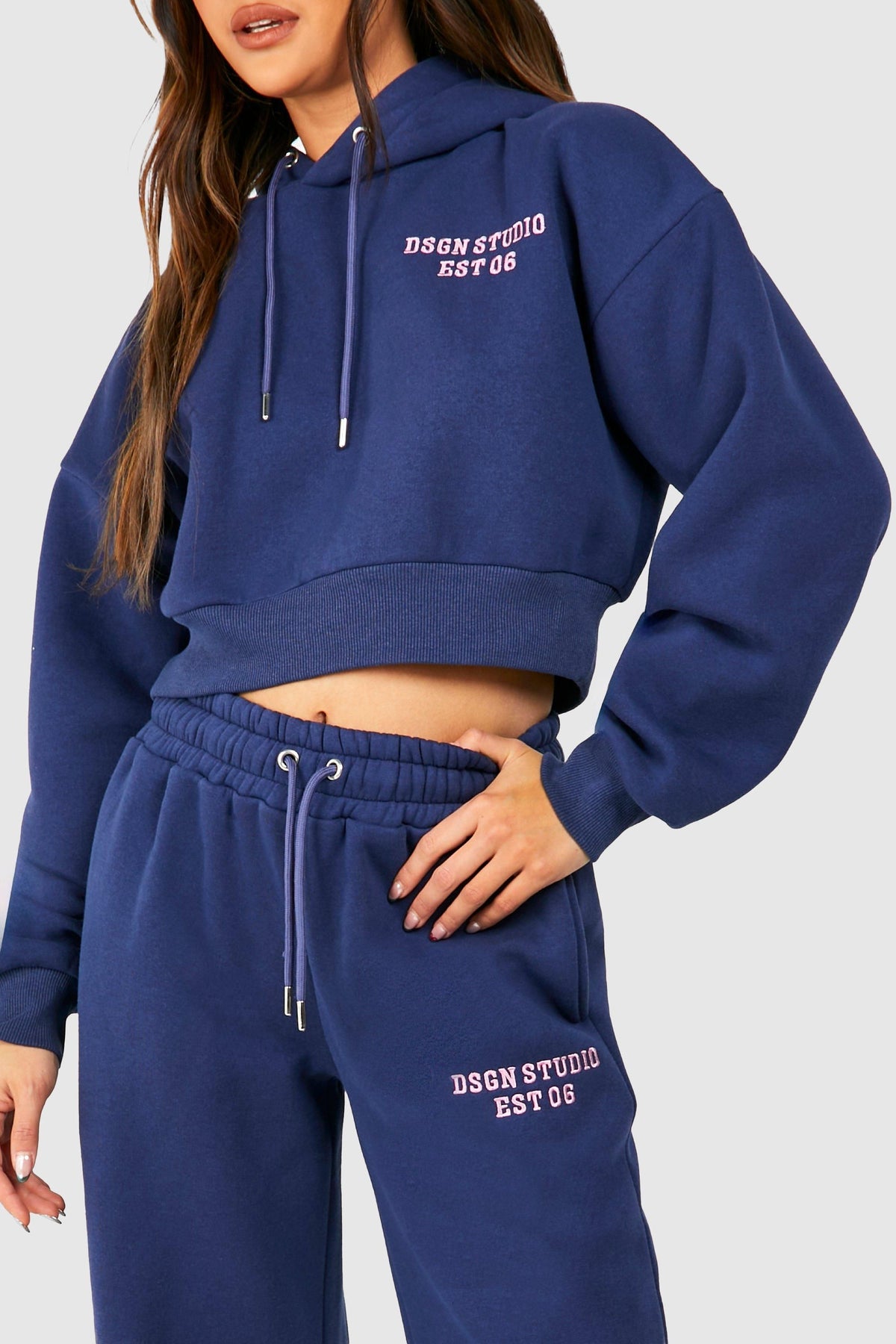 Embrace laid-back chic with this short tracksuit featuring Dsgn Studio embroidery. The cropped hoodie and wide-leg trousers create a trendy silhouette that's perfect for casual outings. Style it with white trainers for a classic athleisure look, or dress it up with chunky boots and statement jewellery for a fashion-forward ensemble. Ideal for weekend brunches, casual shopping trips, or cosy nights in with friends. The fleece-back fabric ensures comfort, while the drawstring waistband allows for a customised fit. This versatile set is a must-have for the fashion-conscious woman who values both style and comfort in her everyday wardrobe.Discover DSGN Studio Embroidered Cropped Hooded Tracksuit available to buy online at us.boohoo.com. Available with quick delivery and easy return options. Shop now!Discover DSGN Studio Embroidered Cropped Hooded Tracksuit available to buy online at us.boohoo.com. Available with quick delivery and easy return options. Shop now!