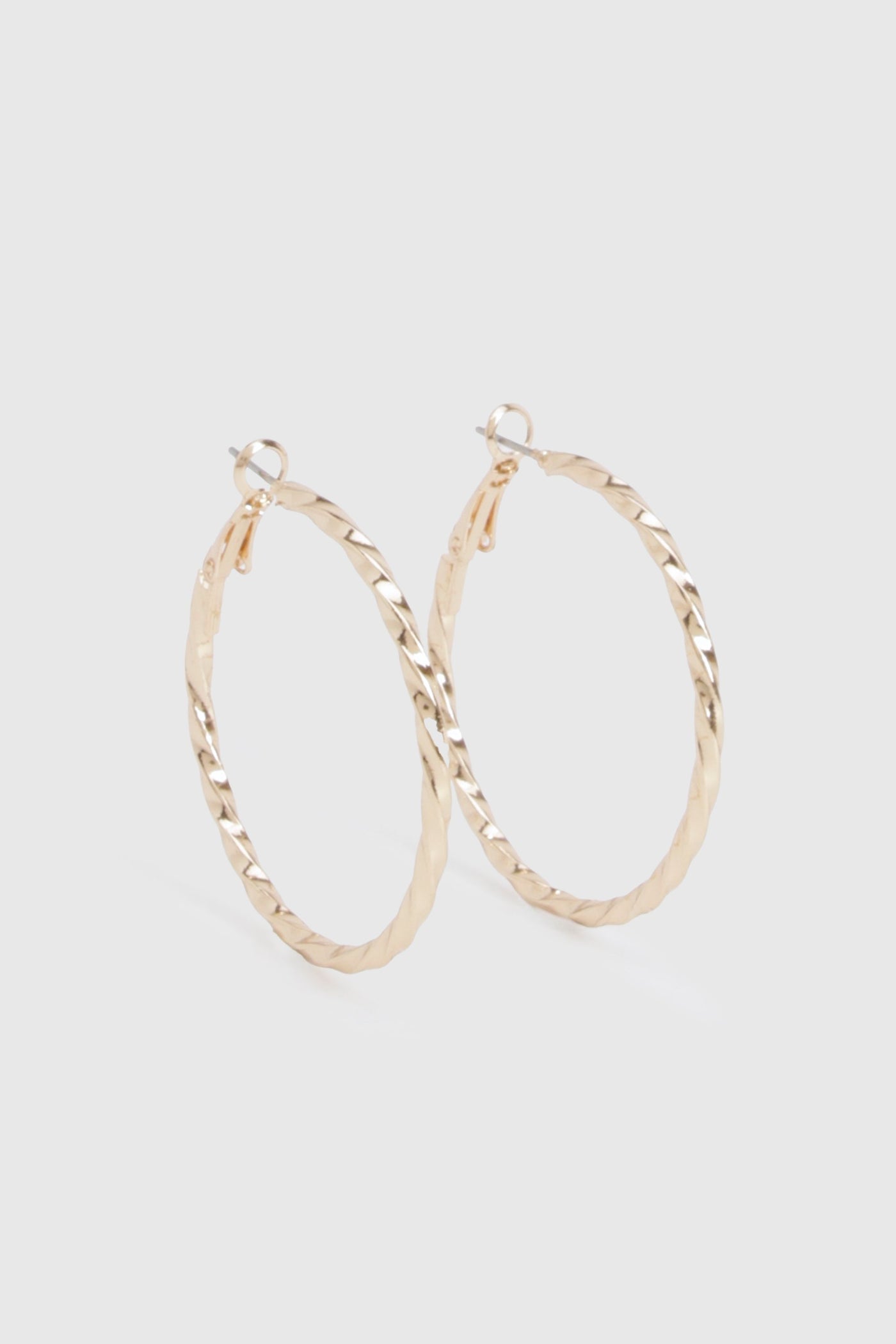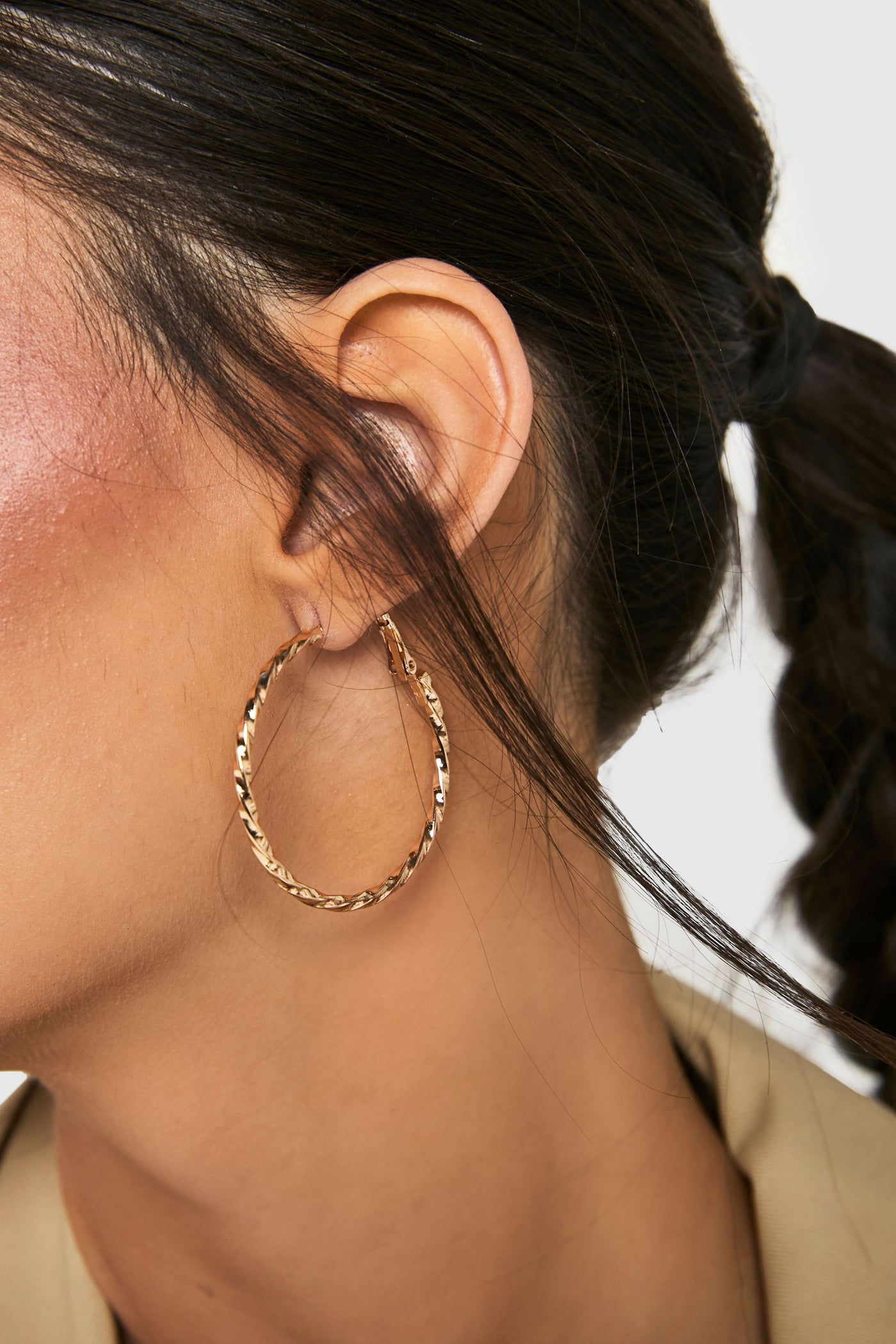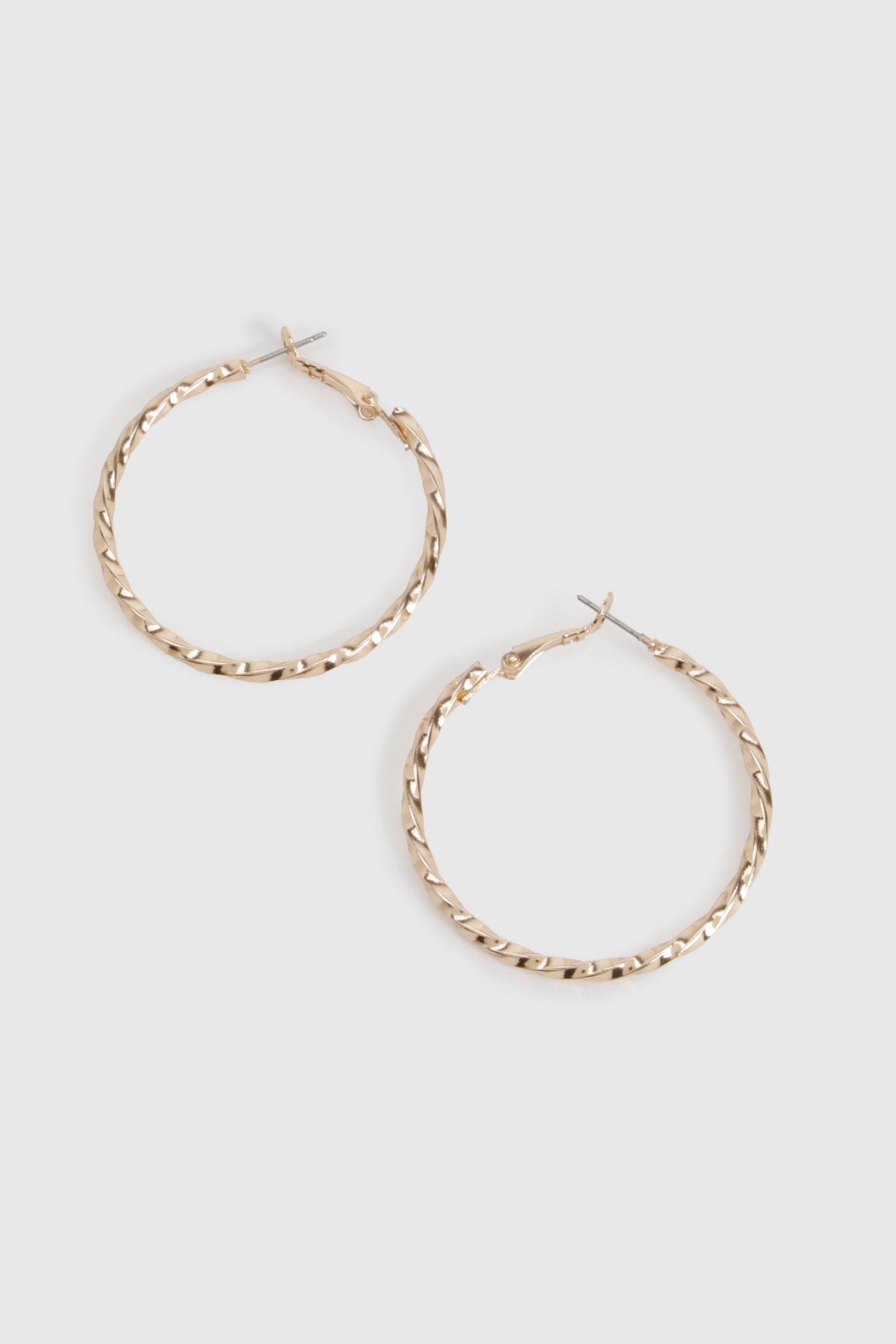 These eye-catching textured hoops bring instant glamour to any ensemble. The decorative pattern catches the light as you move, adding a subtle sparkle to your look without overwhelming it. Perfect for transitioning from day to night, these versatile earrings complement both casual and dressier outfits. Style with a sleek ponytail as shown to showcase their beautiful design, or let them peek through loose waves for a more relaxed feel. Pair with a simple blouse for daytime casual events, or match with your favourite little black dress for evening gatherings. These hoops work brilliantly with other gold-toned accessories for a coordinated look, or can stand alone as your statement piece. A true wardrobe essential that brings polish to any outfit.Discover Gold Twisted Hoop Earrings available to buy online at us.boohoo.com. Available with quick delivery and easy return options. Shop now!Discover Gold Twisted Hoop Earrings available to buy online at us.boohoo.com. Available with quick delivery and easy return options. Shop now!