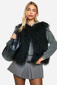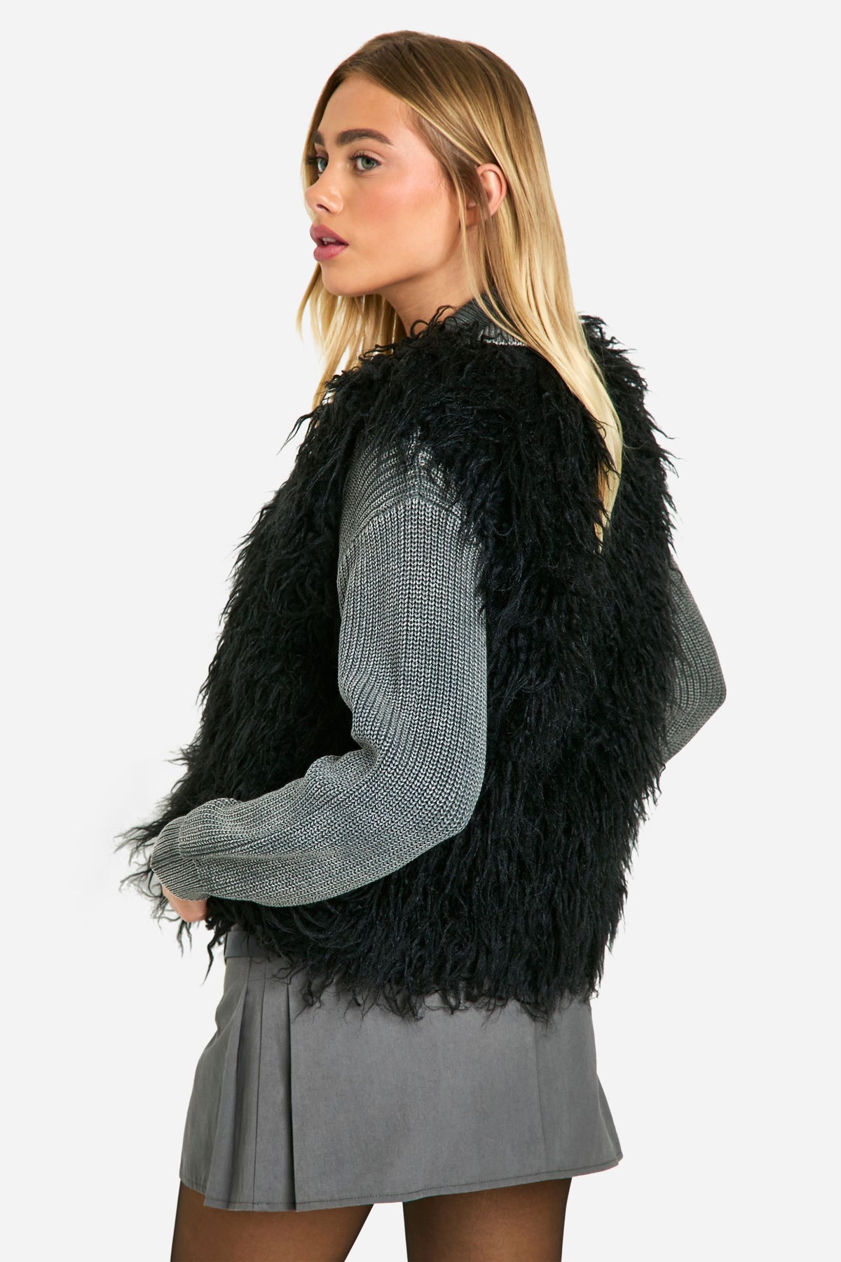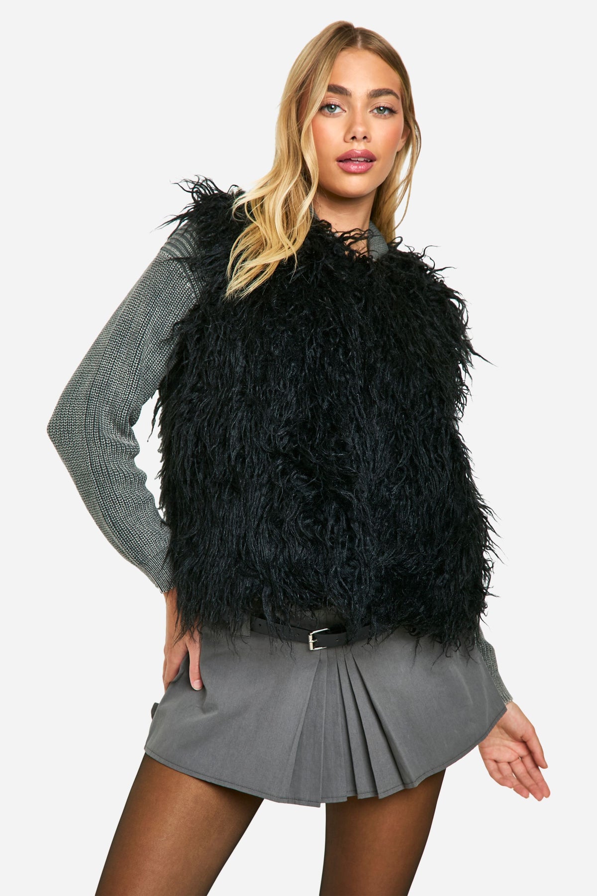 Make a striking impression with this eye-catching faux fur gilet. Perfect for adding a touch of glamour to your everyday ensembles, this versatile piece can be styled for various occasions. Layer it over a ribbed jumper and pleated mini skirt for a chic daytime look, or throw it on over a sleek bodycon dress for a night out with the girls. The cropped length works wonderfully with high-waisted trousers or skirts, creating a flattering silhouette. For a more casual vibe, pair it with your favourite jeans, a simple tee, and ankle boots. This gilet is ideal for transitional weather, offering warmth without bulk. Whether you're heading to a family gathering or a casual brunch with friends, this faux fur vest will ensure you stand out from the crowd while staying cosy and stylish.Discover Faux Mongolian Fur Gilet available to buy online at us.boohoo.com. Available with quick delivery and easy return options. Shop now!Discover Faux Mongolian Fur Gilet available to buy online at us.boohoo.com. Available with quick delivery and easy return options. Shop now!