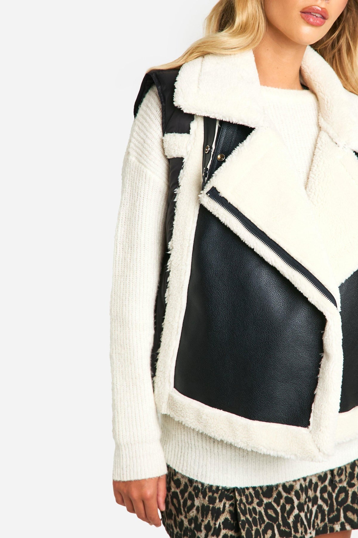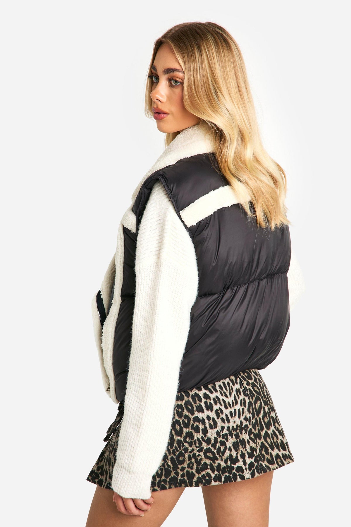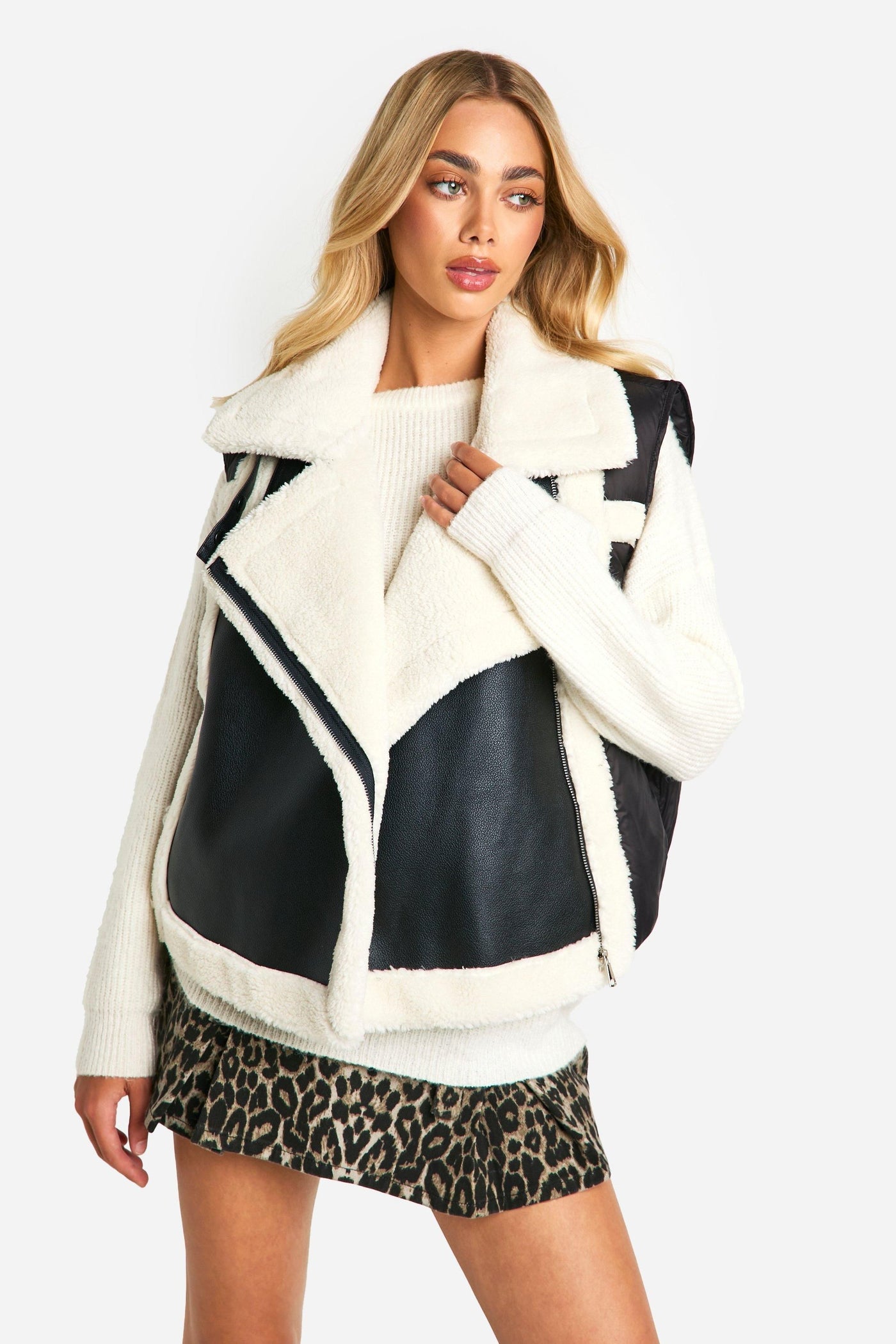 Make a bold statement with this eye-catching Flieger-Weste from Boohoo. This sleeveless jacket combines comfort and style, featuring a plush white trim that beautifully contrasts with the sleek dark panels. The oversized collar not only adds warmth but also creates a dramatic silhouette. Perfect for the fashion-forward woman who loves to stand out, this vest can be styled for various casual occasions. Layer it over a chunky knit jumper and pair with the leopard print mini skirt as seen on the model for a daring daytime look. Alternatively, throw it over a simple black dress and ankle boots for an effortlessly cool evening ensemble. The padded construction ensures you stay warm without compromising on style, making this Flieger-Weste a versatile addition to your autumn and winter wardrobe.Discover Pannelled Aviator Gilet available to buy online at us.boohoo.com. Available with quick delivery and easy return options. Shop now!Discover Pannelled Aviator Gilet available to buy online at us.boohoo.com. Available with quick delivery and easy return options. Shop now!