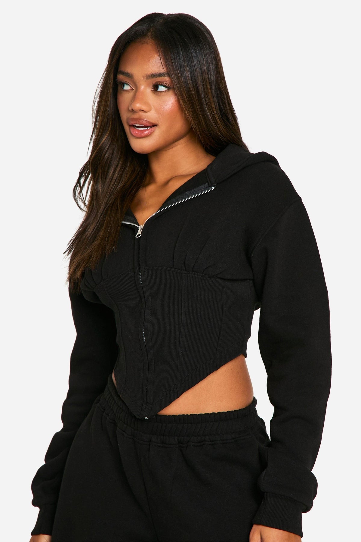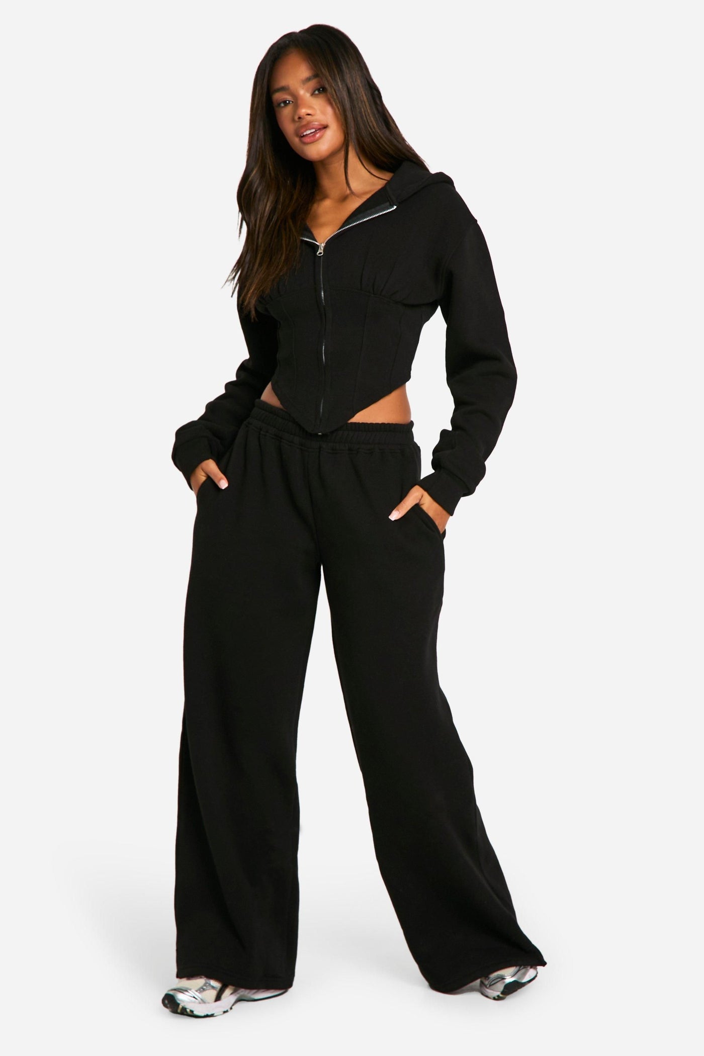 Embrace casual chic with this ribbed corset-style tracksuit. The zip-up hoodie features a trendy cropped silhouette, perfect for showcasing your midriff or layering over a vest top. Paired with wide-leg trousers, this set offers both comfort and style for your everyday adventures. Ideal for casual outings, family gatherings, or lounging at home, it's a versatile addition to your wardrobe. Style it with trainers for a laid-back look, or dress it up with chunky boots and statement jewellery for a night out with friends. The coordinated set takes the guesswork out of outfit planning, allowing you to look put-together with minimal effort. Whether you're running errands or meeting up for a casual brunch, this tracksuit will keep you looking fashionable and feeling comfortable all day long.Discover Corset Rib Insert Zip Through Hooded Tracksuit available to buy online at us.boohoo.com. Available with quick delivery and easy return options. Shop now!Discover Corset Rib Insert Zip Through Hooded Tracksuit available to buy online at us.boohoo.com. Available with quick delivery and easy return options. Shop now!