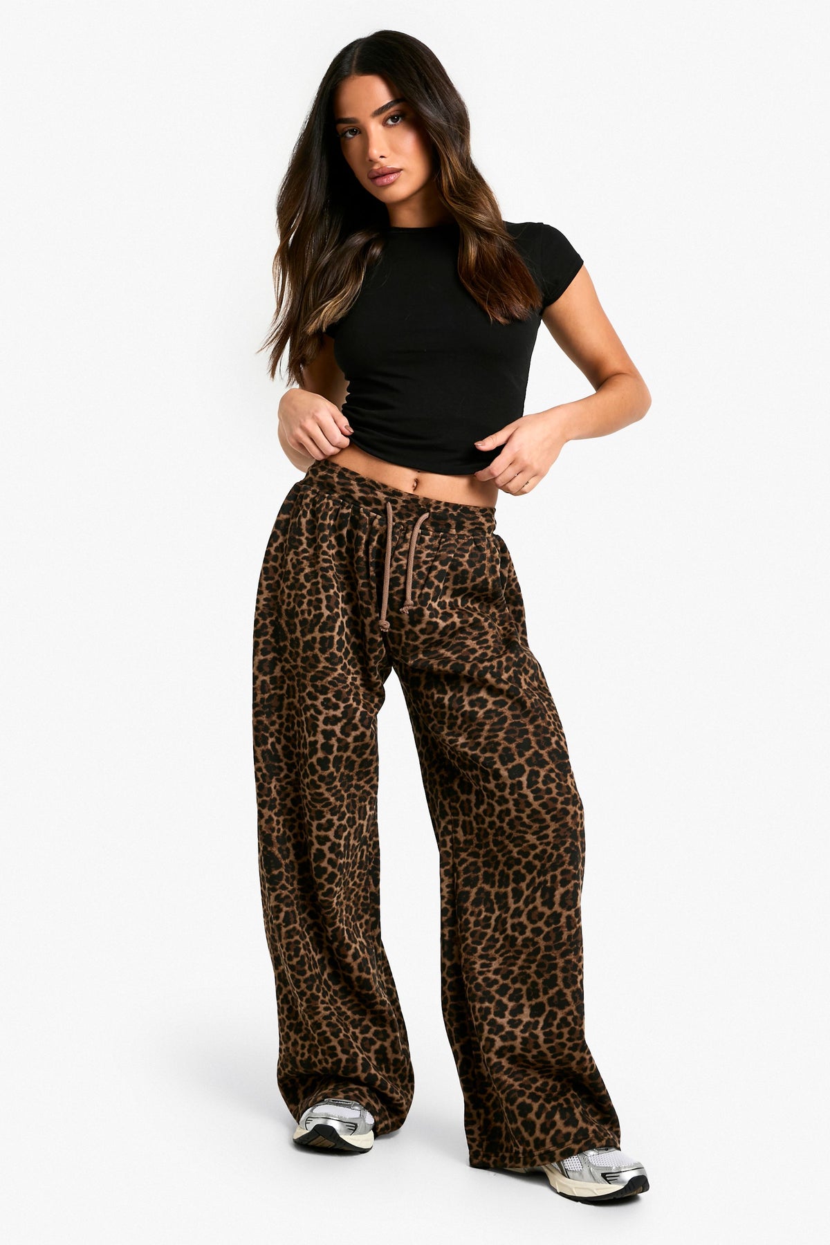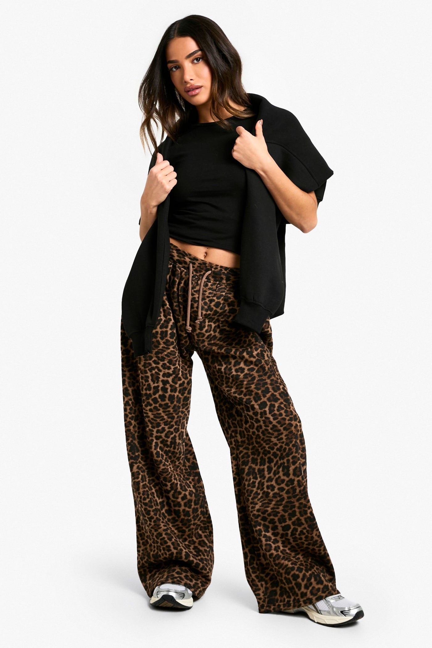 Make a statement in these bold leopard print joggers, designed to turn heads while keeping you comfortable. The wide-leg fit offers a trendy, relaxed silhouette that's perfect for casual outings or lounging at home. Pair with a cropped black top and trainers for an effortlessly cool look, or dress them up with a fitted bodysuit and heeled boots for a night out with the girls. The knitted fabric ensures all-day comfort, while the drawstring waistband allows for a customised fit. These joggers are ideal for family gatherings, brunches with friends, or even a casual Friday at the office when styled with a blazer. The petite sizing ensures the perfect length, eliminating the need for alterations. Embrace your wild side and add a touch of fierce fashion to your wardrobe with these versatile and stylish wide-leg joggers.Discover Petite Leopard Wide Leg Jogger available to buy online at us.boohoo.com. Available with quick delivery and easy return options. Shop now!Discover Petite Leopard Wide Leg Jogger available to buy online at us.boohoo.com. Available with quick delivery and easy return options. Shop now!