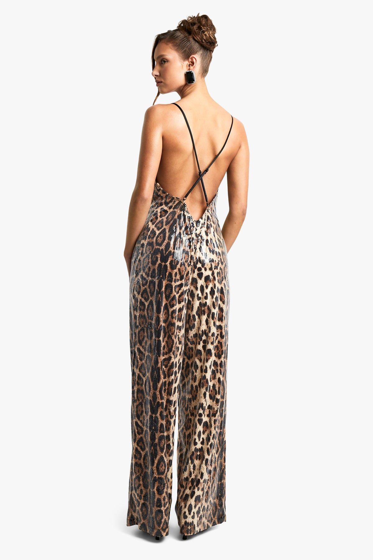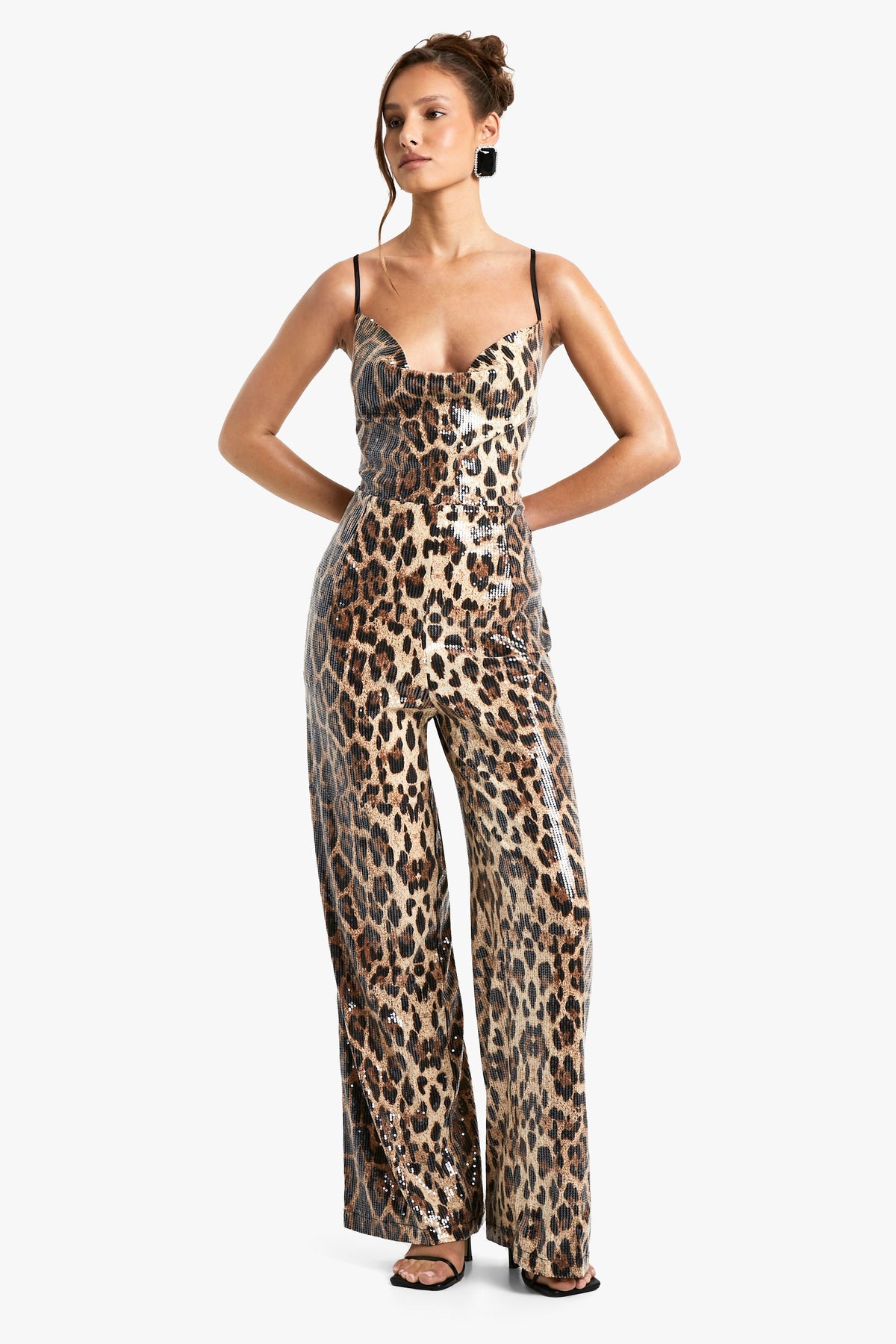 Make a bold statement at your next festive celebration with this show-stopping leopard print sequin jumpsuit. The dazzling all-over sequins catch the light beautifully, ensuring you'll be the centre of attention at any Christmas party. The wide-leg cut offers both comfort and sophistication, while the sweetheart neckline and waterfall detail add a touch of glamour. Style with strappy metallic heels and statement earrings for a head-turning look. For a more relaxed Christmas Day outfit, throw on a soft, cropped cardigan and swap the heels for elegant flats. This versatile piece can be dressed up or down, making it a perfect addition to your holiday wardrobe. The adjustable straps and cross-back design ensure a comfortable fit, allowing you to dance the night away with confidence.Discover Leopard Sequin Cowl Neck Wide Leg Jumpsuit available to buy online at us.boohoo.com. Available with quick delivery and easy return options. Shop now!Discover Leopard Sequin Cowl Neck Wide Leg Jumpsuit available to buy online at us.boohoo.com. Available with quick delivery and easy return options. Shop now!