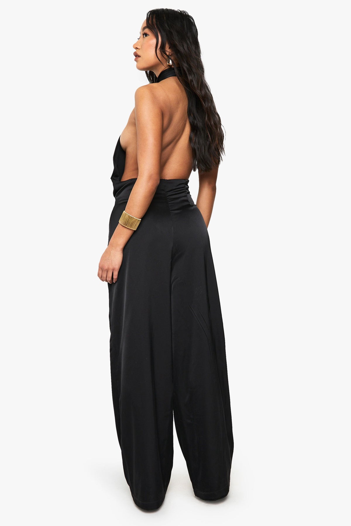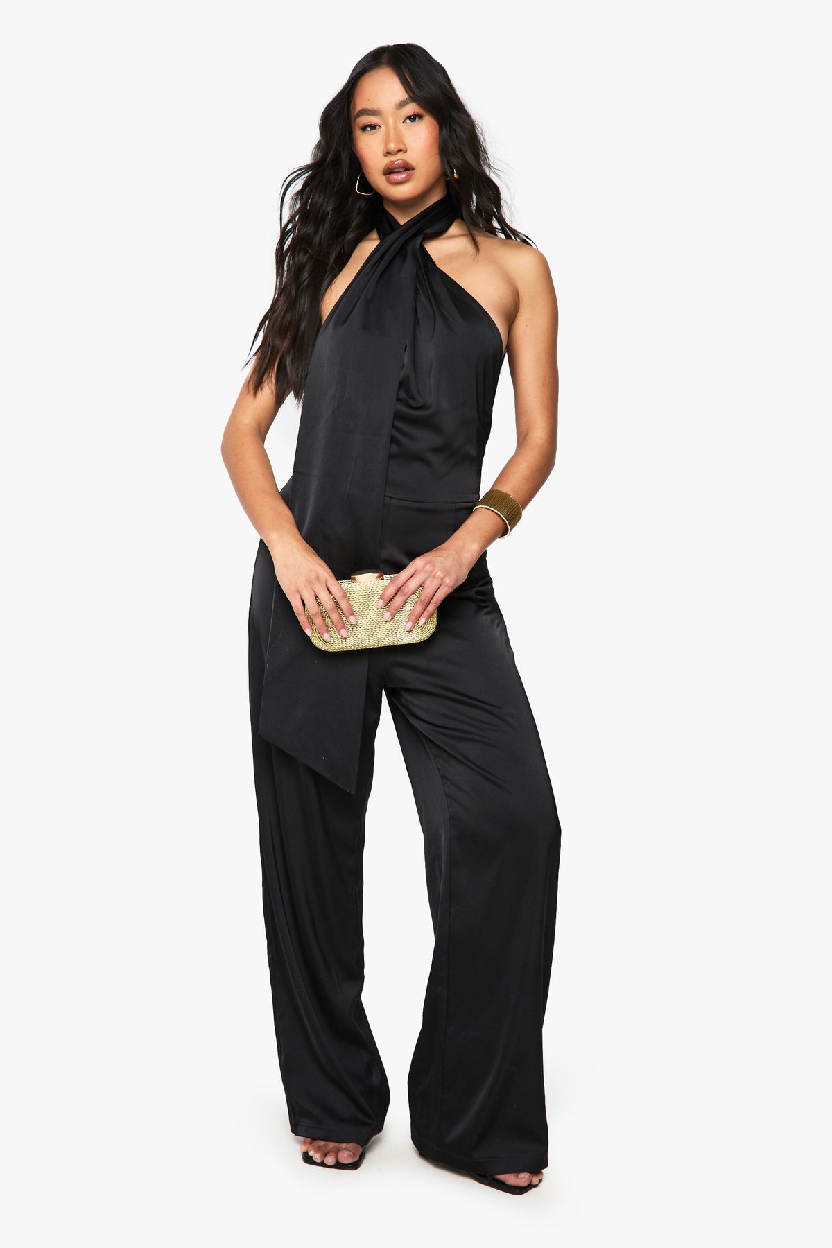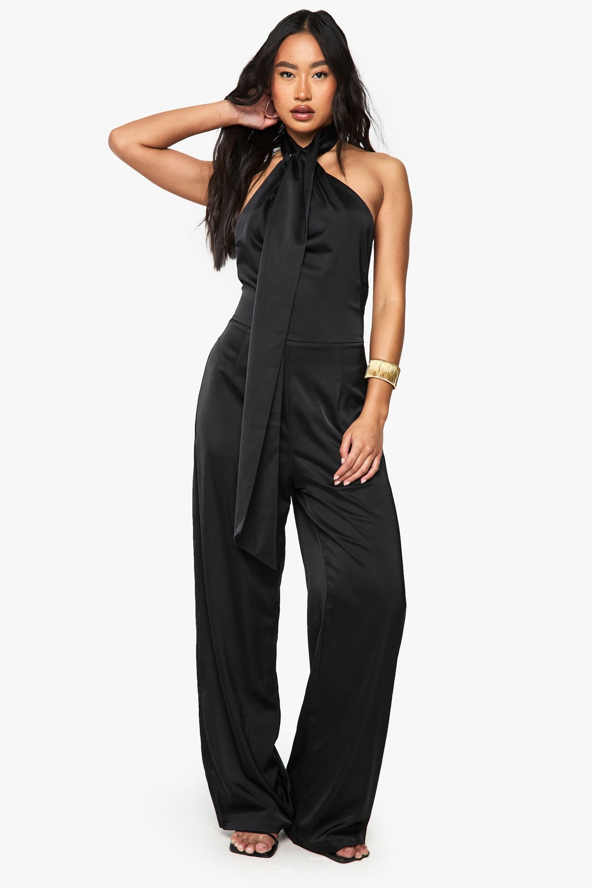 Make a memorable entrance at your next formal occasion in this stunning satin jumpsuit from Boohoo. The high neck design with its distinctive drape detail creates a sophisticated focal point, whilst the open back adds a touch of allure. The wide-leg silhouette offers both comfort and drama, flowing beautifully as you move. Style with strappy heels and statement gold jewellery as shown for maximum impact at weddings or evening events. For cooler evenings, layer with a tailored blazer or an elegant wrap. This versatile piece can be dressed up with a sleek updo and bold earrings for formal gatherings, or styled with more understated accessories for cocktail parties. The all-in-one design eliminates the need for outfit coordination whilst ensuring you stand out for all the right reasons.Discover Satin Scarf Detail Jumpsuit available to buy online at us.boohoo.com. Available with quick delivery and easy return options. Shop now!Discover Satin Scarf Detail Jumpsuit available to buy online at us.boohoo.com. Available with quick delivery and easy return options. Shop now!