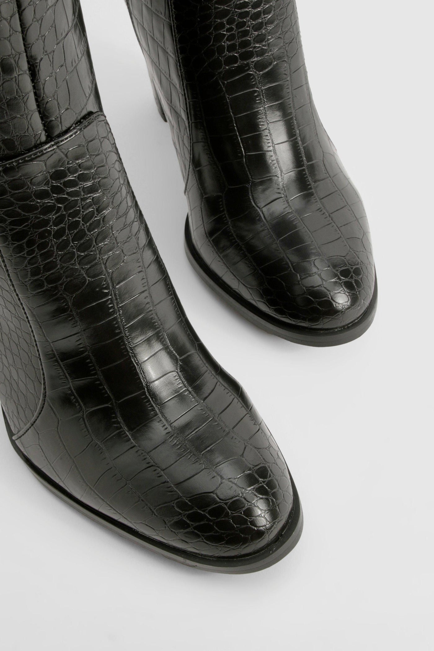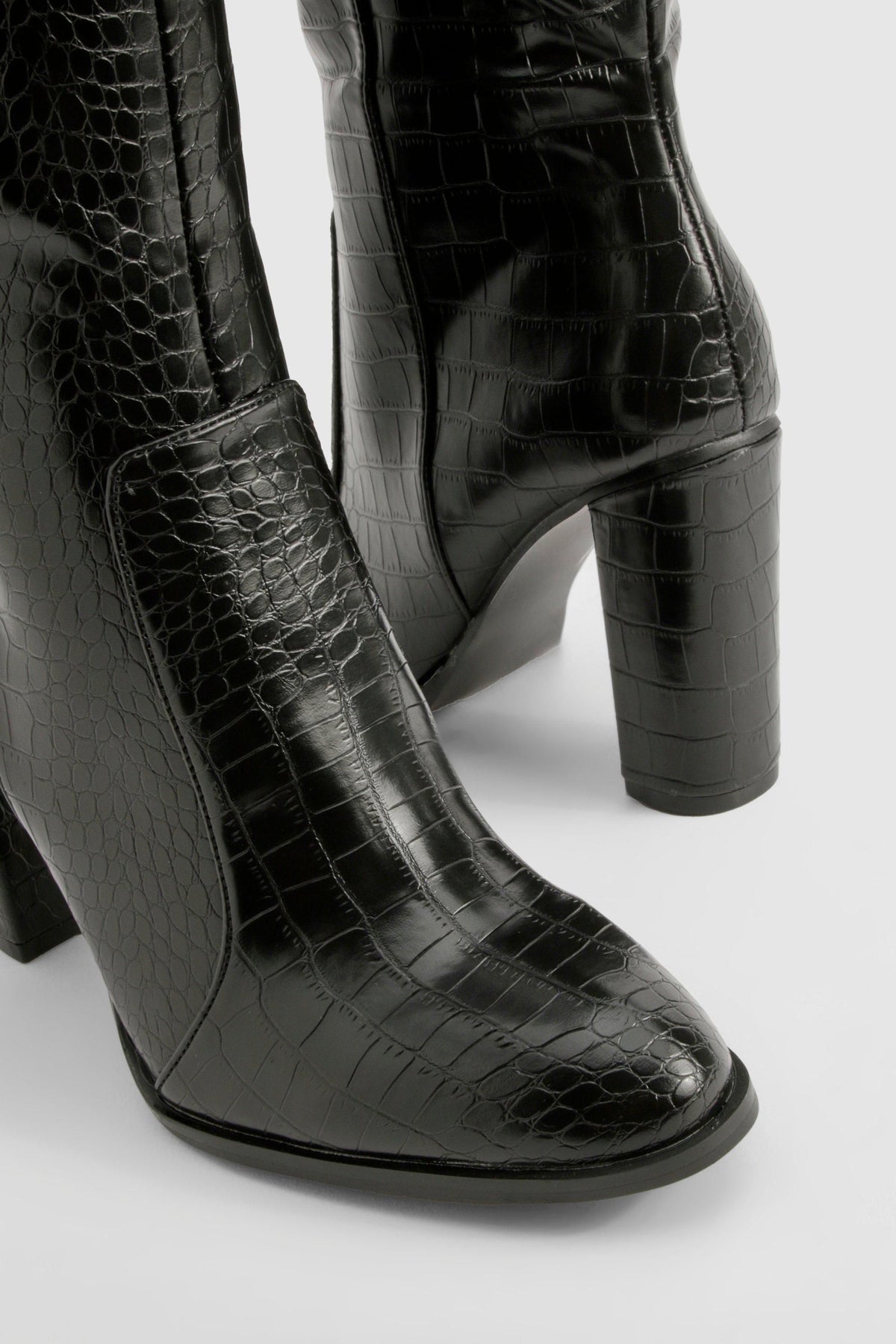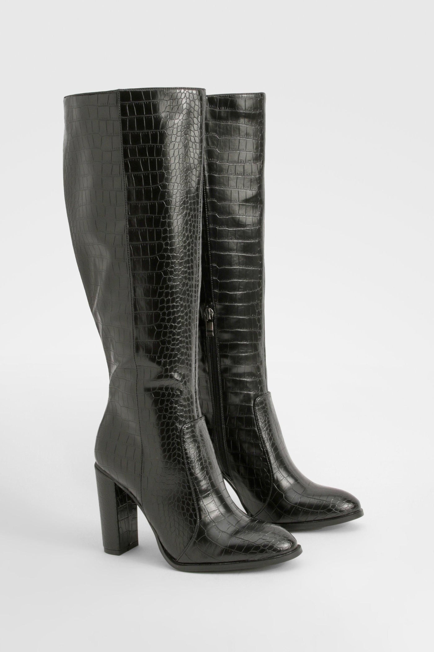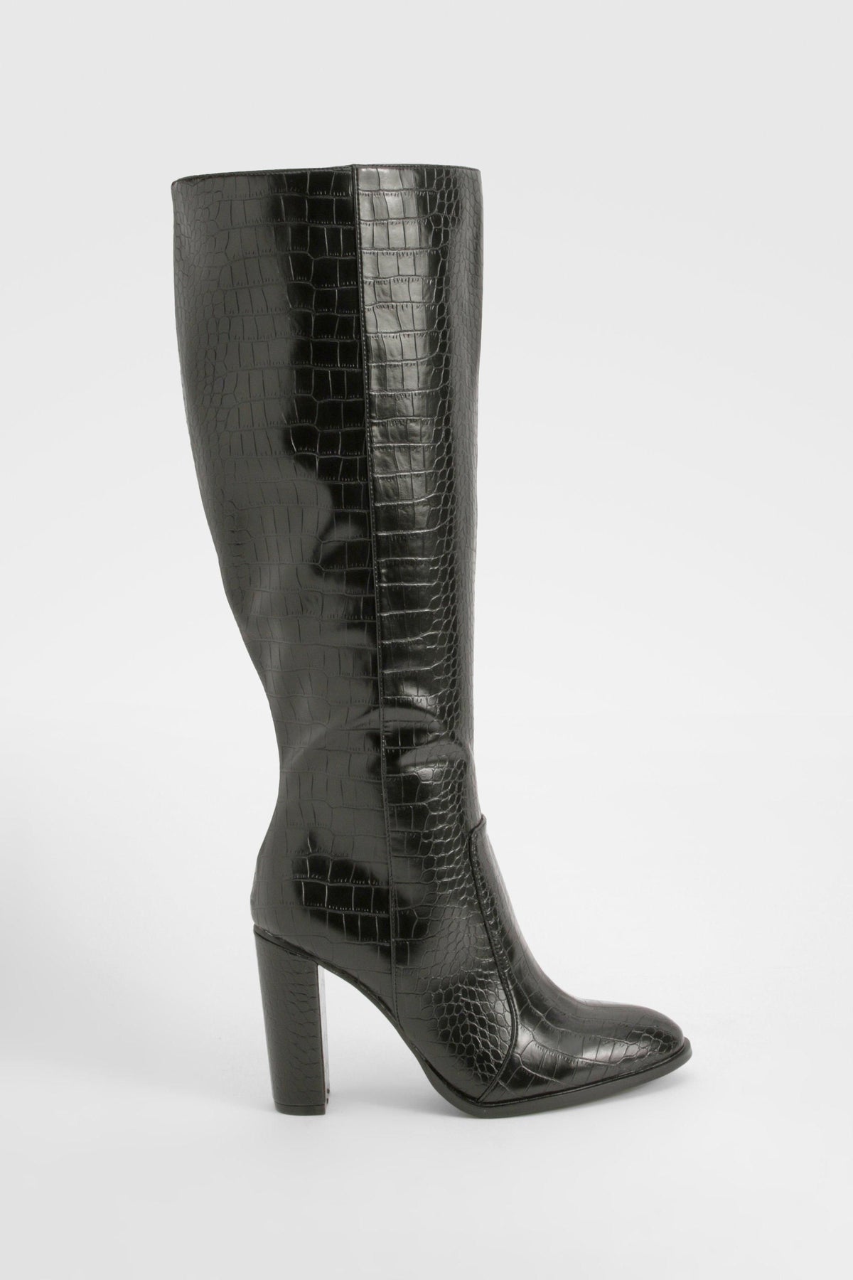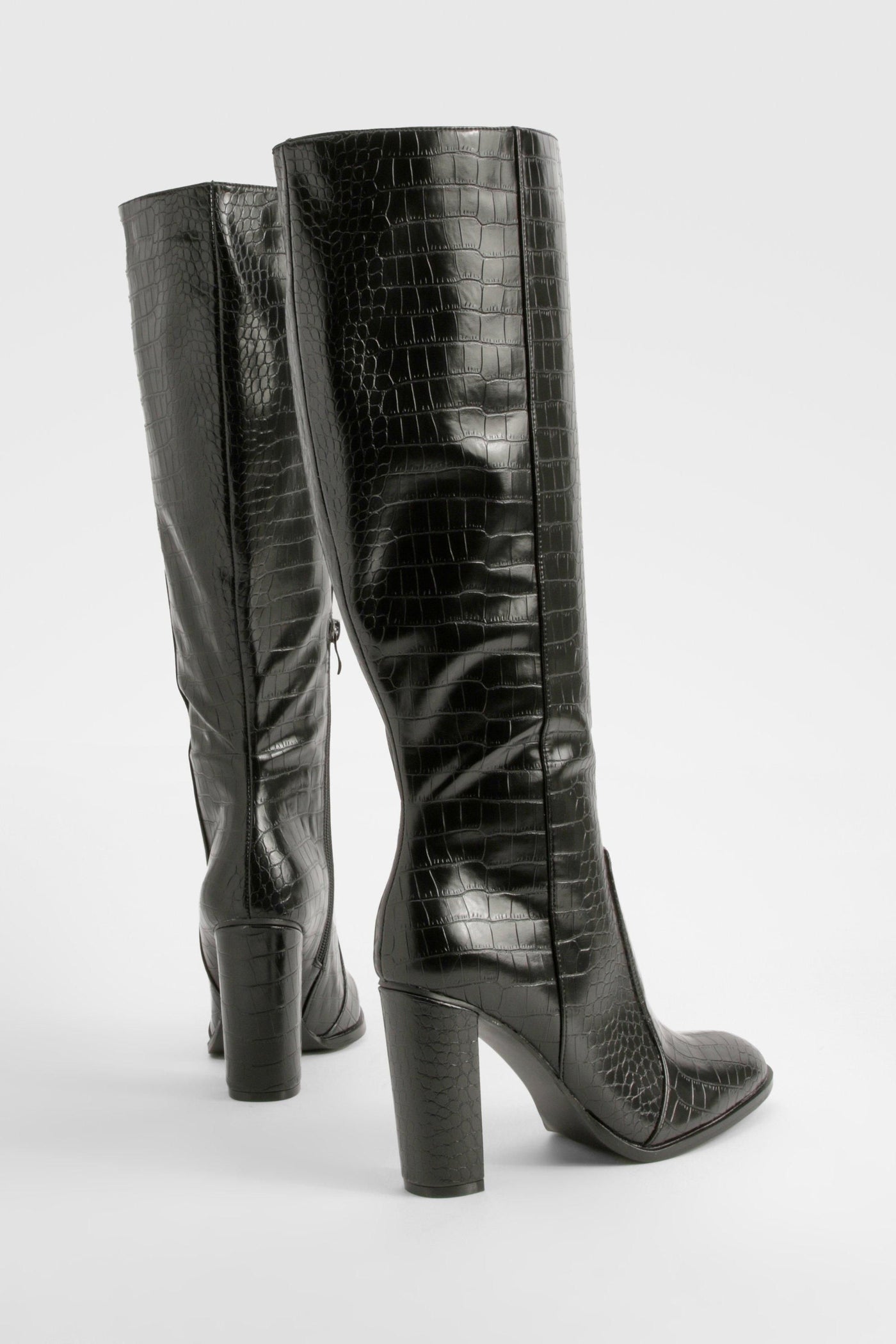 Make a bold statement with these eye-catching knee-high boots from Boohoo. The crocodile-effect texture adds a touch of exotic flair to your ensemble, whilst the sleek pointed toe and mid-height block heel create a flattering, elongated silhouette. Perfect for the fashion-forward woman who wants to turn heads, these boots can effortlessly transition from day to night. Style them with a midi skirt and oversized jumper for a chic daytime look, or pair them with a little black dress for an evening out. The versatile design makes these boots a go-to choice for family gatherings, brunches with friends, or casual outings where you want to add a dash of glamour to your outfit. With their on-trend appeal and comfortable heel height, these boots are sure to become a staple in your autumn and winter wardrobe.Discover Round Toe Knee High Croc Boots available to buy online at us.boohoo.com. Available with quick delivery and easy return options. Shop now!Discover Round Toe Knee High Croc Boots available to buy online at us.boohoo.com. Available with quick delivery and easy return options. Shop now!