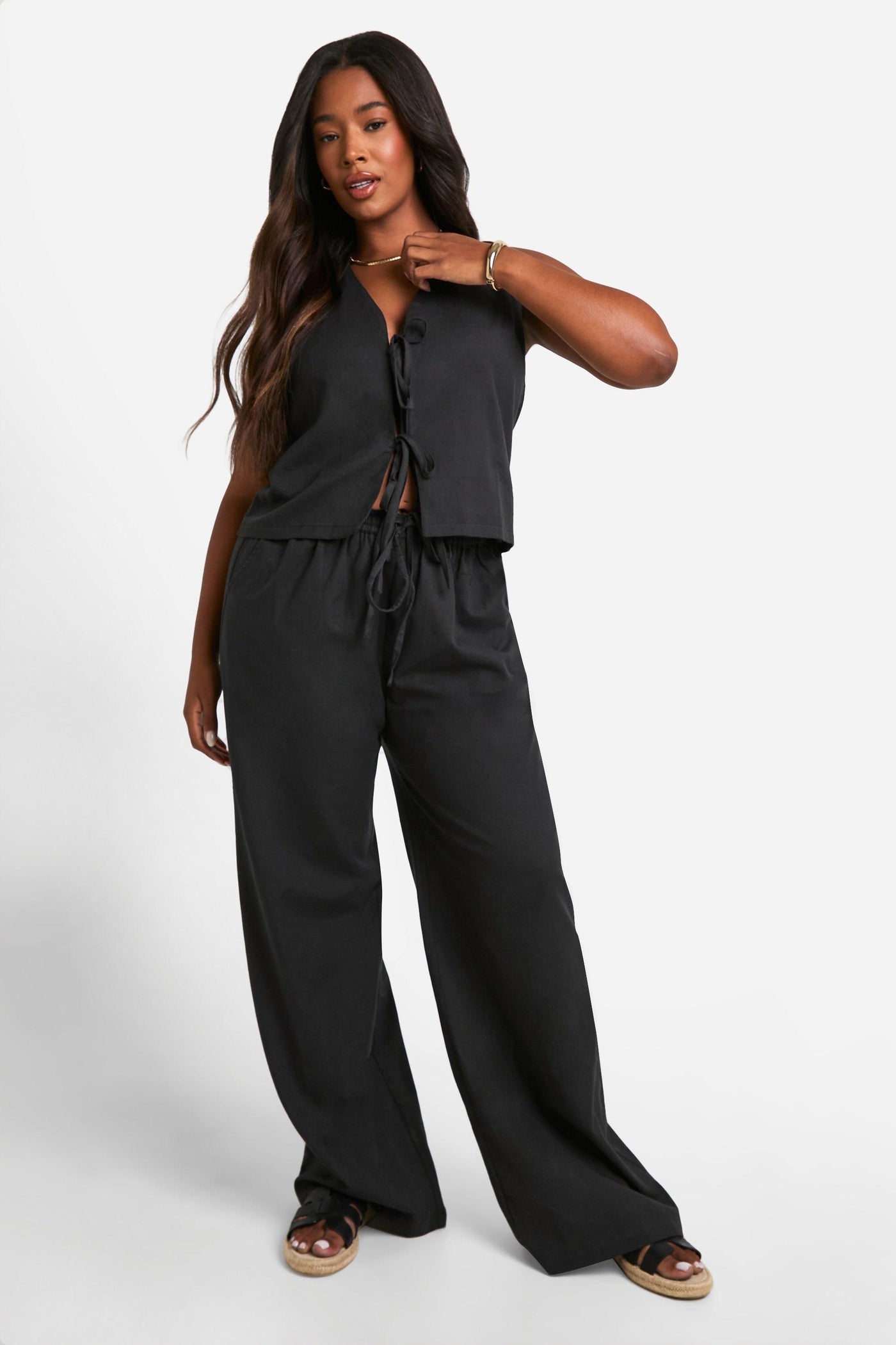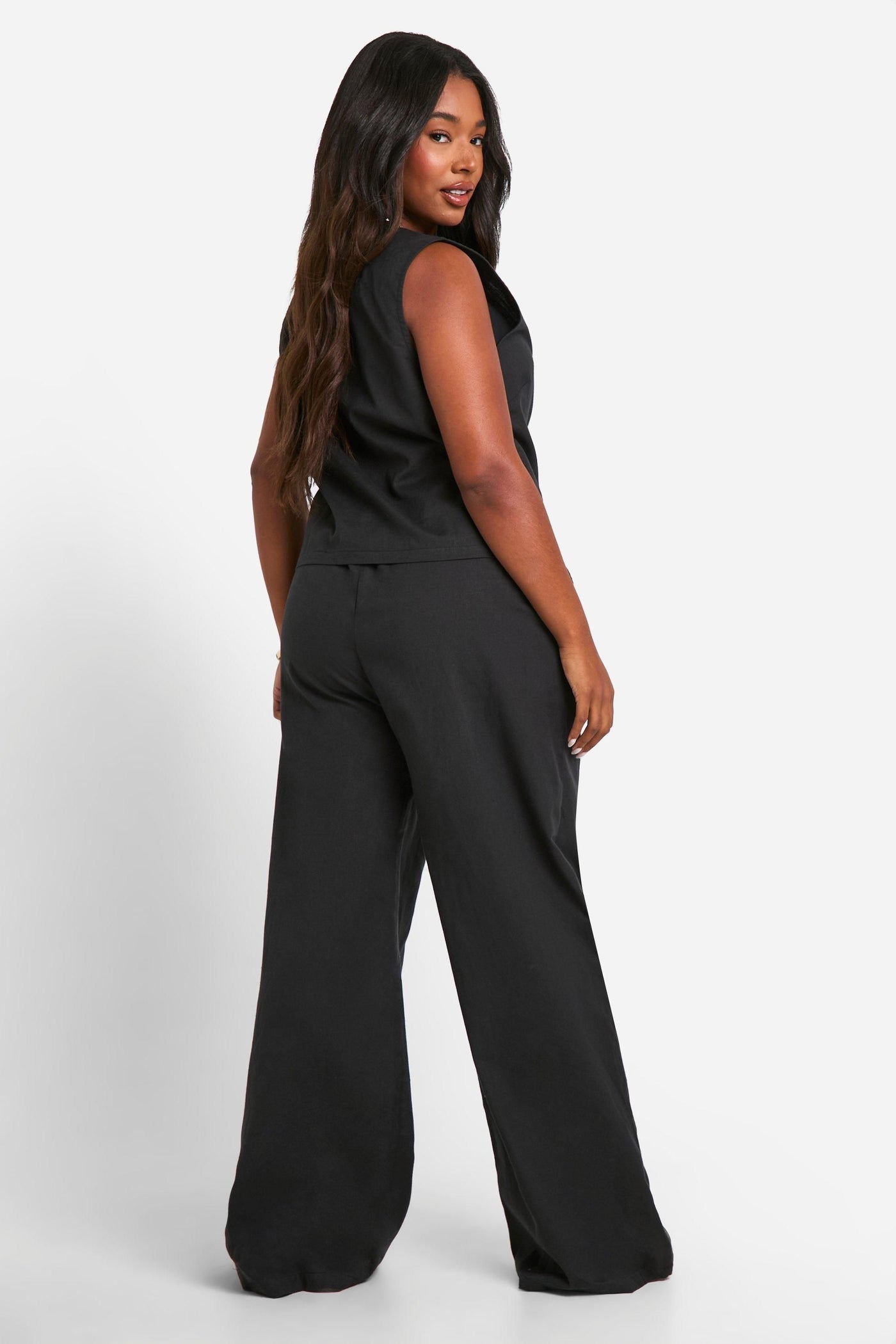 Embrace effortless chic with this plus-size linen-look co-ord set from Boohoo. The sleeveless crop top features a trendy tie-front detail, while the wide-leg trousers offer a comfortable and flattering fit. Perfect for casual outings or laid-back gatherings, this ensemble radiates a cool, relaxed vibe. Style the top with high-waisted jeans for a night out, or pair the trousers with a fitted bodysuit for a more polished look. For a complete summer-ready outfit, team with strappy sandals and oversized sunglasses. The versatility of this set allows for endless styling possibilities, making it a must-have addition to your wardrobe. Whether you're heading to a family barbecue or a casual brunch with friends, this co-ord set will keep you looking stylish and feeling confident.Discover Plus Linen Look Tie Front Crop & Wide Leg Trousers available to buy online at us.boohoo.com. Available with quick delivery and easy return options. Shop now!Discover Plus Linen Look Tie Front Crop & Wide Leg Trousers available to buy online at us.boohoo.com. Available with quick delivery and easy return options. Shop now!