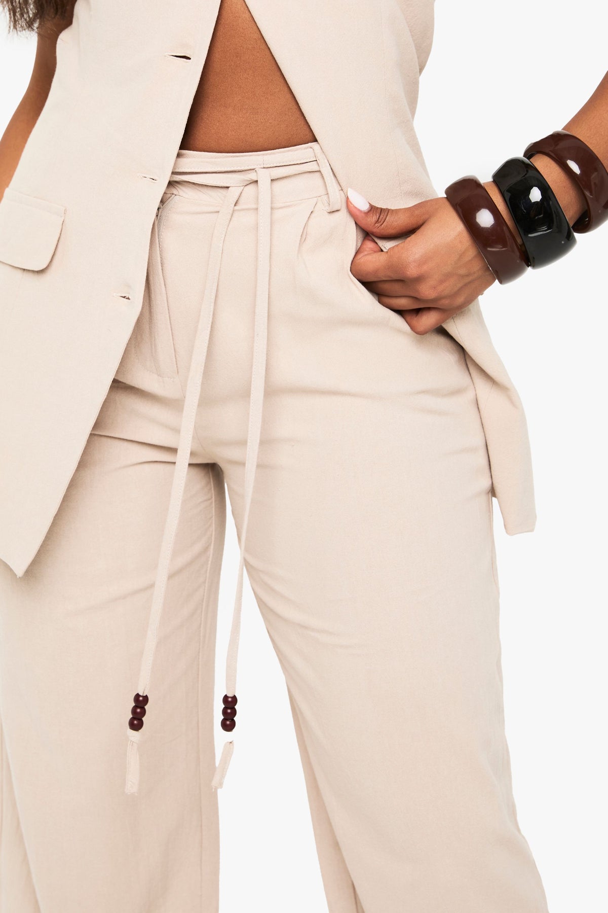 These cotton wide leg trousers showcase the perfect blend of comfort and contemporary style. The distinctive strapless design with button-front detailing creates a striking silhouette, whilst the practical flap pockets add a utilitarian touch. The relaxed wide leg cut offers freedom of movement without compromising on style, making these trousers ideal for warm-weather outings. Style with flat sandals and a clutch bag for casual daytime events, or dress up with wooden platform heels and statement accessories for evening gatherings. The tie-waist feature allows for a personalised fit that flatters your figure. These trousers are a versatile wardrobe staple that can be styled for family gatherings, weekend brunches or casual outings - a true embodiment of Boohoo's commitment to inclusive, trend-focused fashion that works for all occasions.Discover Linen Beaded Tie Detail Wide Leg Trouser available to buy online at us.boohoo.com. Available with quick delivery and easy return options. Shop now!Discover Linen Beaded Tie Detail Wide Leg Trouser available to buy online at us.boohoo.com. Available with quick delivery and easy return options. Shop now!