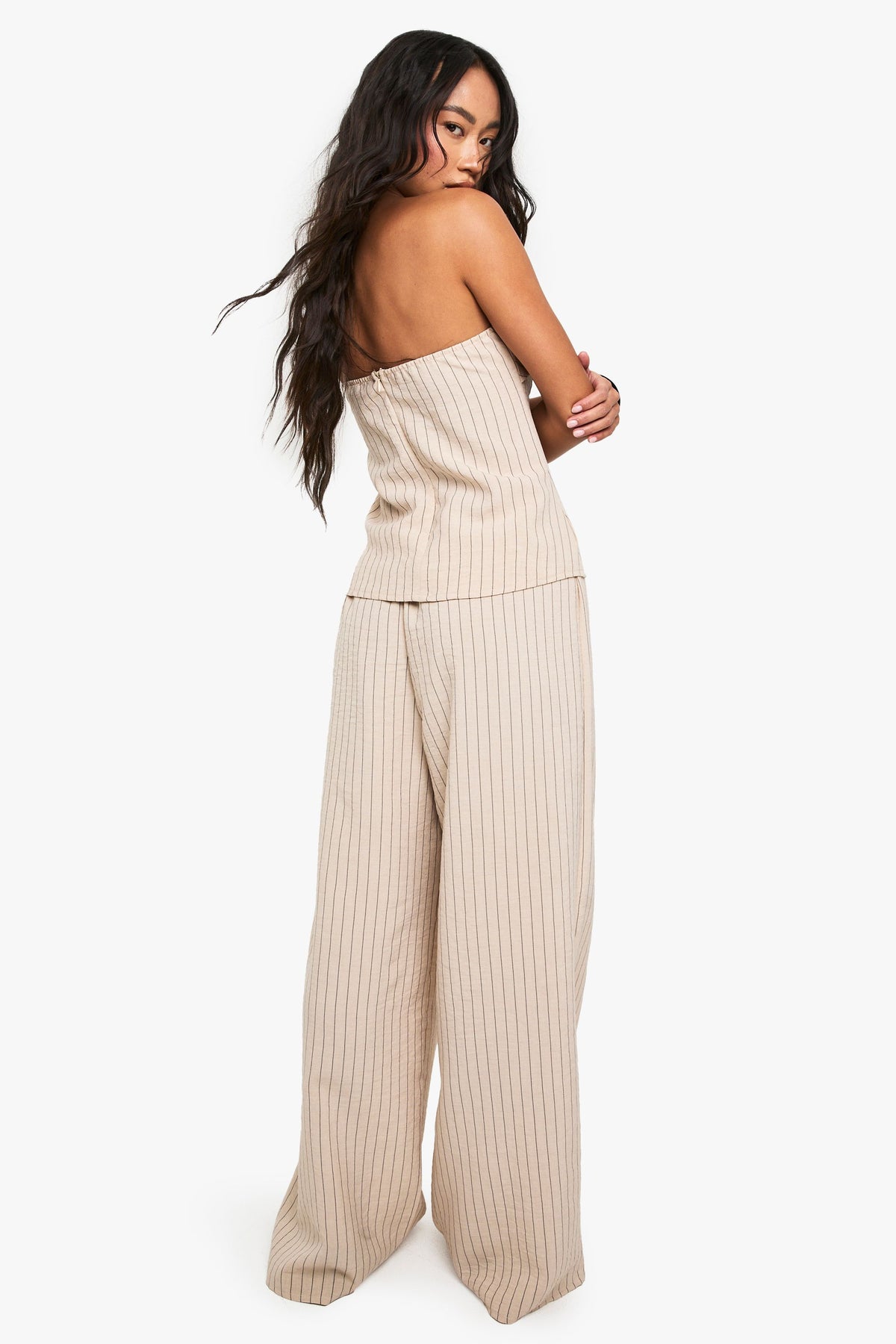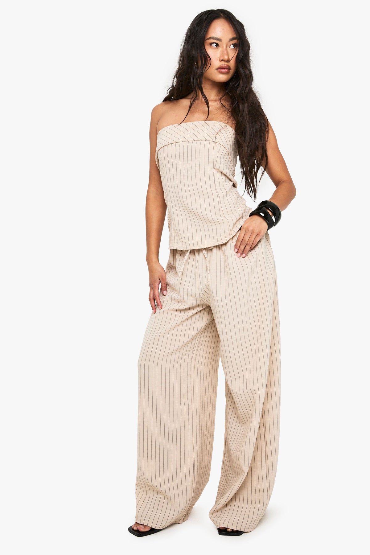Make a statement in these striking striped wide leg trousers from Boohoo. The linen-look fabric offers a breezy, relaxed feel whilst maintaining a put-together appearance. Style with the matching strapless top as shown for an on-trend co-ord look, or pair with a fitted tee and trainers for casual daytime outings. Add statement sunglasses and chunky accessories as styled on our model for extra fashion points. These versatile trousers transition effortlessly from family gatherings to brunch dates - simply swap your flats for low heels to take your look into evening territory. The roomy wide leg cut ensures all-day comfort without compromising on style, making these trousers a must-have addition to your warm-weather wardrobe.Discover Linen Look Stripe Wide Leg Trouser available to buy online at us.boohoo.com. Available with quick delivery and easy return options. Shop now!Discover Linen Look Stripe Wide Leg Trouser available to buy online at us.boohoo.com. Available with quick delivery and easy return options. Shop now!