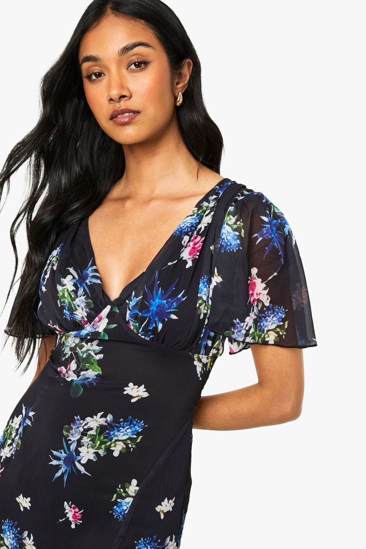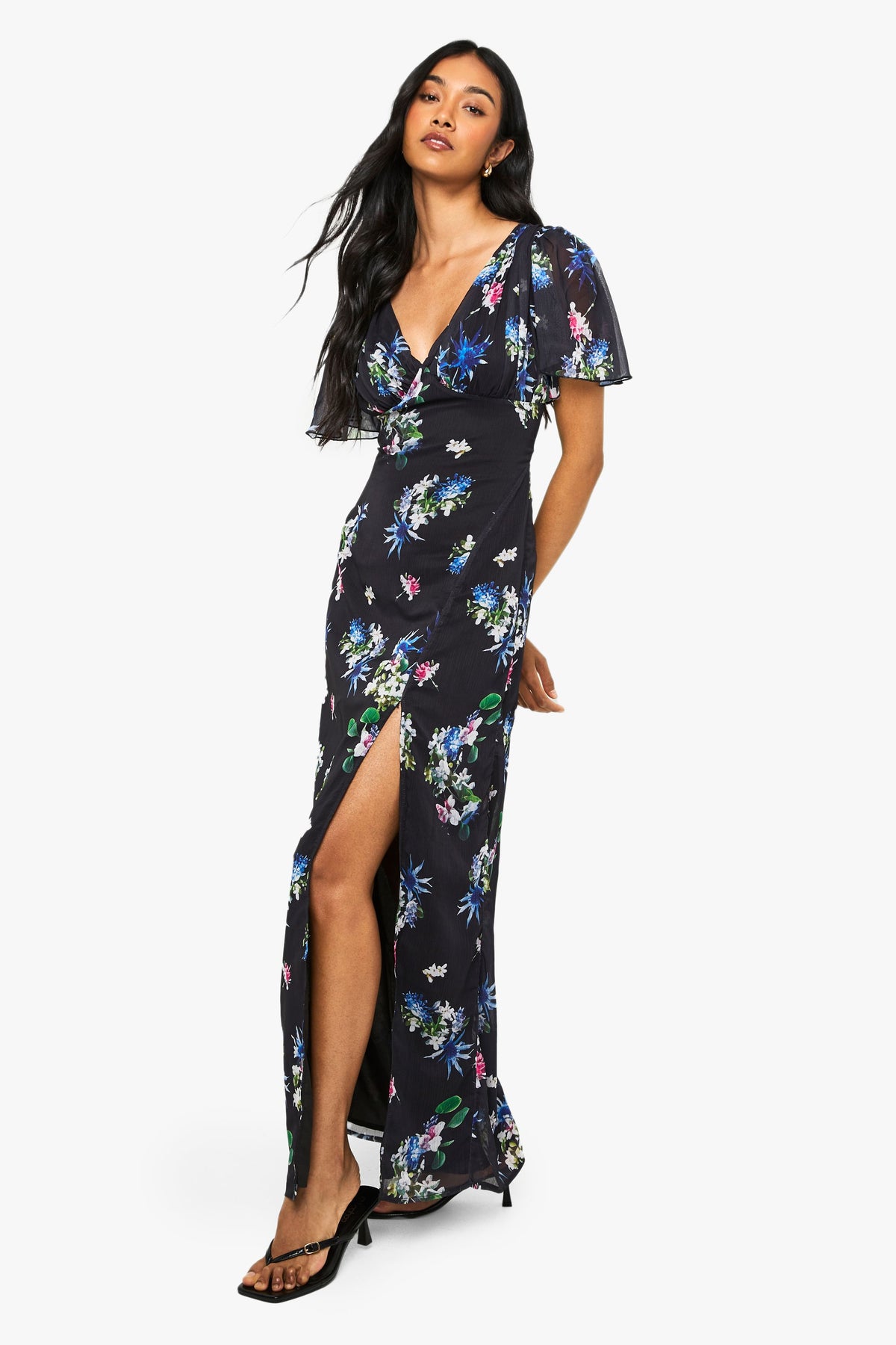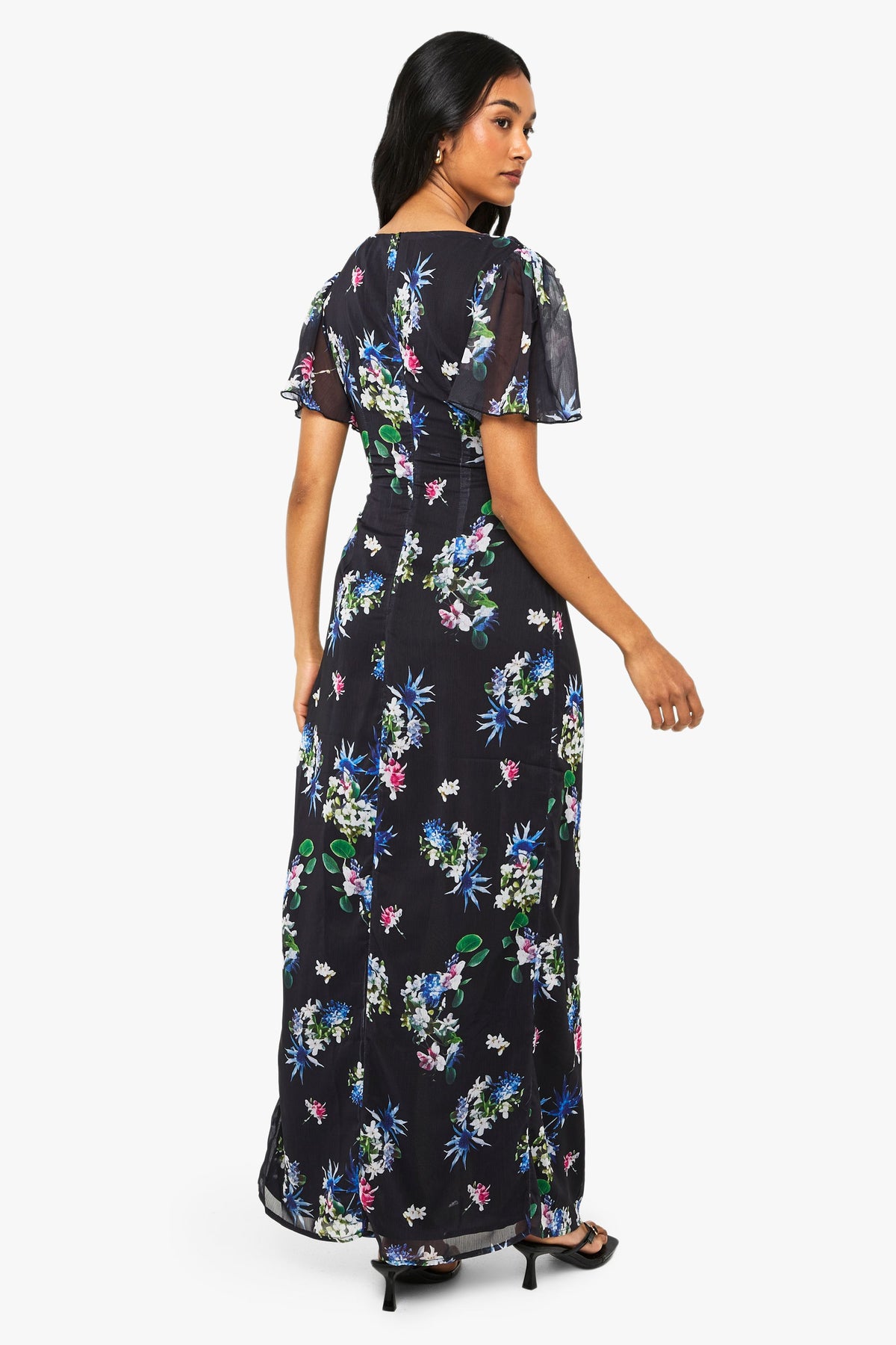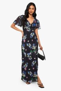 Floral Angel Sleeve Chiffon Plunge Maxi Dress