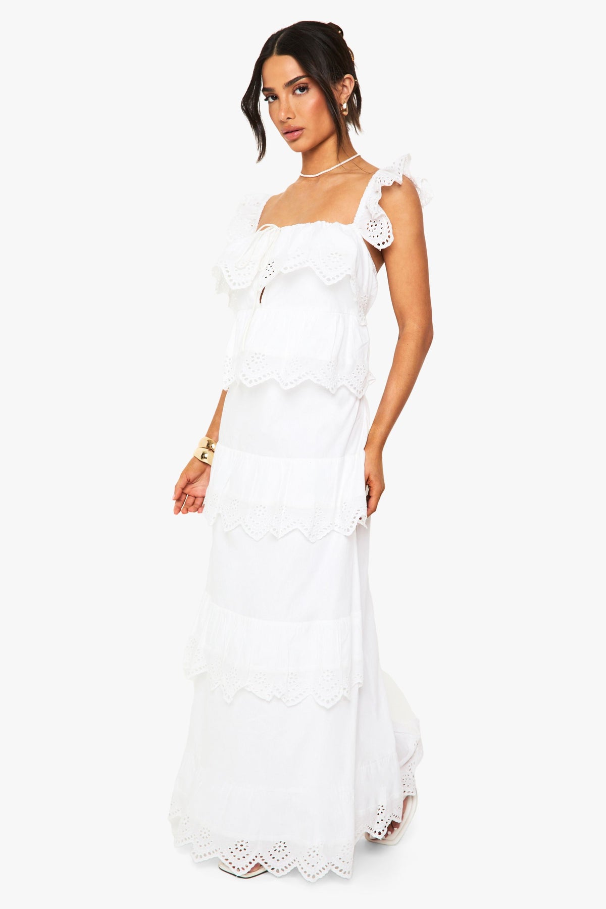 Elegant crochet detailing with delicate scalloped edges throughout the tiered design