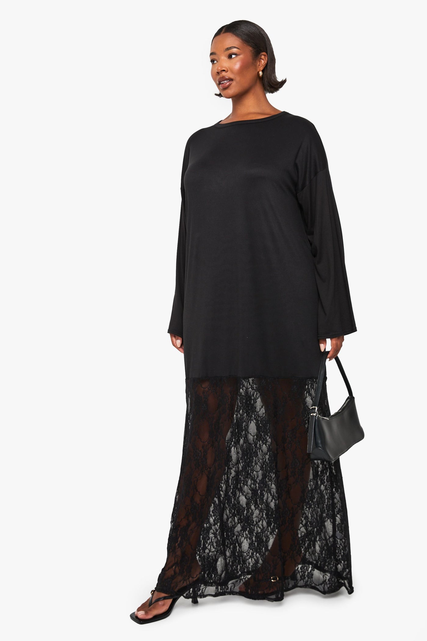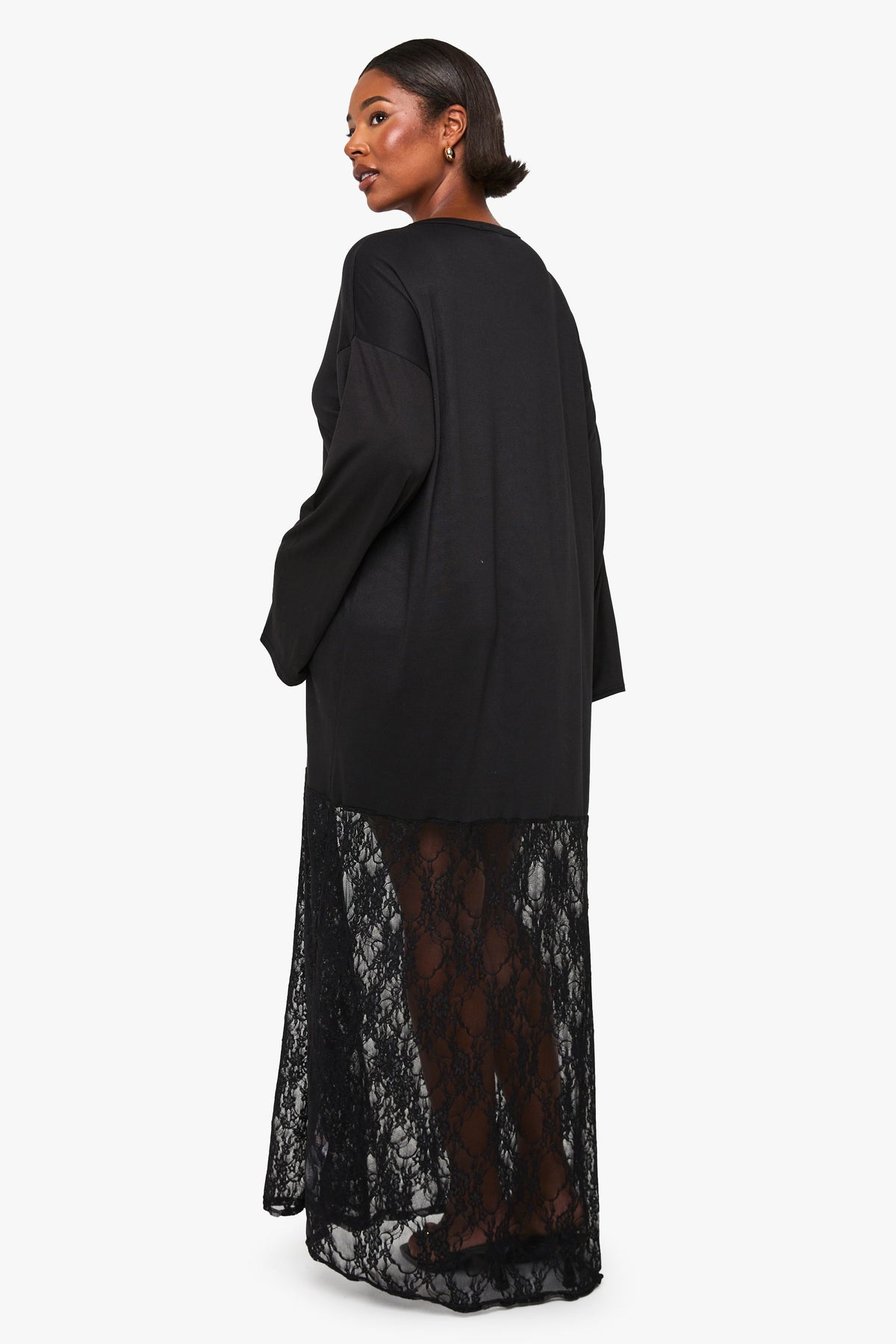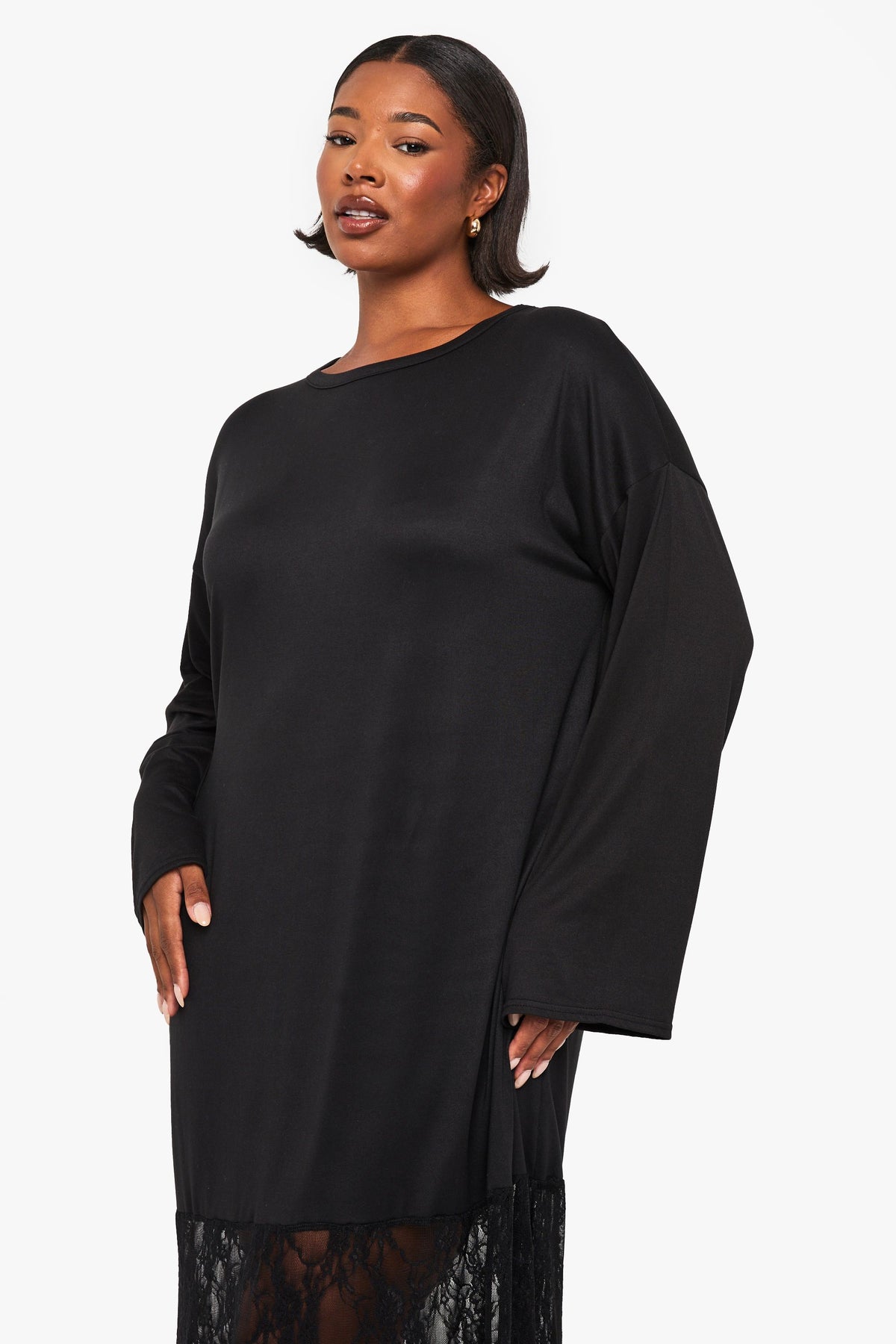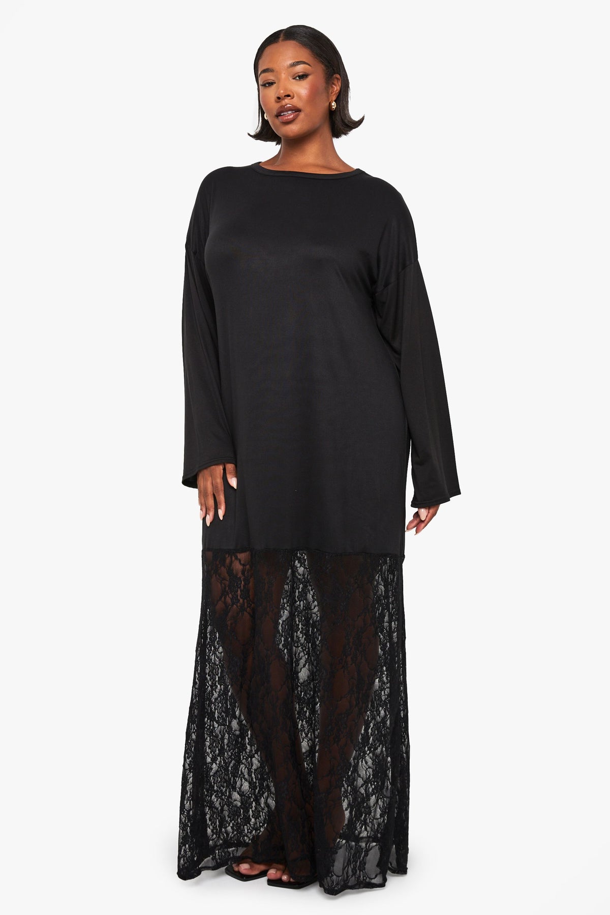 This captivating t-shirt dress combines casual comfort with striking design elements for a truly versatile addition to your wardrobe. The relaxed upper portion offers the ease of your favourite tee whilst the dramatic lace panel creates a show-stopping effect that transitions effortlessly from day to evening. Style with flat sandals and a crossbody bag for family gatherings or weekend brunches. For cooler evenings, layer with an oversized denim jacket and trainers for an on-trend casual look. The comfortable stretch fabric ensures you'll feel as good as you look, whilst the floor-length silhouette creates an elongating effect. This Boohoo piece embodies the brand's commitment to inclusive fashion that doesn't compromise on style - perfect for the fashion-forward woman who values both comfort and making a statement.Discover plus long sleeve lace t-shirt dress available to buy online at us.boohoo.com. Available with quick delivery and easy return options. Shop now!Discover plus long sleeve lace t-shirt dress available to buy online at us.boohoo.com. Available with quick delivery and easy return options. Shop now!