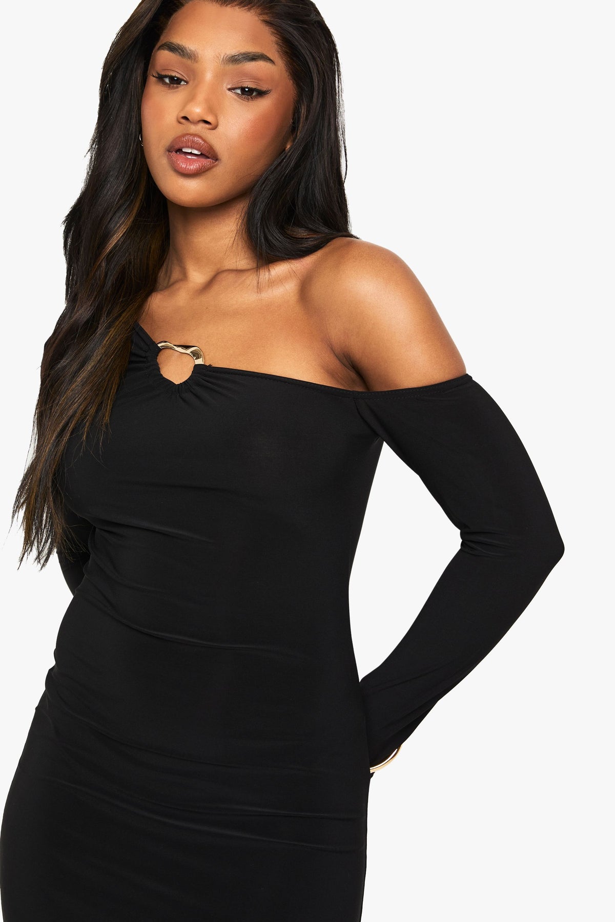 Striking asymmetric neckline with elegant gold-tone hardware detail