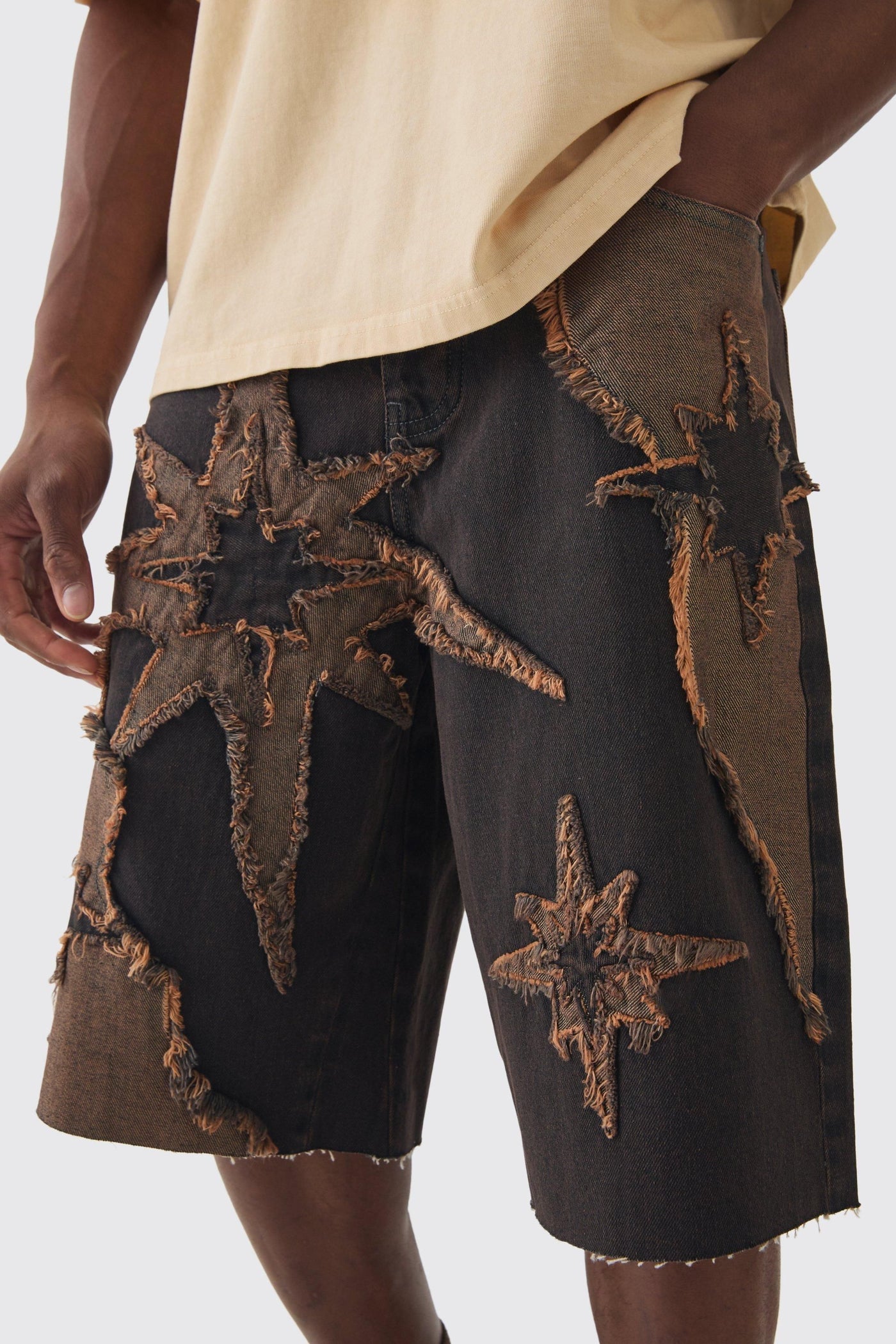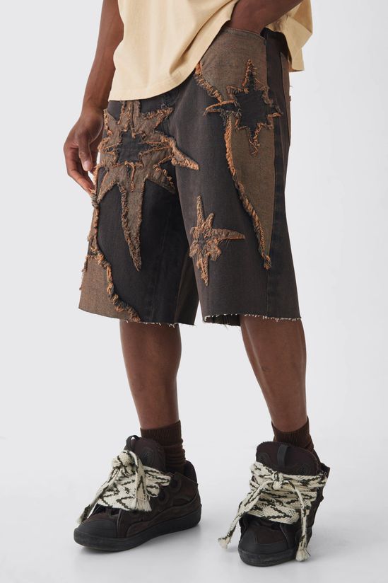 If it's comfort that you're looking for in men's holiday fashion, pick a pair of shorts from our unrivalled selection. You haven't been skipping leg day, have you? No, we know you wouldn't. All the better as you'll want to sport some of our stylish denim shorts, chino shorts, jersey shorts or cargo shorts. If you're looking for new outfit ideas for this summer, consider pairing a horizontal striped t-shirt with jean shorts or opt for a printed shirt and chino shorts for a smarter combo. Round off with a pair of sliders or loafers for extra style points.Discover Regular Rigid Star Applique Denim Jorts In Brown available to buy online at us.boohoo.com. Available with quick delivery and easy return options. Shop now!Discover Regular Rigid Star Applique Denim Jorts In Brown available to buy online at us.boohoo.com. Available with quick delivery and easy return options. Shop now!