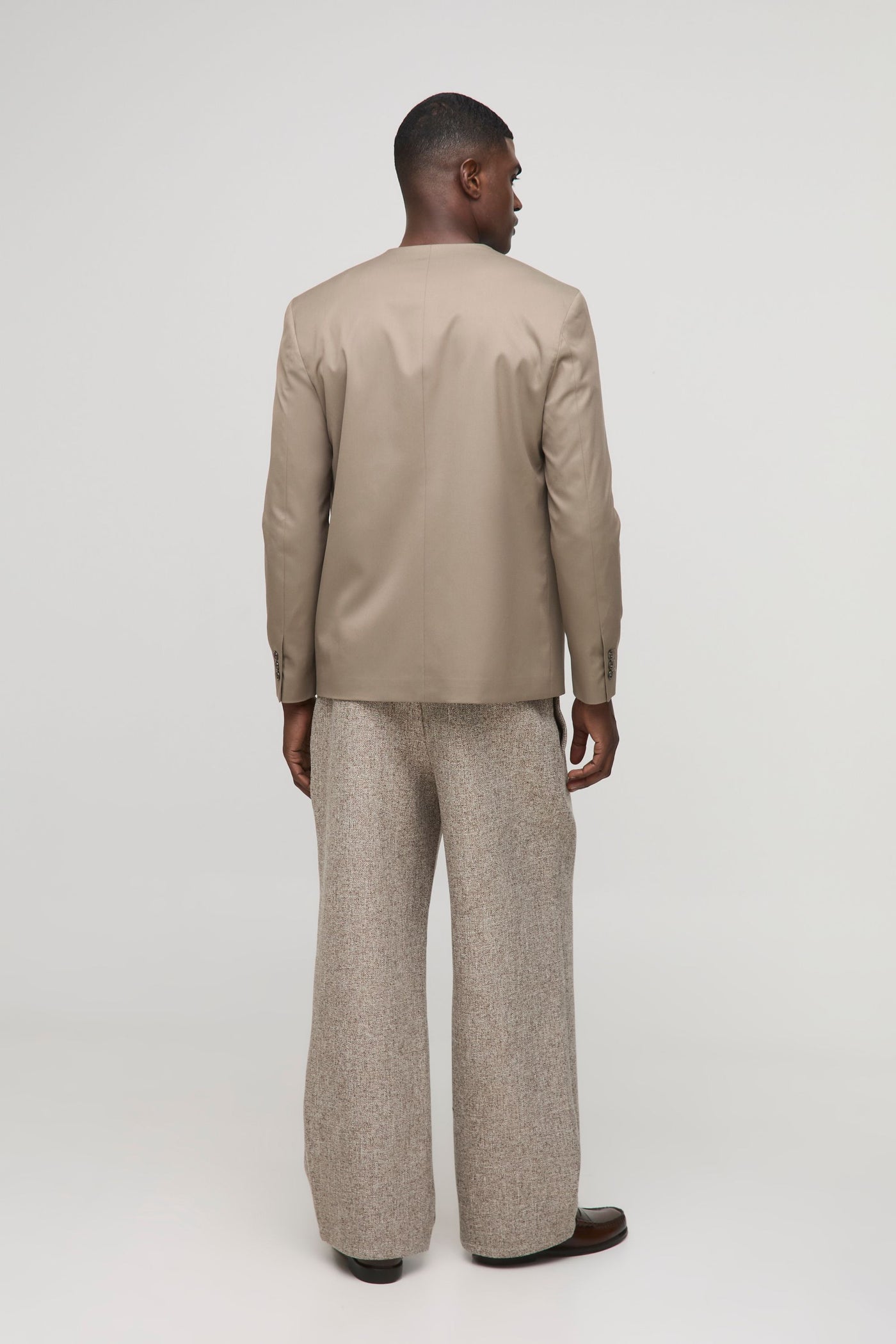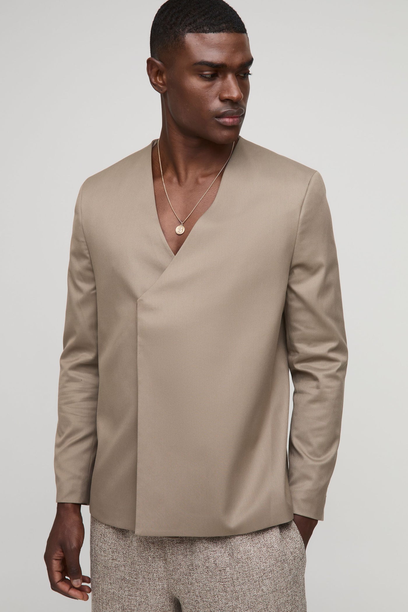 Level up your evening look with a tailored jacket. Nothing elevates an outfit from casual to cool like a men's blazer in your signature style, and sophistication is always trending. Upgrade your jeans by adding a blazer, bomber jacket or overcoat and hit the right style tone at every occasion. If you prefer a squarer, boxier silhouette go for a relaxed fit double-breasted jacket in a dark colour, or show off your waistline with a single-breasted blazer over a fitted white tea and tapered jeans. Or, to create more fluid shapes and lines, step on out in a boxy wrap blazer with contrasting panels. Whether you're wearing jeans, trousers or shorts, the right blazer or coat adds extra suave to any situation.Style Single Breasted BlazerDesign PlainFabric PolyesterDetail PlainNeckline CollarlessDiscover Oversized Collarless Wrap Front Blazer available to buy online at us.boohoo.com. Available with quick delivery and easy return options. Shop now!Discover Oversized Collarless Wrap Front Blazer available to buy online at us.boohoo.com. Available with quick delivery and easy return options. Shop now!
