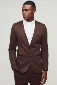 Level up your evening look with a tailored jacket. Nothing elevates an outfit from casual to cool like a men's blazer in your signature style, and sophistication is always trending. Upgrade your jeans by adding a blazer, bomber jacket or overcoat and hit the right style tone at every occasion. If you prefer a squarer, boxier silhouette go for a relaxed fit double-breasted jacket in a dark colour, or show off your waistline with a single-breasted blazer over a fitted white tea and tapered jeans. Or, to create more fluid shapes and lines, step on out in a boxy wrap blazer with contrasting panels. Whether you're wearing jeans, trousers or shorts, the right blazer or coat adds extra suave to any situation.Style BlazerDesign PlainFabric JerseyDetail PlainLength RegularNeckline CollarlessSleeve Length Long SleeveDiscover Slim Collarless Jersey Blazer available to buy online at us.boohoo.com. Available with quick delivery and easy return options. Shop now!Discover Slim Collarless Jersey Blazer available to buy online at us.boohoo.com. Available with quick delivery and easy return options. Shop now!