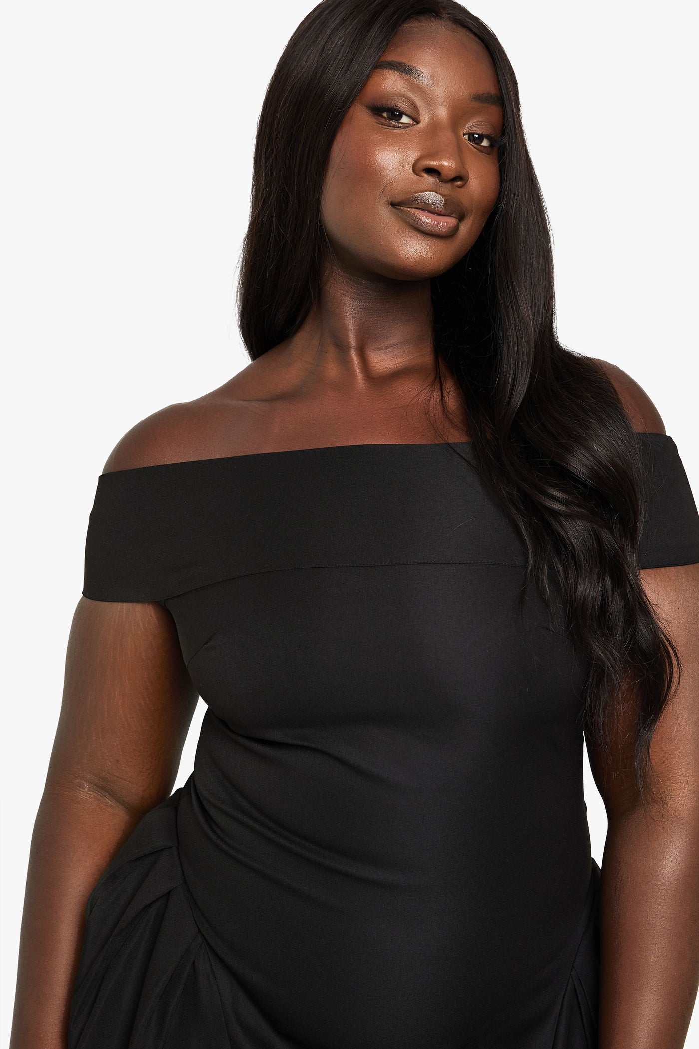 Elegant Bardot neckline showcasing shoulders for a flattering silhouette