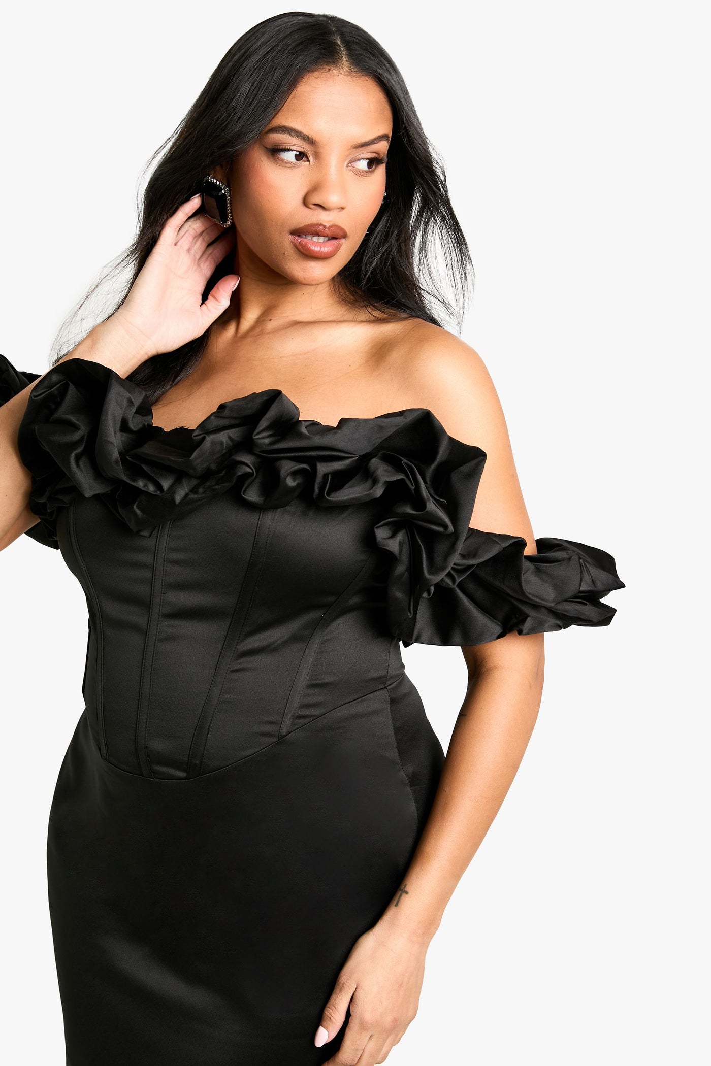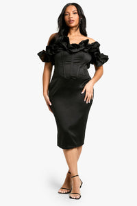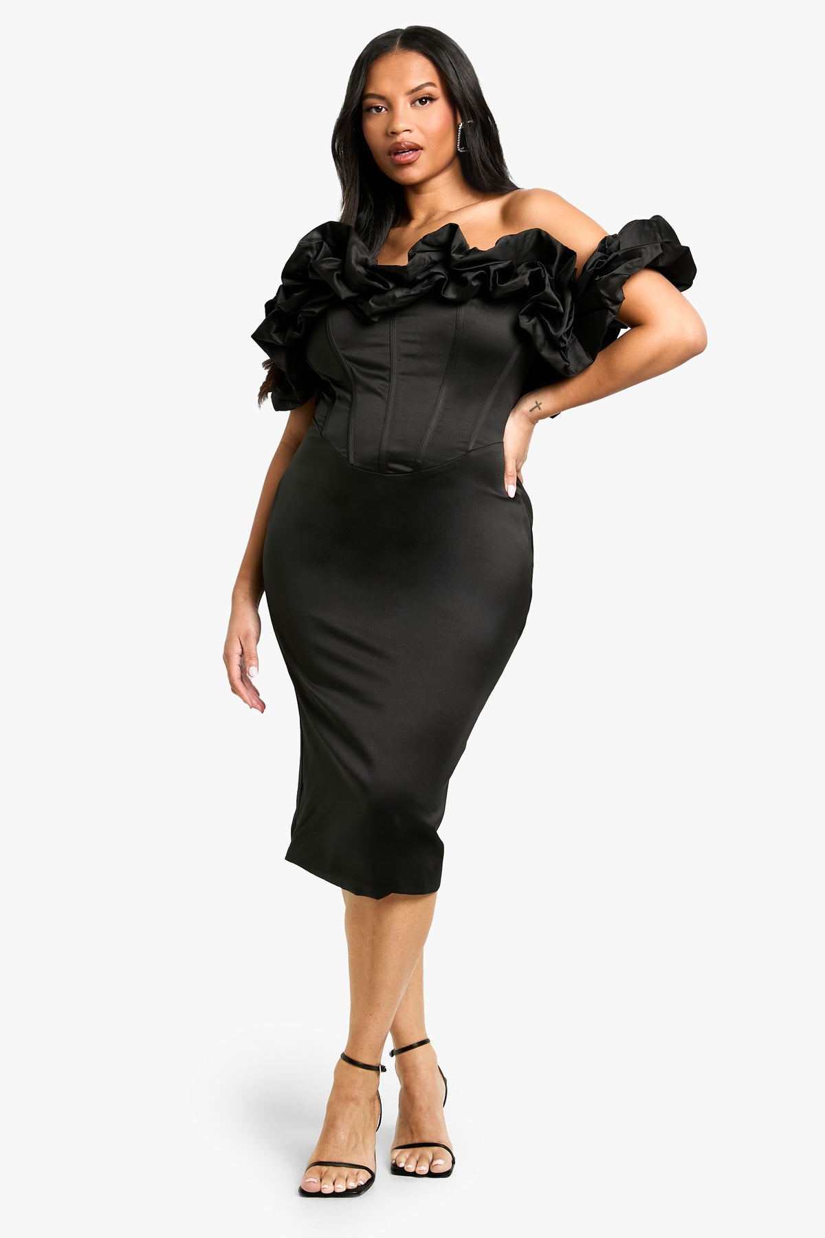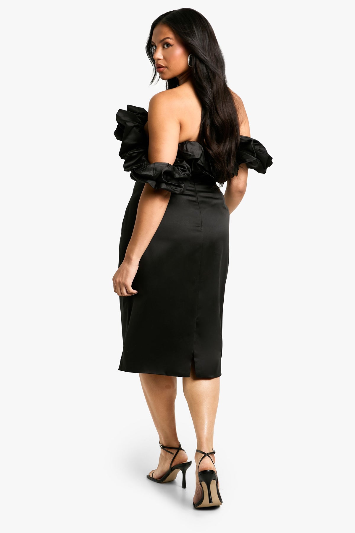 Make a statement at your next festive celebration with this show-stopping midi dress. The off-shoulder neckline adorned with dramatic ruffles creates a bold and feminine look, perfect for those who want to turn heads. The form-fitting silhouette hugs your curves in all the right places, while the satin fabric adds a touch of glamour with its subtle sheen. Pair with strappy heels and statement earrings for a Christmas party ensemble that's sure to impress. For a more relaxed Christmas Day outfit, throw on a cosy cardigan and swap the heels for elegant flats. This versatile piece can be dressed up or down, making it a valuable addition to your holiday wardrobe. The midi length offers sophistication, while the back slit ensures you can move and dance with ease throughout the night.Discover Plus Volume Off The Shoulder Midi Dress available to buy online at us.boohoo.com. Available with quick delivery and easy return options. Shop now!Discover Plus Volume Off The Shoulder Midi Dress available to buy online at us.boohoo.com. Available with quick delivery and easy return options. Shop now!