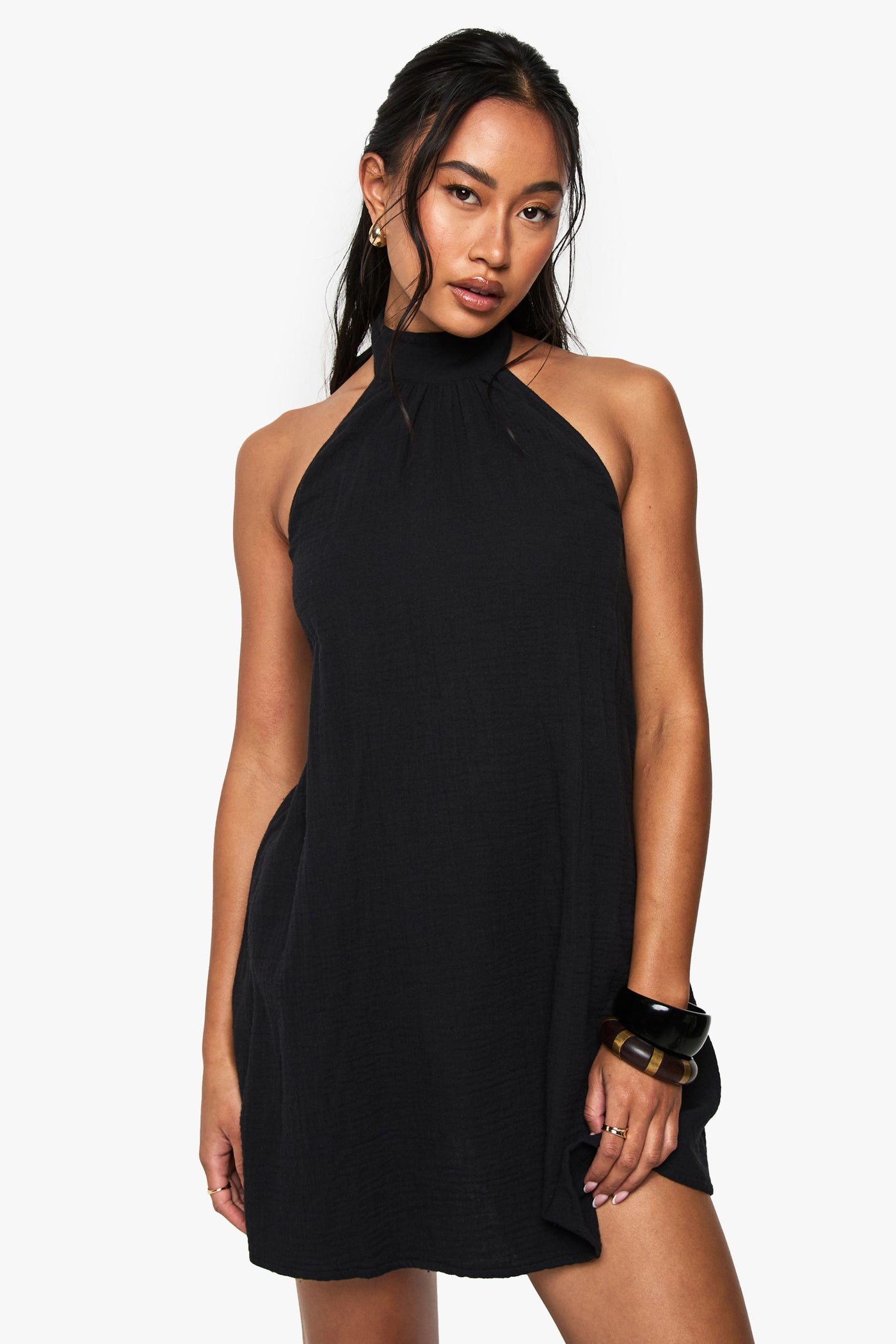 This versatile neckholder minidress from Boohoo combines casual comfort with head-turning style. The breezy cheesecloth fabric drapes beautifully over your figure, while the high neckline and open back create an intriguing contrast that draws the eye. Style with oversized sunglasses and statement accessories as shown for daytime social gatherings, or dress up with layered bracelets and a printed clutch bag for evening drinks. The simple silhouette works brilliantly with trainers for a relaxed weekend look, or pair with ankle boots and a denim jacket when temperatures drop. This fuss-free dress transitions seamlessly from family barbecues to casual coffee dates, making it an essential addition to your wardrobe that delivers both comfort and style without trying too hard.Discover Cheesecloth Halterneck Mini Dress available to buy online at us.boohoo.com. Available with quick delivery and easy return options. Shop now!Discover Cheesecloth Halterneck Mini Dress available to buy online at us.boohoo.com. Available with quick delivery and easy return options. Shop now!