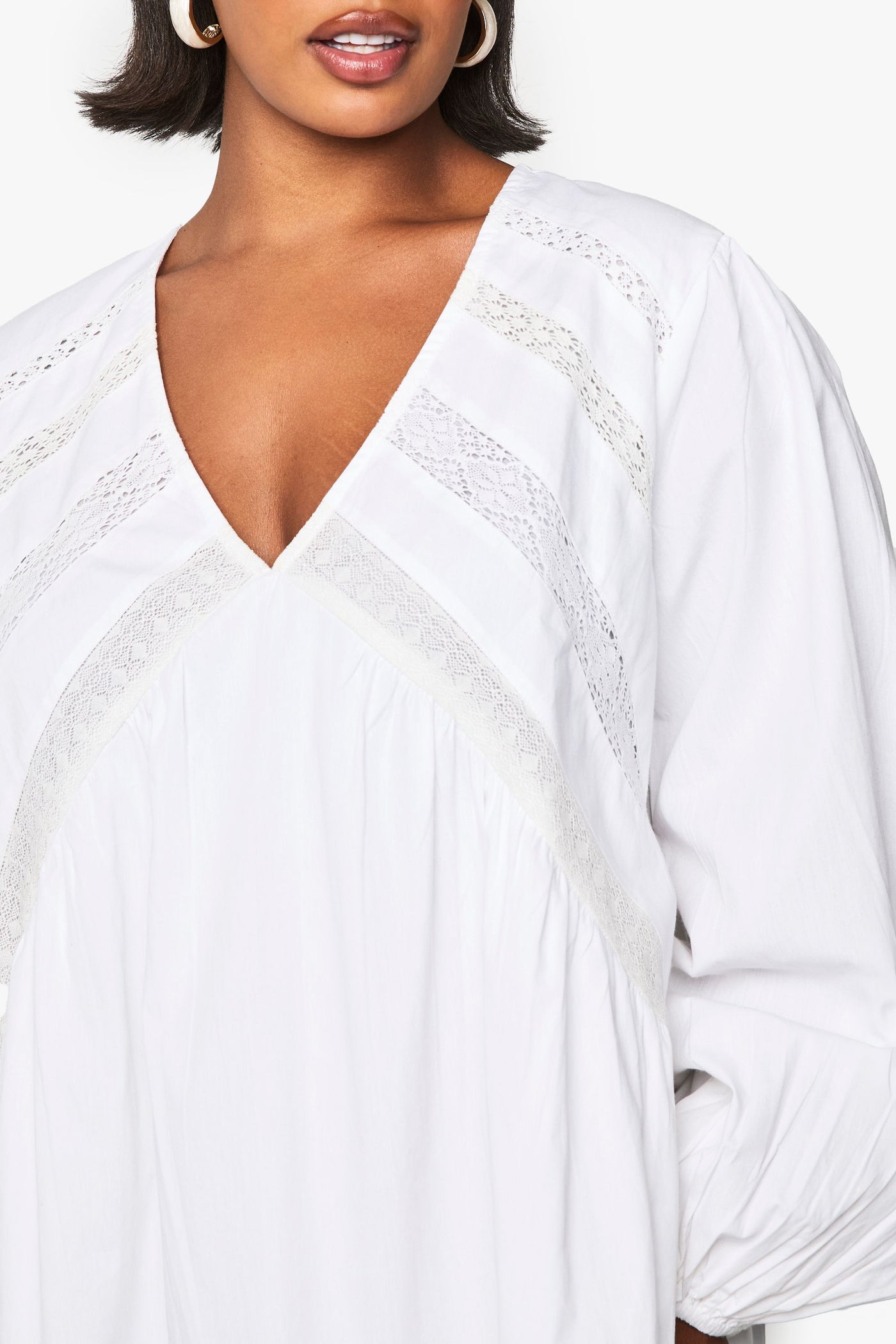 Elegant crochet detailing across the bodice creates a distinctive textural contrast