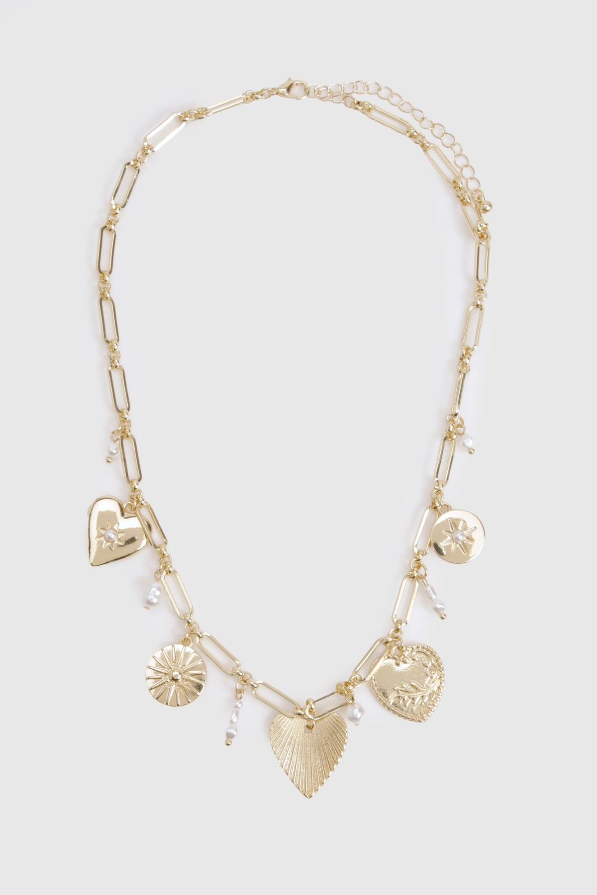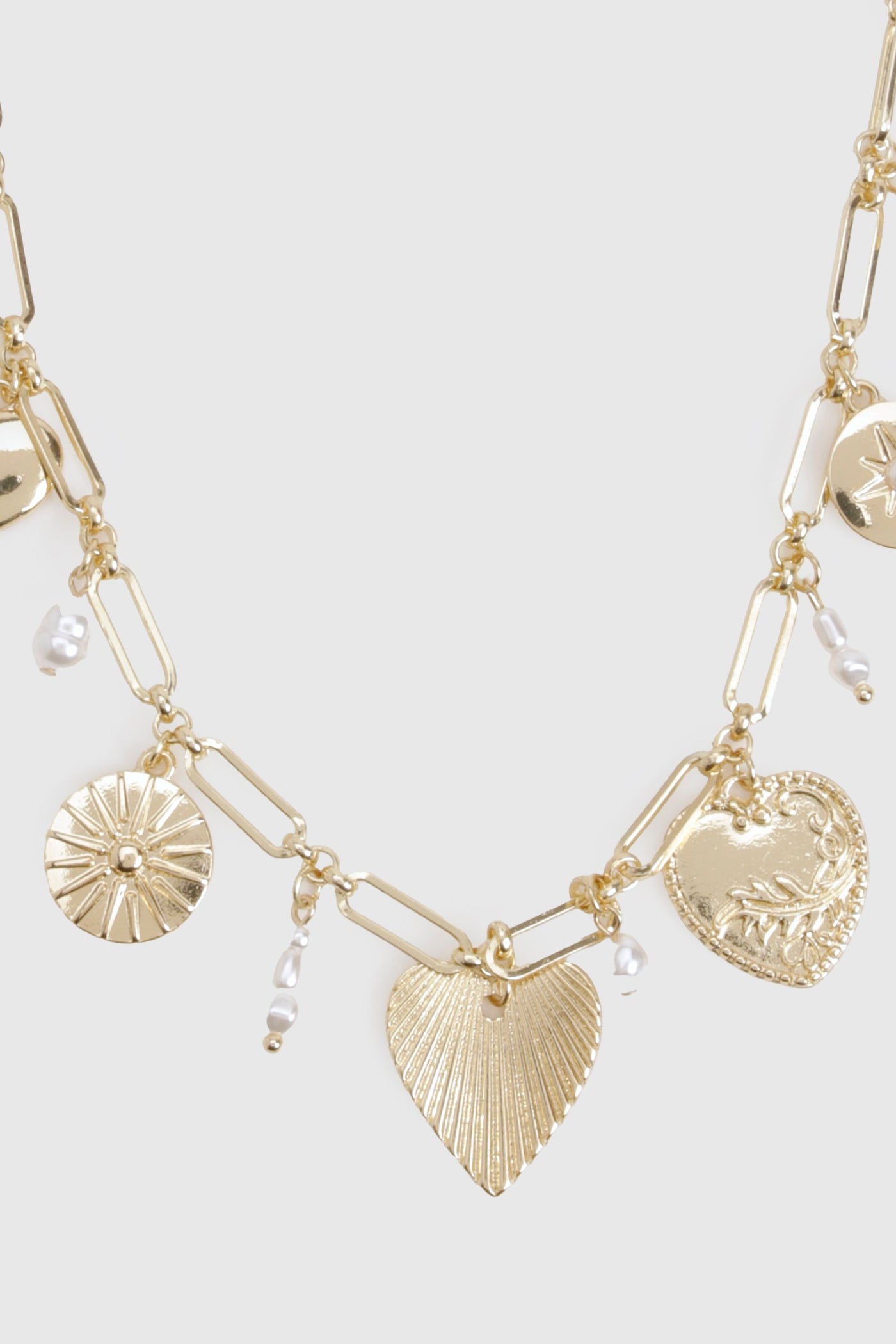 Make a stylish statement with this charming pearl and pendant necklace that combines vintage-inspired elements with contemporary flair. The delicate pearl accents contrast beautifully with the textured metal charms, creating a piece that draws attention without overwhelming your look. Perfect for casual daytime styling with a simple white tee and jeans, or pair with a floaty blouse for family gatherings and brunches with friends. The chain link design offers a modern twist on classic jewellery, whilst the mix of heart and decorative coin pendants adds character and charm. This versatile accessory works brilliantly layered with shorter necklaces for a curated look or worn alone as a focal point. The adjustable length ensures comfort throughout the day, making this necklace a practical yet stylish addition to your jewellery collection that will complement countless outfits in your wardrobe.Discover Pearl & Charm Statement Necklace available to buy online at us.boohoo.com. Available with quick delivery and easy return options. Shop now!Discover Pearl & Charm Statement Necklace available to buy online at us.boohoo.com. Available with quick delivery and easy return options. Shop now!