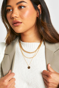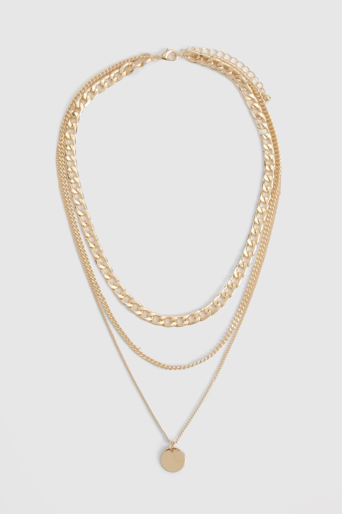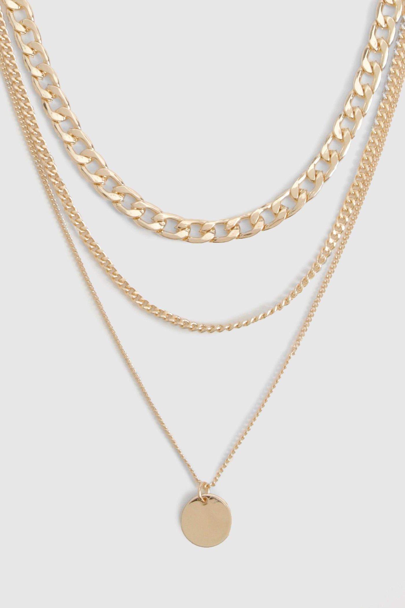 This multilayer necklace is the perfect accessory to add a touch of sophistication to your ensemble. The three-tiered design features chains of varying thickness, creating a visually captivating effect that draws the eye. The polished disc charm, dangling from the longest chain, adds a subtle yet striking focal point. Whether you're dressing up for a casual brunch with friends or heading to a family gathering, this necklace effortlessly enhances your look. Style it with a crisp white shirt and blazer for a smart-casual vibe, or pair it with a flowing maxi dress for a more bohemian feel. The versatile length allows you to wear it with various necklines, from crew necks to V-necks, making it a go-to piece for multiple outfits. This Boohoo necklace is ideal for the fashion-forward woman who appreciates adaptable accessories that can transition seamlessly from day to night.Discover Polished Disc Drop Charm Multilayer Necklace available to buy online at us.boohoo.com. Available with quick delivery and easy return options. Shop now!Discover Polished Disc Drop Charm Multilayer Necklace available to buy online at us.boohoo.com. Available with quick delivery and easy return options. Shop now!