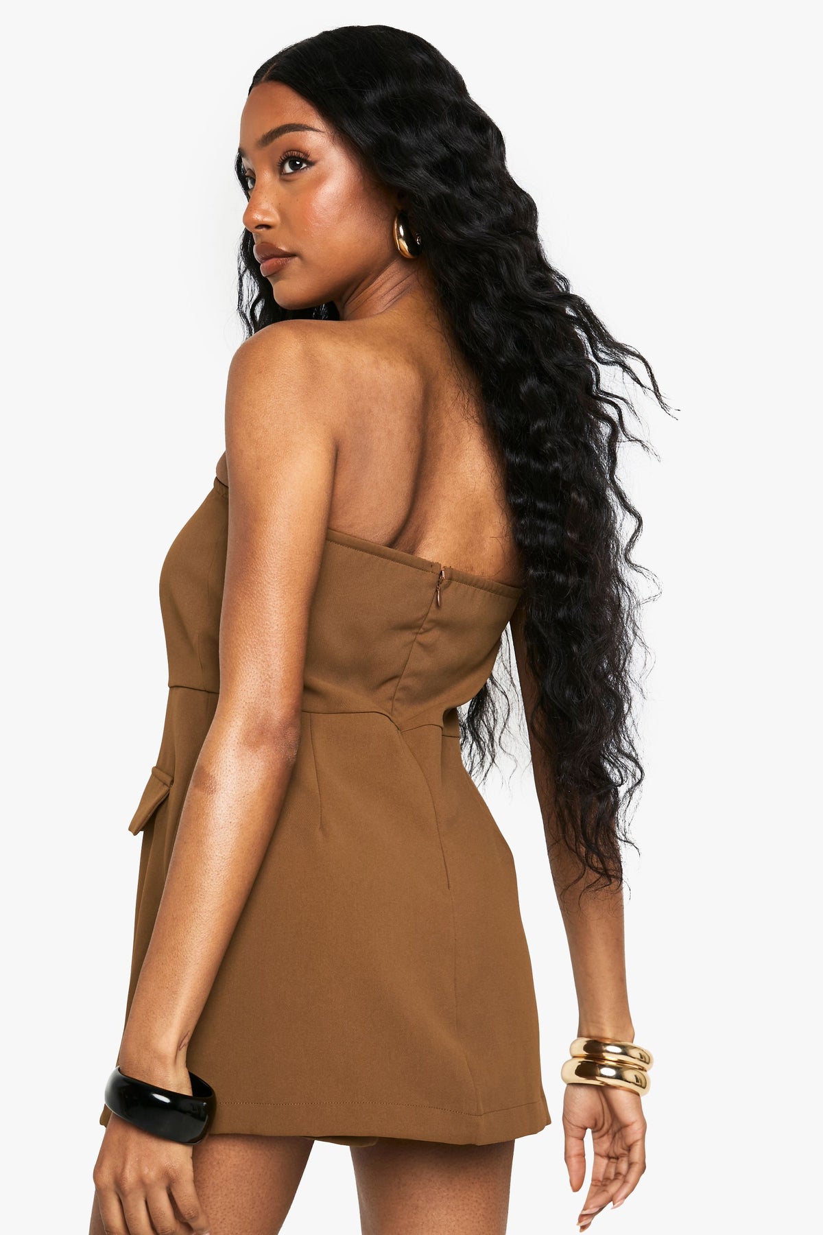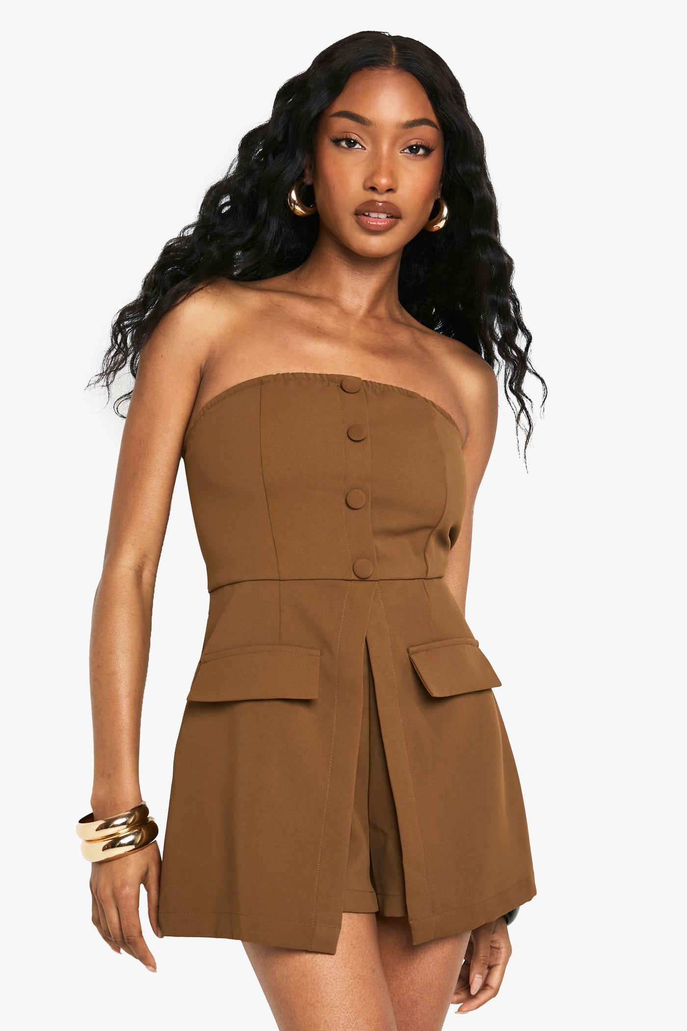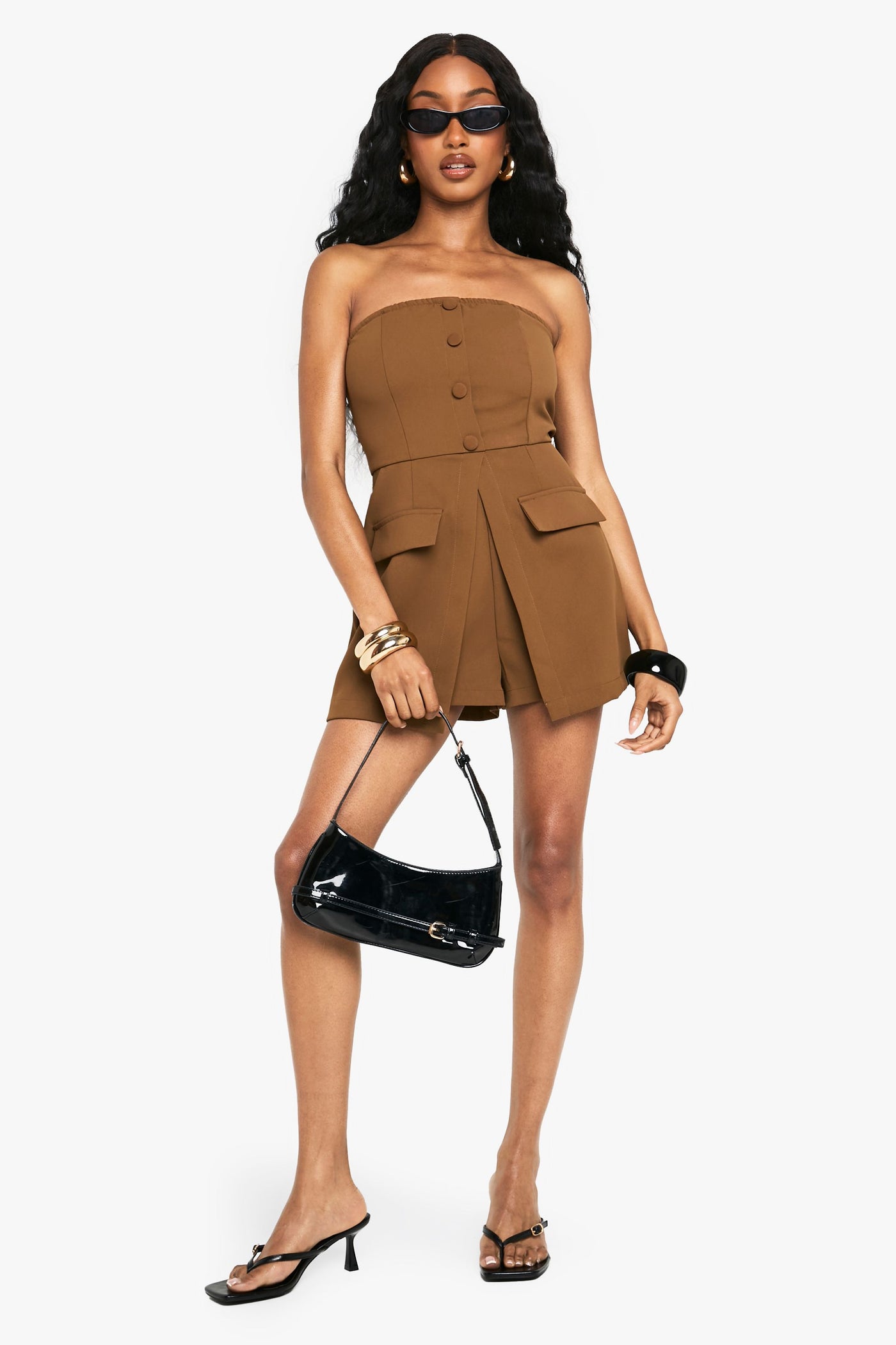 Make a statement in this eye-catching bandeau playsuit, perfect for those nights out when you want to turn heads. The button-front detail and fitted waist create a flattering silhouette that's both trendy and timeless. Pair it with strappy heels and statement earrings for a night at the club, or dress it down with trainers and a denim jacket for casual drinks with friends. The crepe fabric offers a comfortable fit that moves with you, whether you're dancing the night away or enjoying cocktails at a rooftop bar. For a coordinated look, add a clutch bag and style your hair in a sleek updo to showcase the chic bandeau neckline. This playsuit is a versatile piece that can easily transition from day to night, making it a must-have addition to your going-out wardrobe.Discover Bandeau Button Detail Playsuit available to buy online at us.boohoo.com. Available with quick delivery and easy return options. Shop now!Discover Bandeau Button Detail Playsuit available to buy online at us.boohoo.com. Available with quick delivery and easy return options. Shop now!