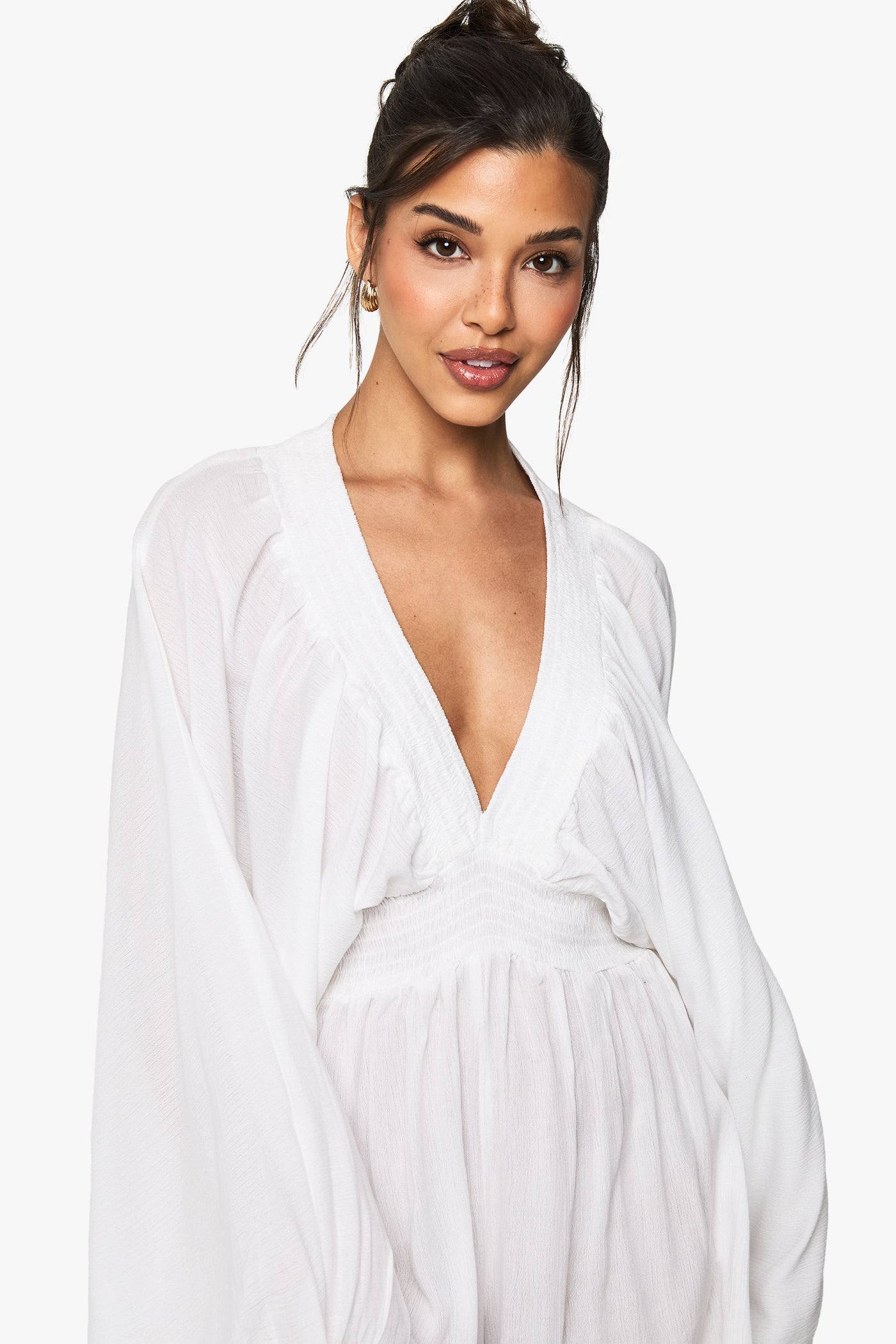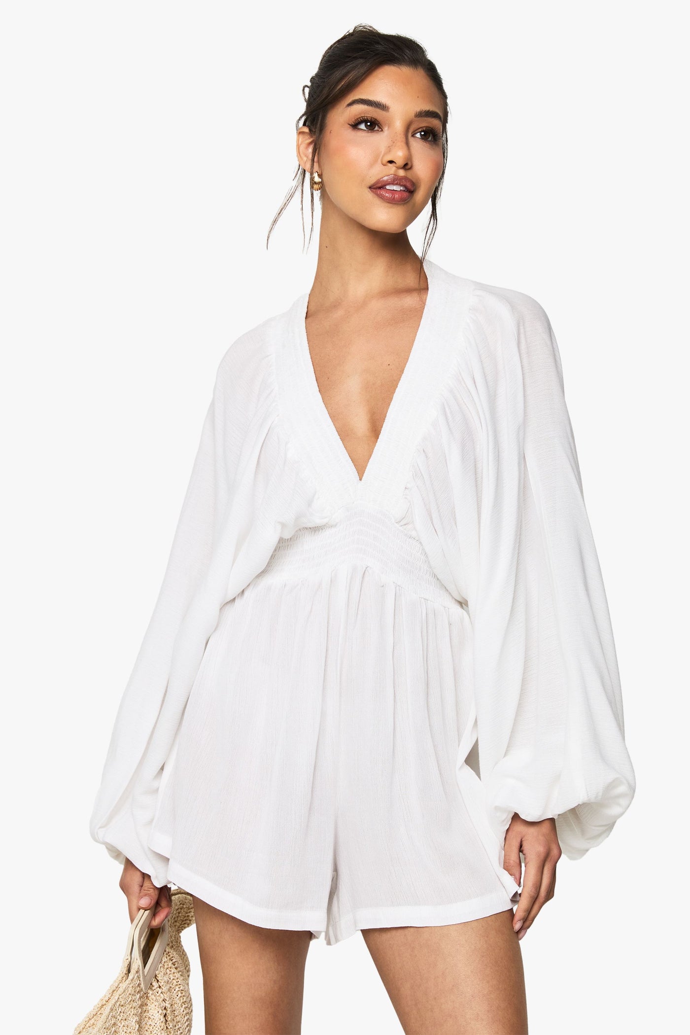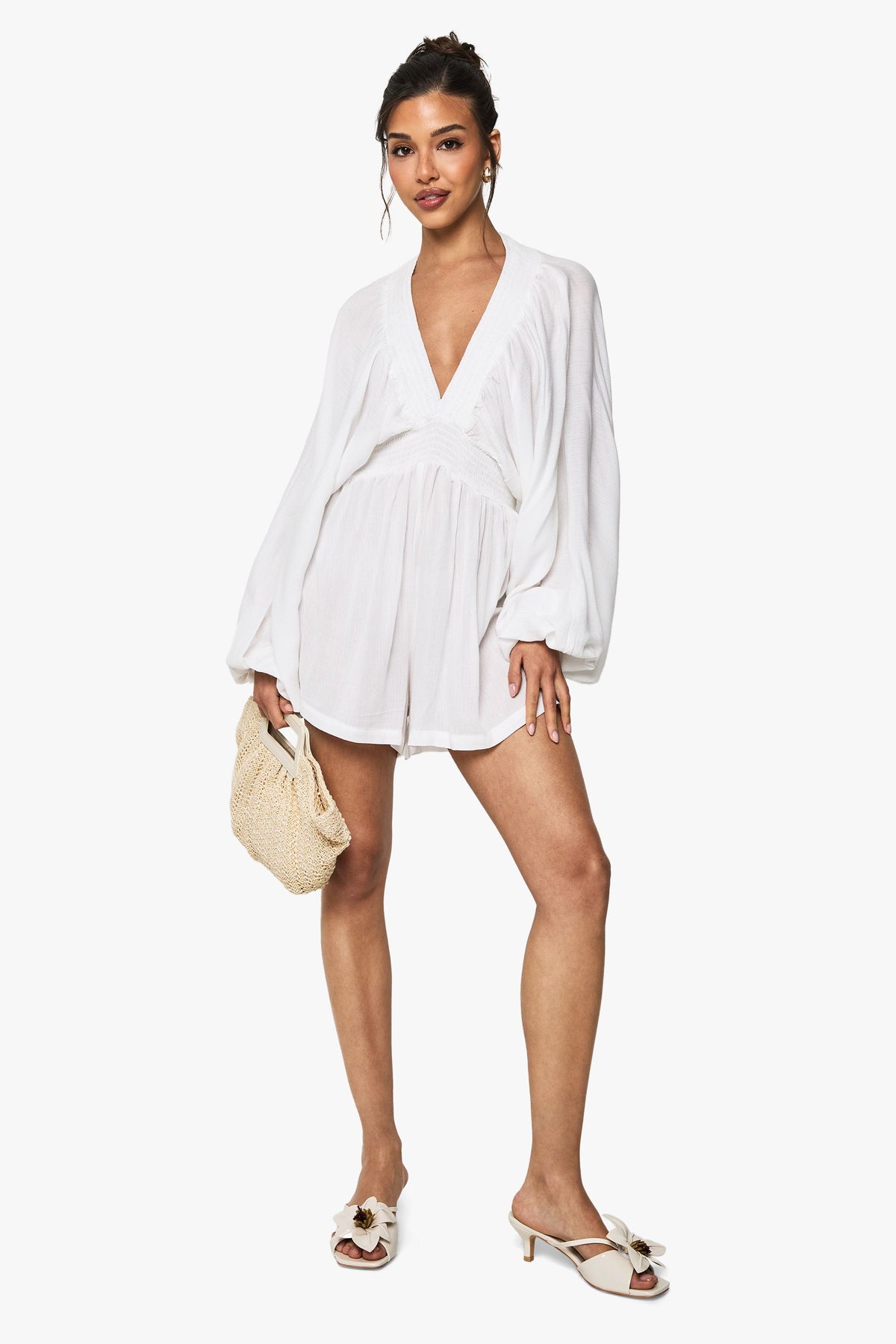 This effortlessly chic playsuit from Boohoo combines comfort with head-turning style. The lightweight cheesecloth fabric drapes beautifully across the body, while the plunging neckline creates a bold focal point that's perfect for warm-weather socialising. The billowing long sleeves add drama to this casual piece, balancing the shorter length of the playsuit. Style with strappy sandals and a woven clutch as seen on our model for daytime gatherings, or dress up with metallic accessories and statement earrings for sunset drinks. The versatile design works brilliantly for family barbecues, beach outings or casual coffee dates. For cooler evenings, layer with a denim jacket and switch to ankle boots for an outfit that transitions seamlessly from day to night. Machine washable and easy to care for, this playsuit will quickly become your go-to for effortless summer style.Discover Cheescloth Plunge Long Sleeve Playsuit available to buy online at us.boohoo.com. Available with quick delivery and easy return options. Shop now!Discover Cheescloth Plunge Long Sleeve Playsuit available to buy online at us.boohoo.com. Available with quick delivery and easy return options. Shop now!
