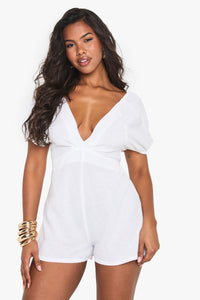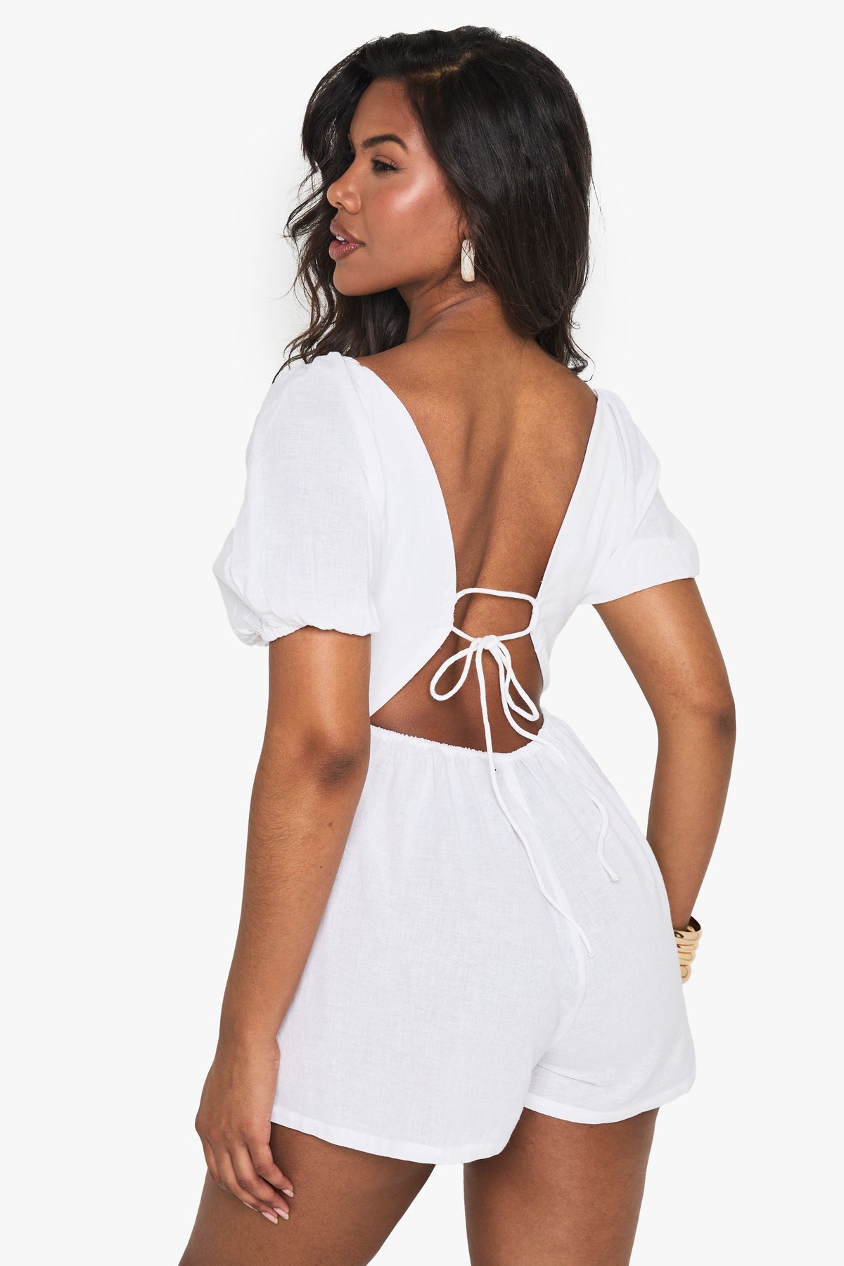 This linen mix playsuit from Boohoo combines comfort with effortless style for your casual wardrobe. The puff sleeves add a touch of romance while the V-neckline creates a flattering frame. The open back with tie detail offers a subtle glimpse of skin, perfect for sunny days out. Style with minimal jewellery as seen on our model - think statement earrings and a simple bracelet - and pair with flat sandals for daytime gatherings or family brunches. For a more polished look, add espadrille wedges and a woven clutch. The versatile design works brilliantly for garden parties, seaside holidays or casual weekend outings when you want to look put-together without trying too hard.Discover Linen Tie Back Puff Sleeve Playsuit available to buy online at us.boohoo.com. Available with quick delivery and easy return options. Shop now!Discover Linen Tie Back Puff Sleeve Playsuit available to buy online at us.boohoo.com. Available with quick delivery and easy return options. Shop now!