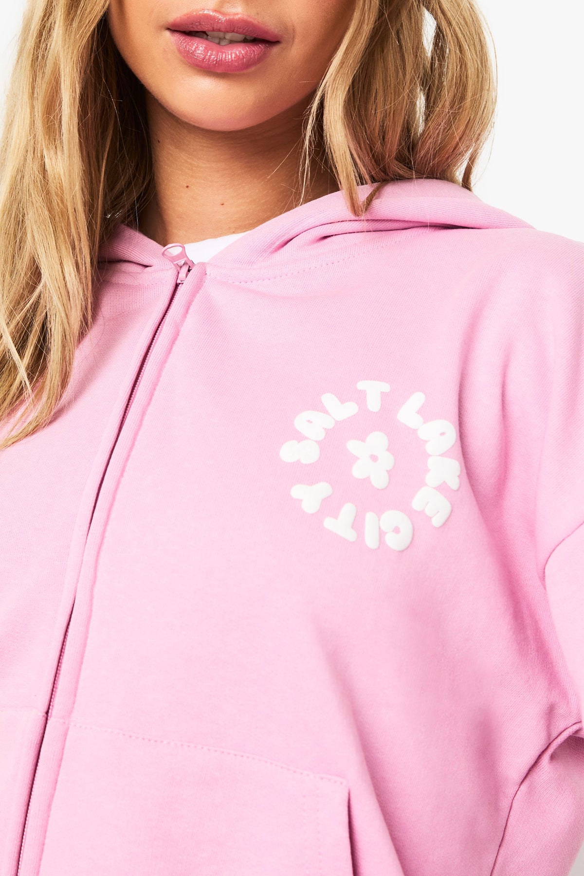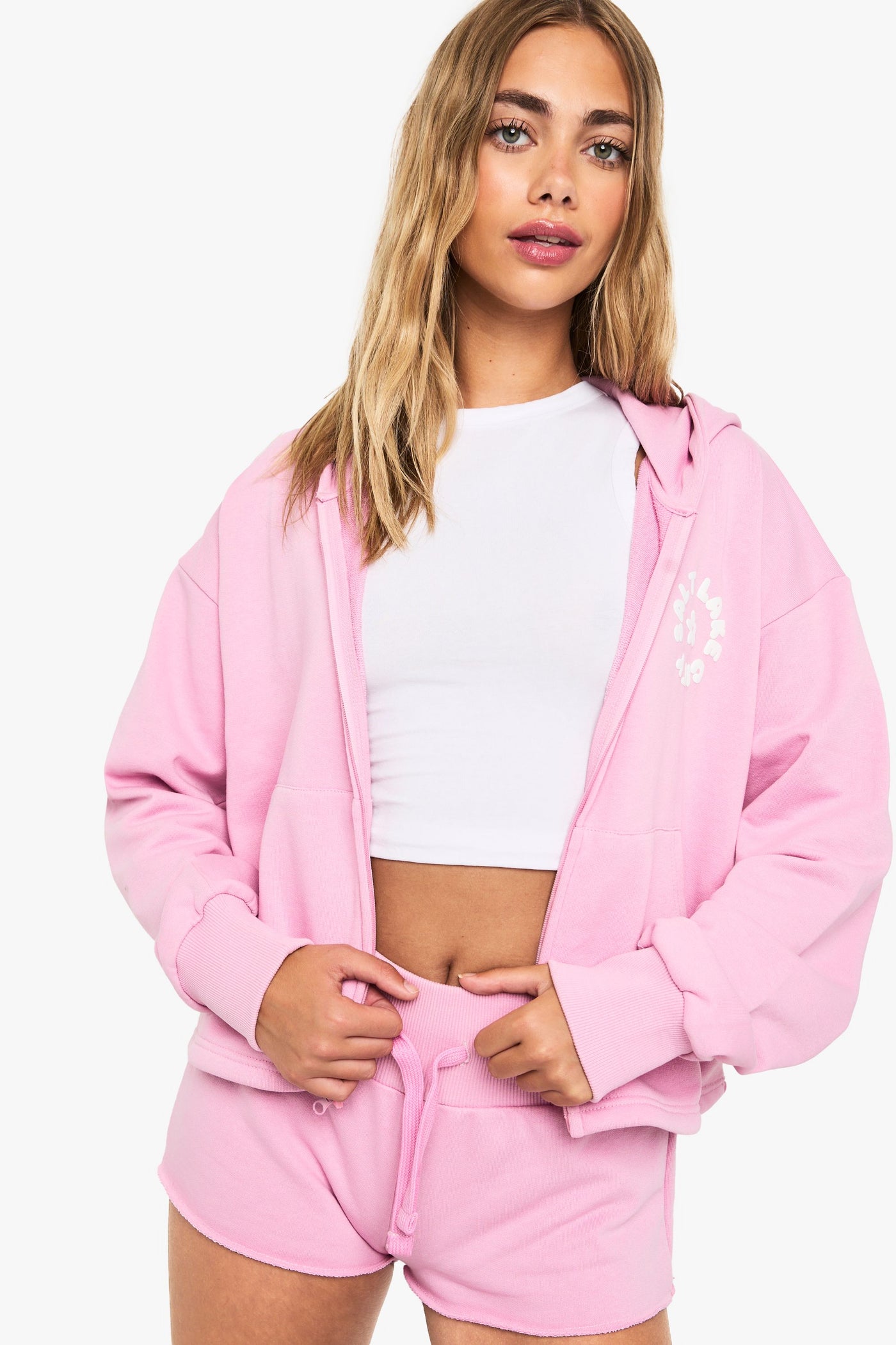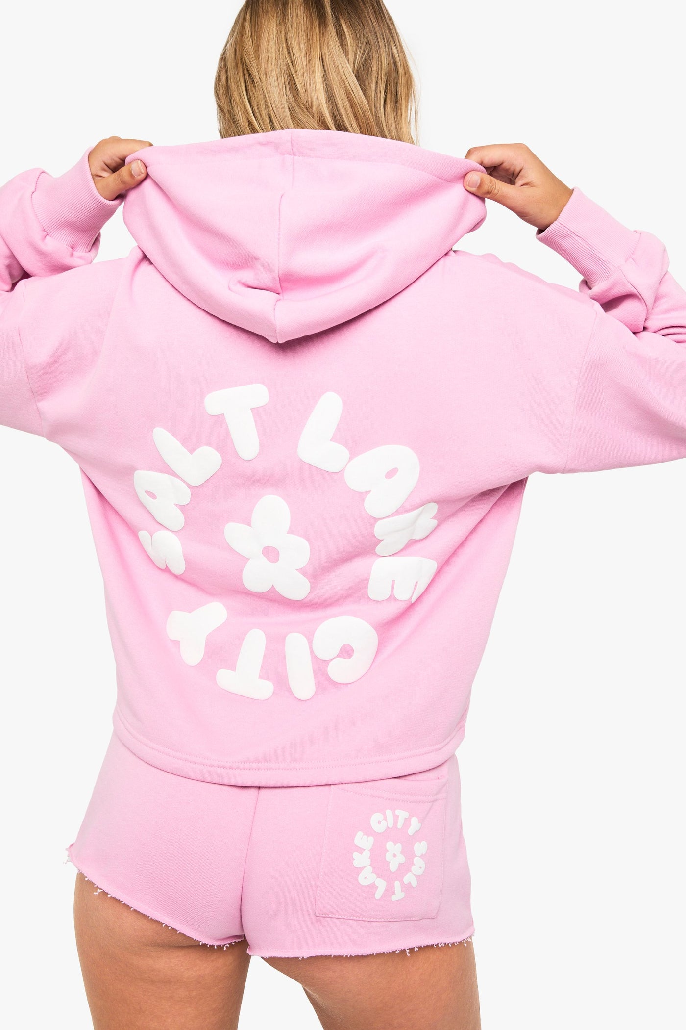 Salt Lake City Puff Print Deep Hem Cropped Hoodie Short Tracksuit