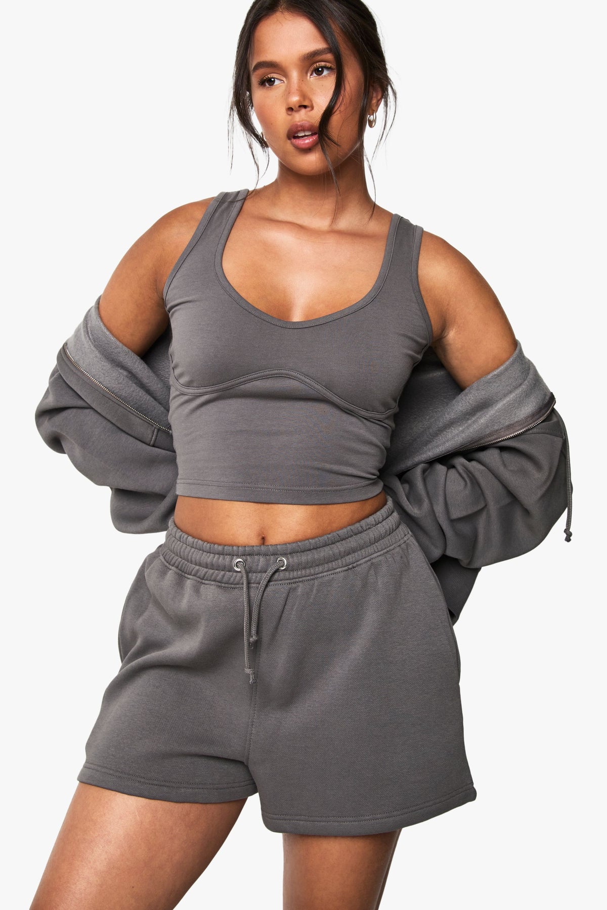 Embrace laid-back chic with this short tracksuit from Boohoo. The cropped hoodie features a practical zip-up front and is paired with coordinating shorts, creating a stylish ensemble that's perfect for casual outings. The fleece-back fabric ensures comfort, while the relaxed fit allows for unrestricted movement. Style this set with trendy trainers and a crossbody bag for a quick coffee run or weekend errands. For a more put-together look, layer the hoodie over a fitted crop top and add some gold-toned jewellery. This versatile tracksuit is ideal for lounging at home, meeting friends for a casual lunch, or even as a cover-up for your gym sessions. Its effortless appeal makes it a must-have addition to your everyday wardrobe, embodying the perfect balance of comfort and on-trend style.Discover Seam Detail 3 Piece Crop Zip Through Short Tracksuit available to buy online at us.boohoo.com. Available with quick delivery and easy return options. Shop now!Discover Seam Detail 3 Piece Crop Zip Through Short Tracksuit available to buy online at us.boohoo.com. Available with quick delivery and easy return options. Shop now!