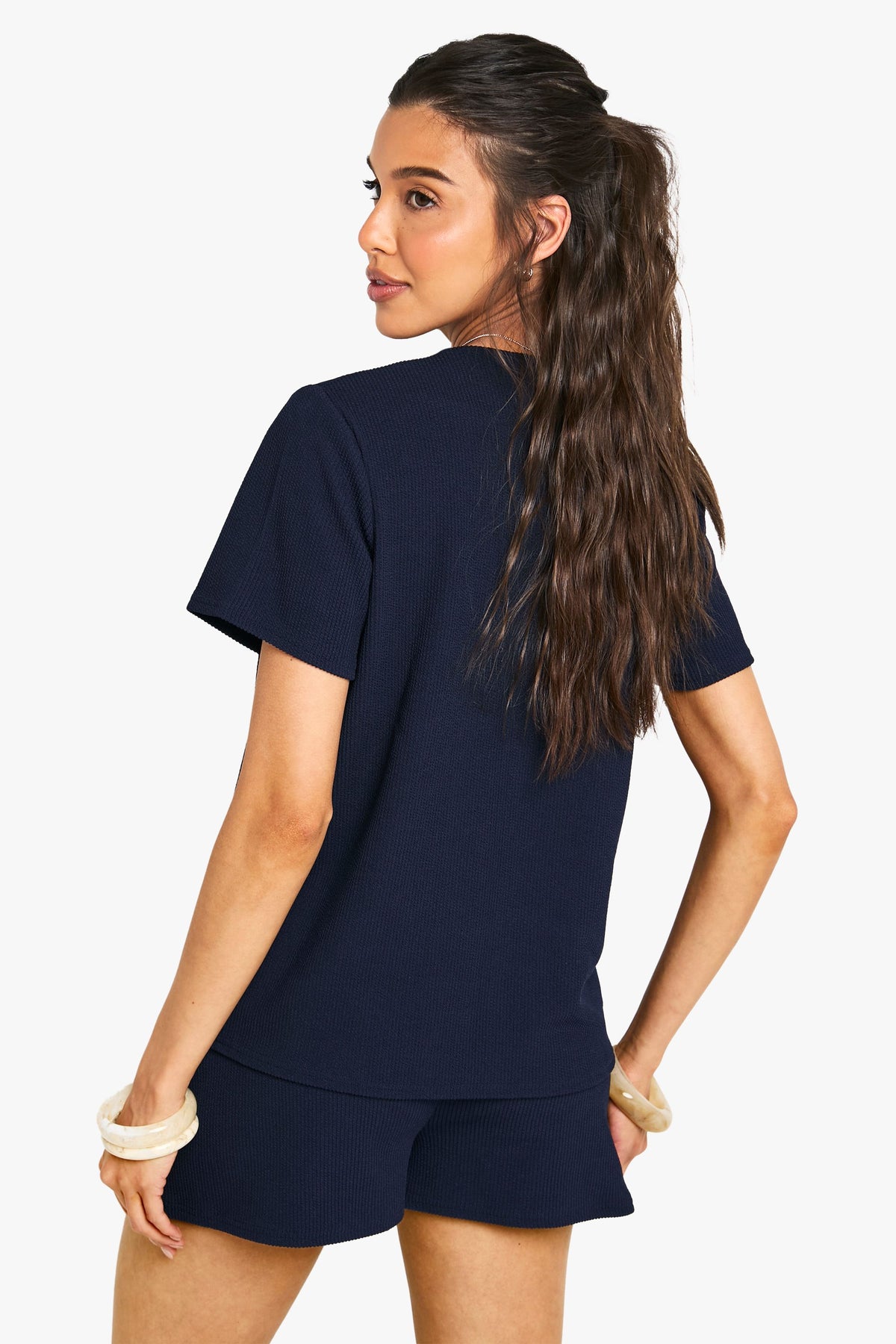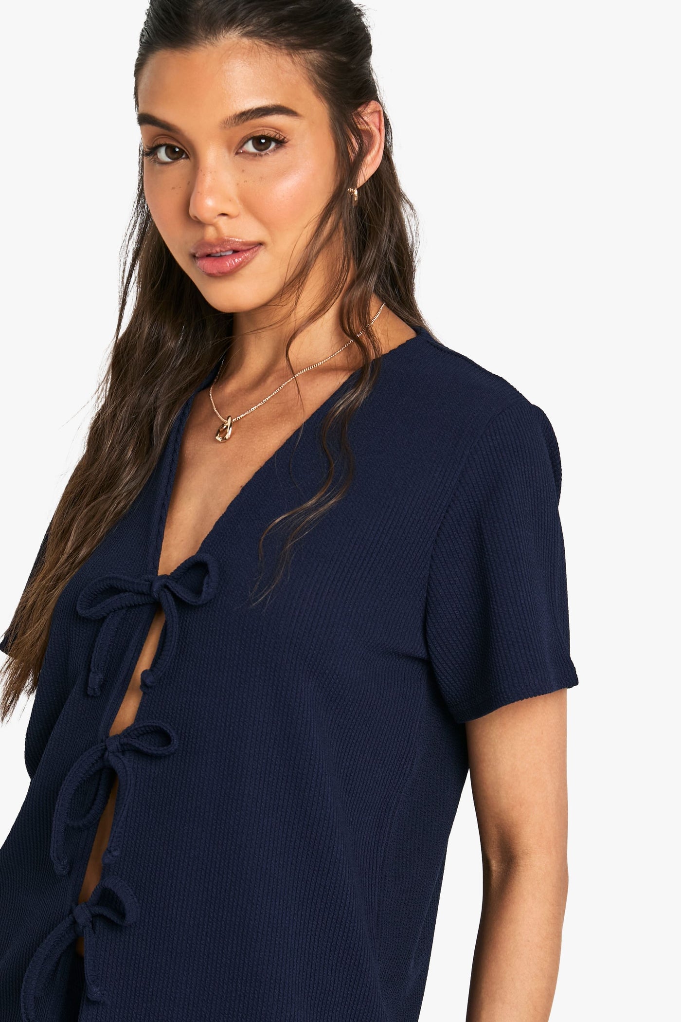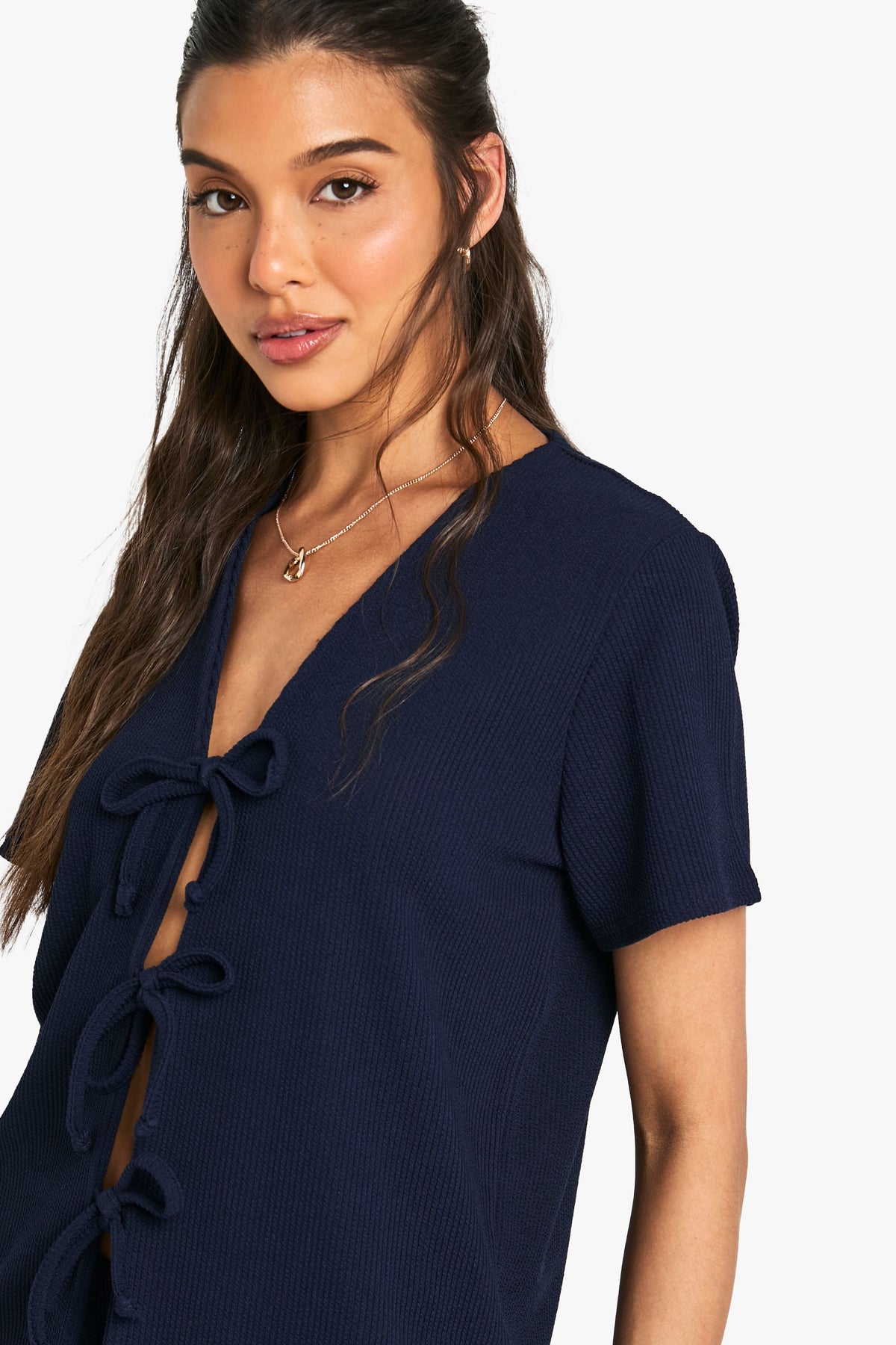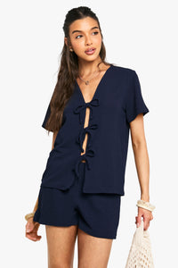 Ribbed texture co-ord set featuring a short sleeve top with stylish tie-front detail
