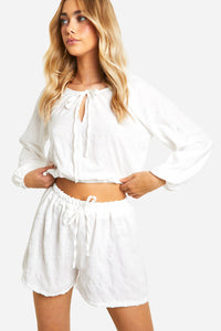 Embrace effortless chic with this textured co-ord set from Boohoo. The crop top boasts a charming tie-front detail, adding a touch of femininity to the ensemble. Paired with matching shorts featuring an elasticated waistband, this set offers both style and comfort. Perfect for casual outings, family gatherings, or lazy weekends, it's a versatile addition to your wardrobe. Style it with white trainers and a denim jacket for a laid-back look, or dress it up with strappy sandals and statement earrings for a summer evening out. The relaxed fit and breathable fabric make it ideal for warm weather, while the separates can be mixed and matched with other pieces in your wardrobe for countless outfit possibilities. Whether you're heading to a beach party or a casual brunch with friends, this co-ord set will keep you looking effortlessly stylish.Discover Textured Tie Front Blouse & Flippy Shorts available to buy online at us.boohoo.com. Available with quick delivery and easy return options. Shop now!Discover Textured Tie Front Blouse & Flippy Shorts available to buy online at us.boohoo.com. Available with quick delivery and easy return options. Shop now!