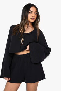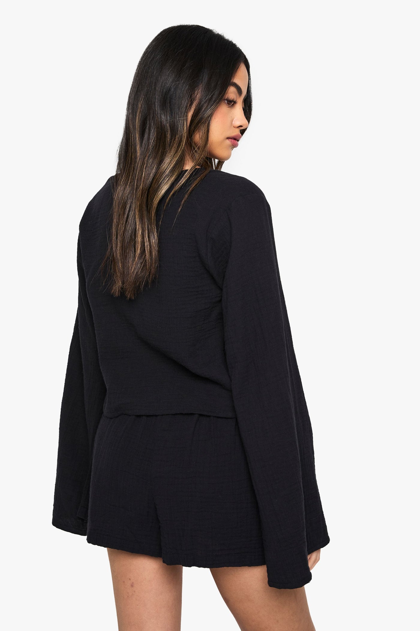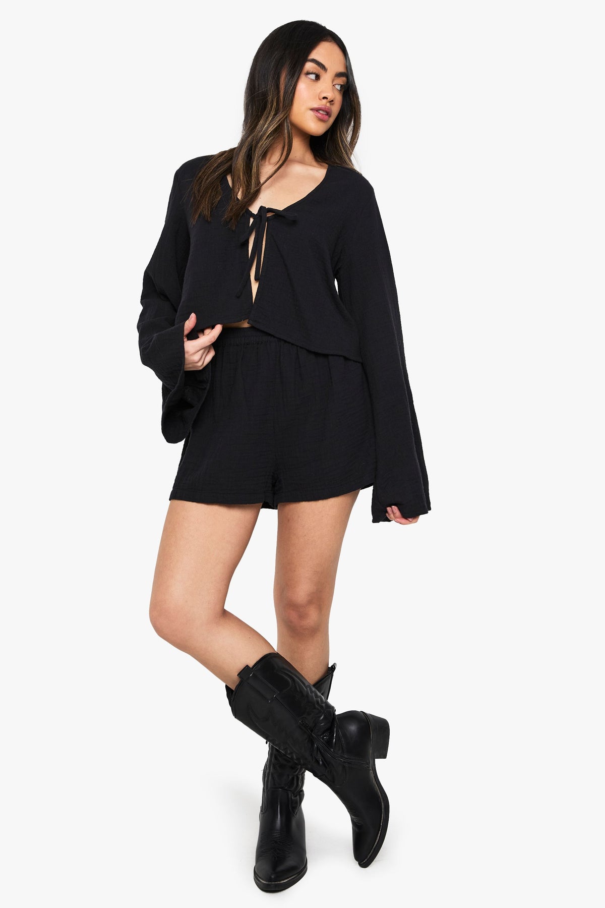 These breezy cheesecloth shorts are the ultimate casual wardrobe essential for the fashion-forward woman. The elasticated waistband ensures a comfortable fit that moves with you throughout the day, while the relaxed silhouette offers that coveted laid-back vibe. Style them as seen with a matching cropped top and statement bell sleeves for a coordinated set that's perfect for summer festivals or beach holidays. For everyday wear, pair with a simple vest top and trainers for running errands, or dress them up with a bodysuit and chunky boots for casual meet-ups with mates. The versatile design works brilliantly for family gatherings or weekend brunches - simply add a lightweight cardigan when the temperature drops. These shorts embody Boohoo's commitment to inclusive, trend-led fashion that doesn't compromise on comfort or style.Discover Cheesecloth Elasticated Waist Shorts available to buy online at us.boohoo.com. Available with quick delivery and easy return options. Shop now!Discover Cheesecloth Elasticated Waist Shorts available to buy online at us.boohoo.com. Available with quick delivery and easy return options. Shop now!